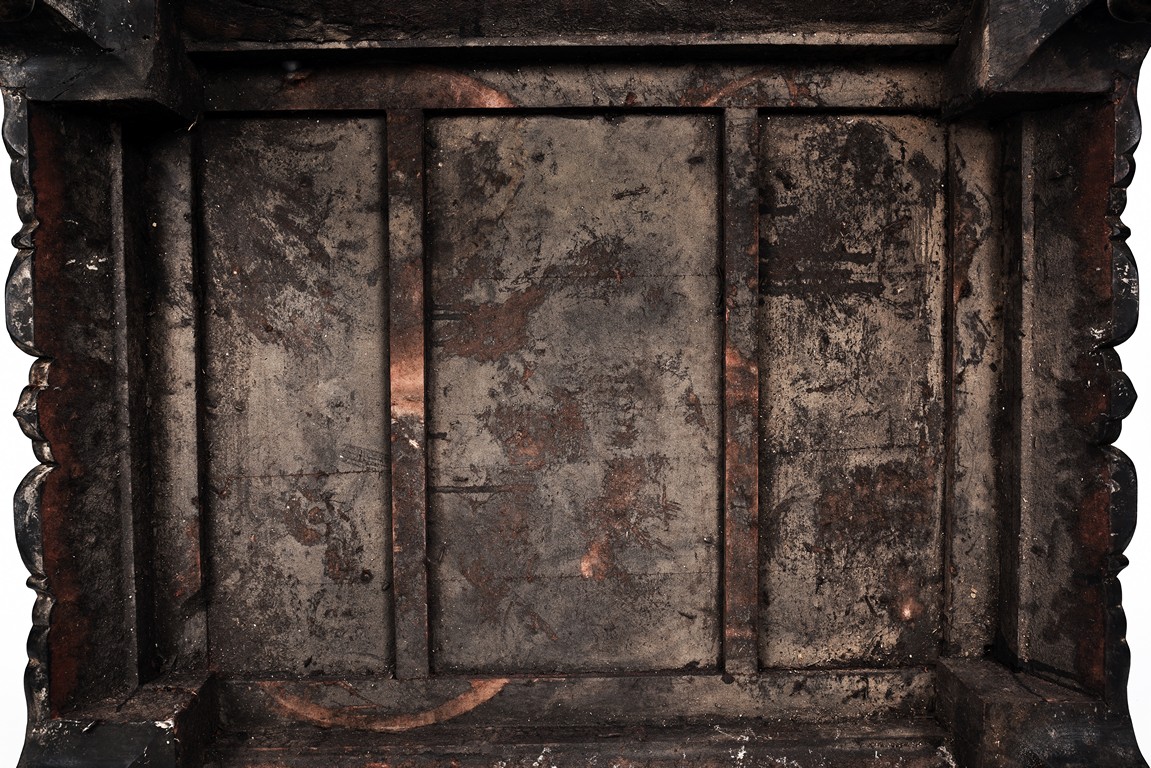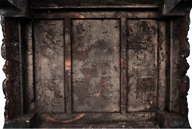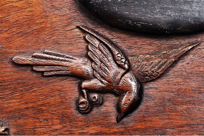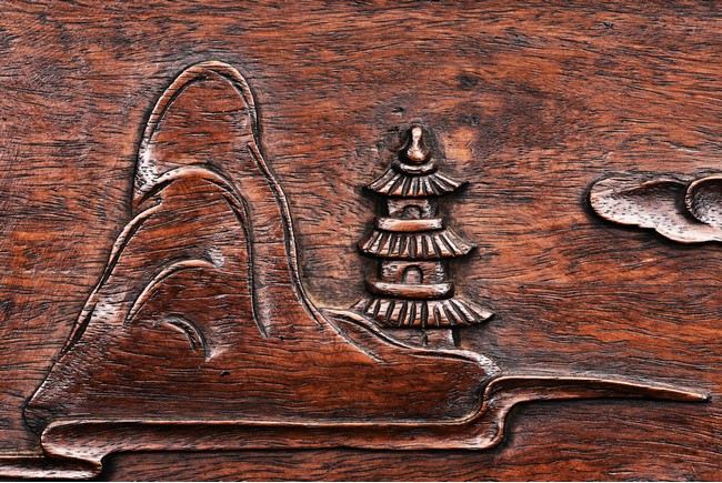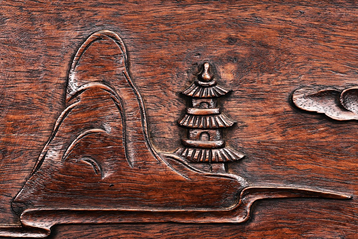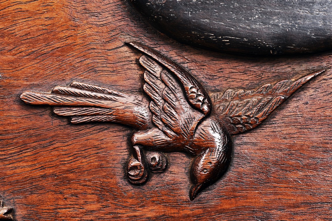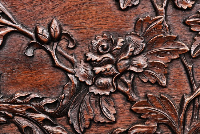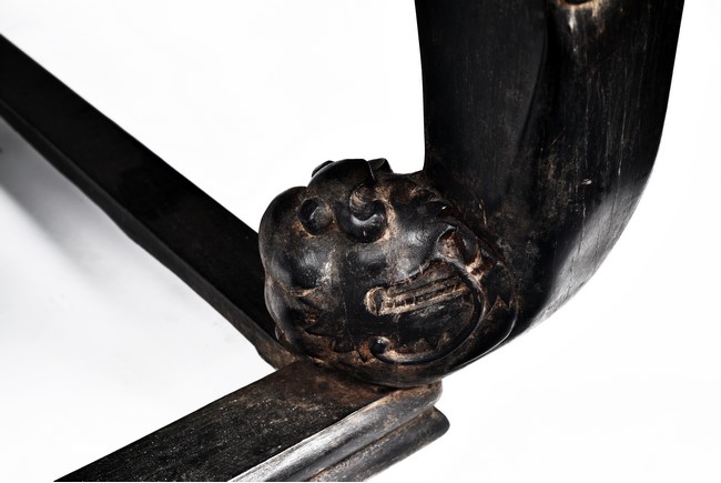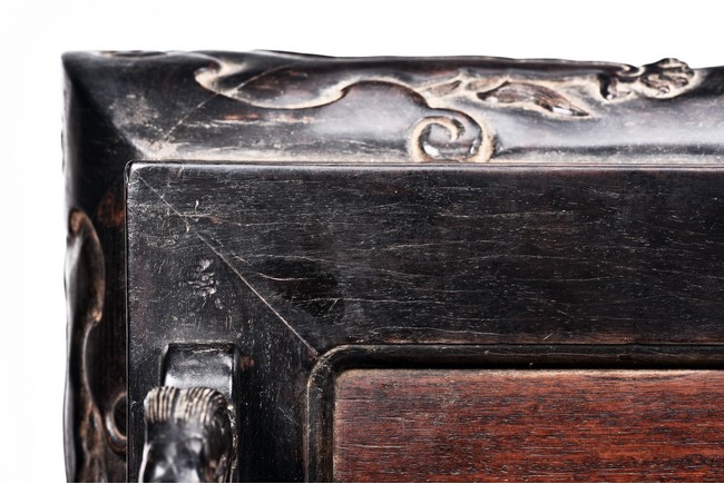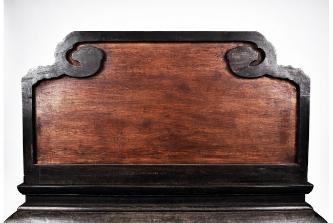The throne is constructed of a rectangular seat framed with ice-plate edge supporteding peripheral panel screens, finely carved in relief with scene of birds and flowers on both sides, the chair back comprising a single panel finely carved with scene of birds paying homage to phoenix, all set above recessed waist supported on ruyi head and buddhist lion decorated apron, the powerful legs curved inwards as heads of lions, each rested on a floor stretcher. Qing Dynasty period.