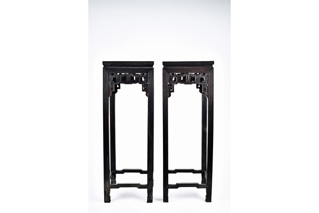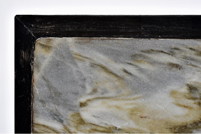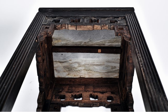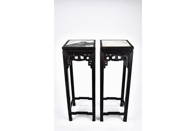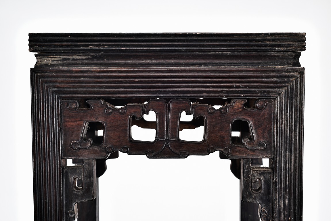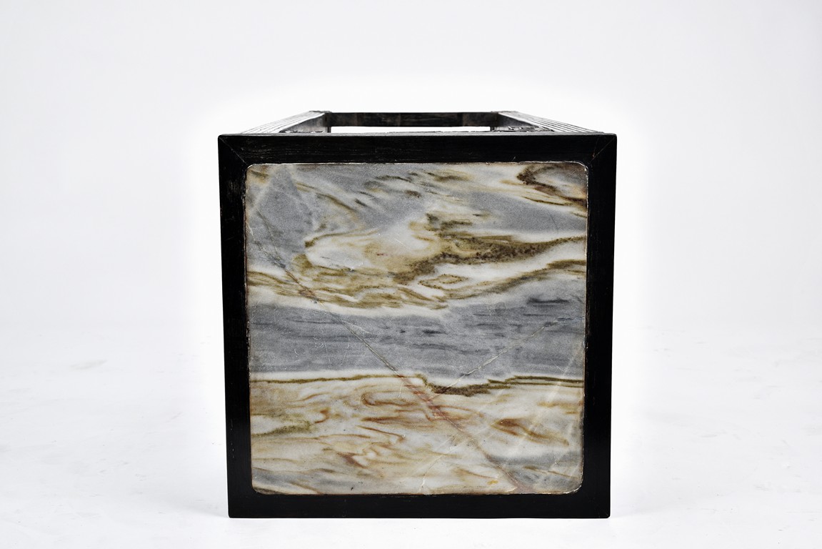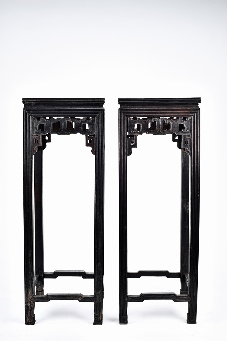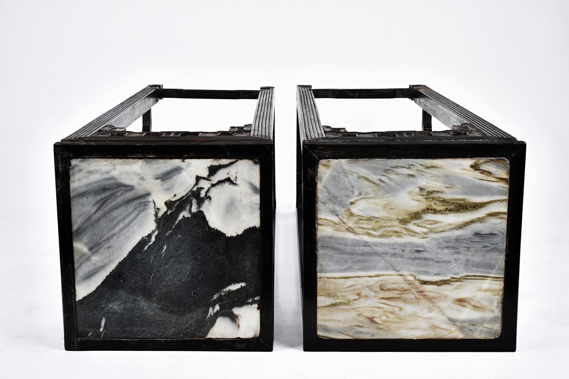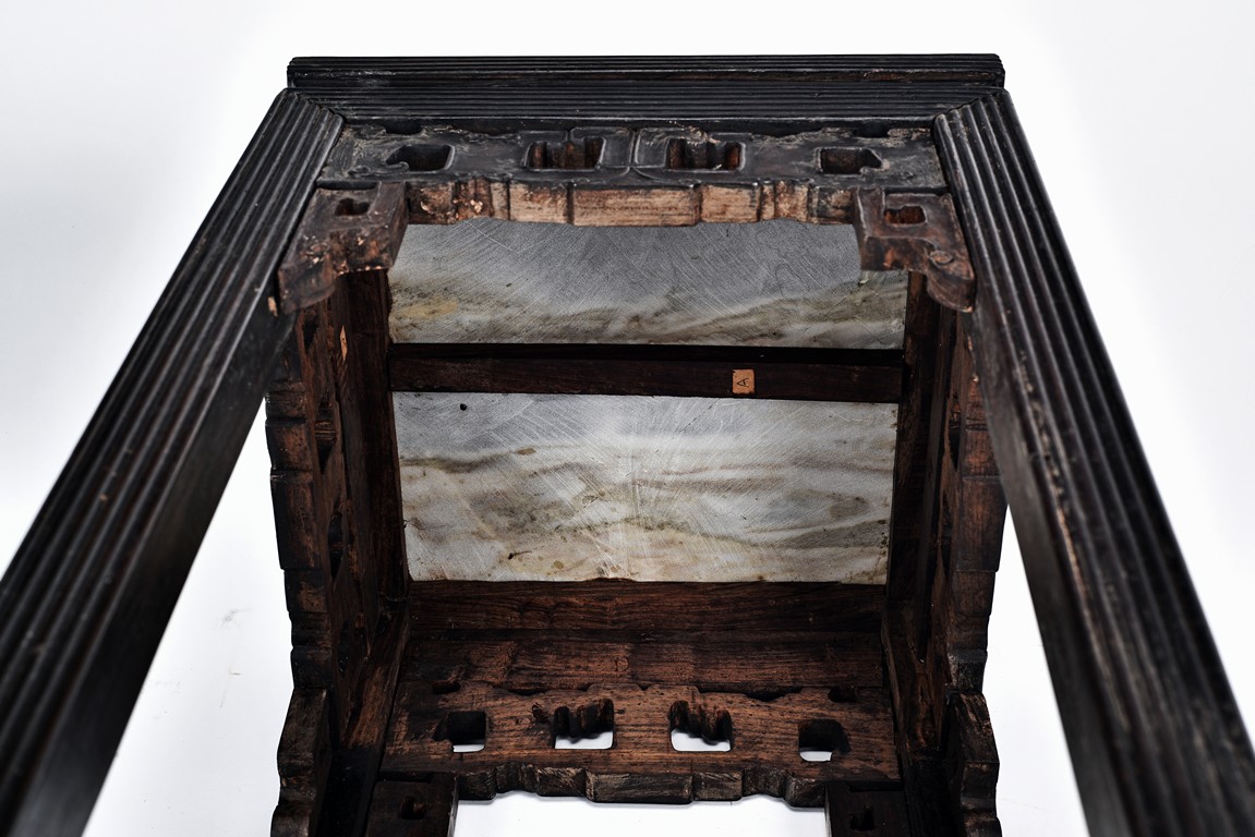 Each square top inset with 'cloud stone' marble with fine black,white, and russet striations, above recessed waist and openwork apron of archaistic scroll, further supported by four slender legs, each linked by straight stretchers. Republic period.