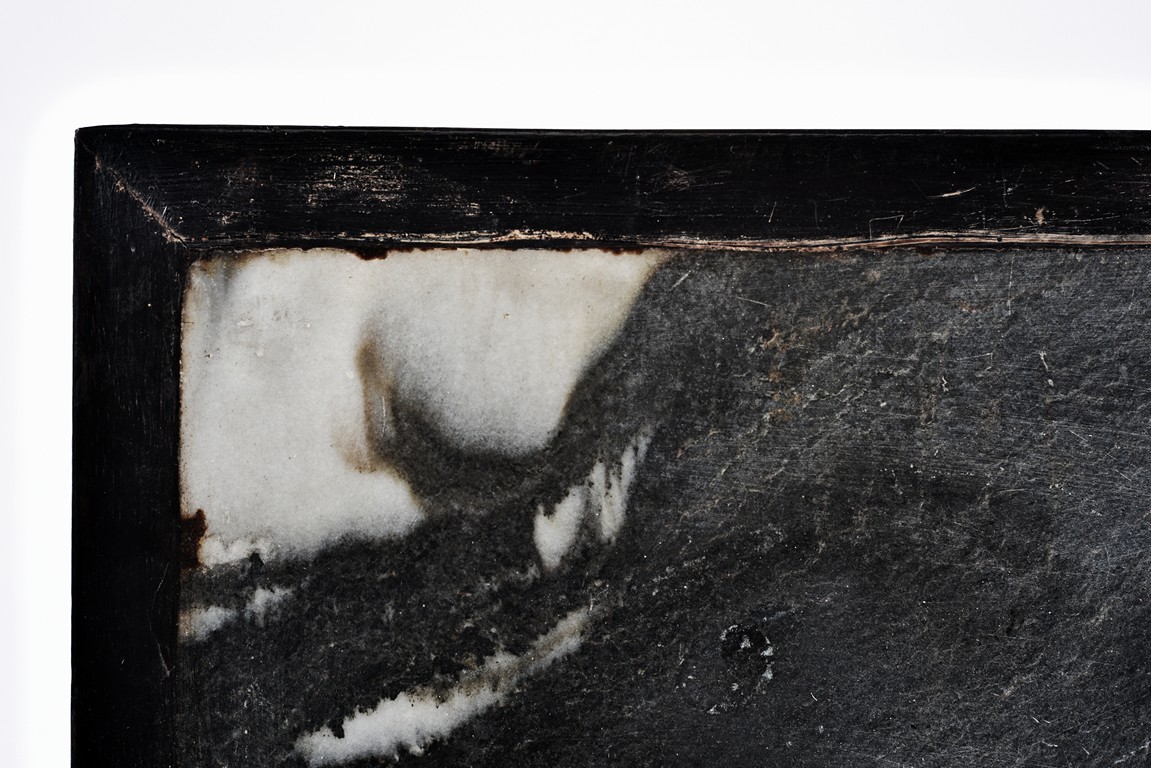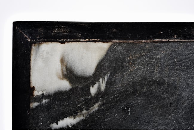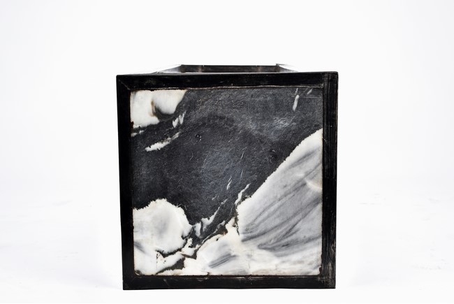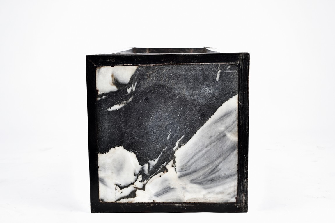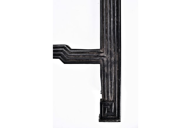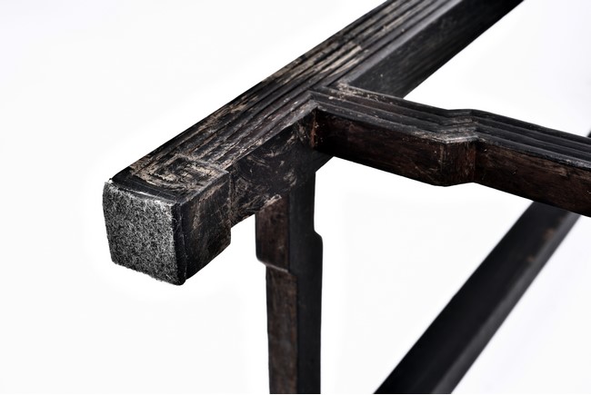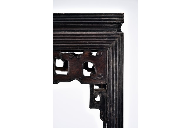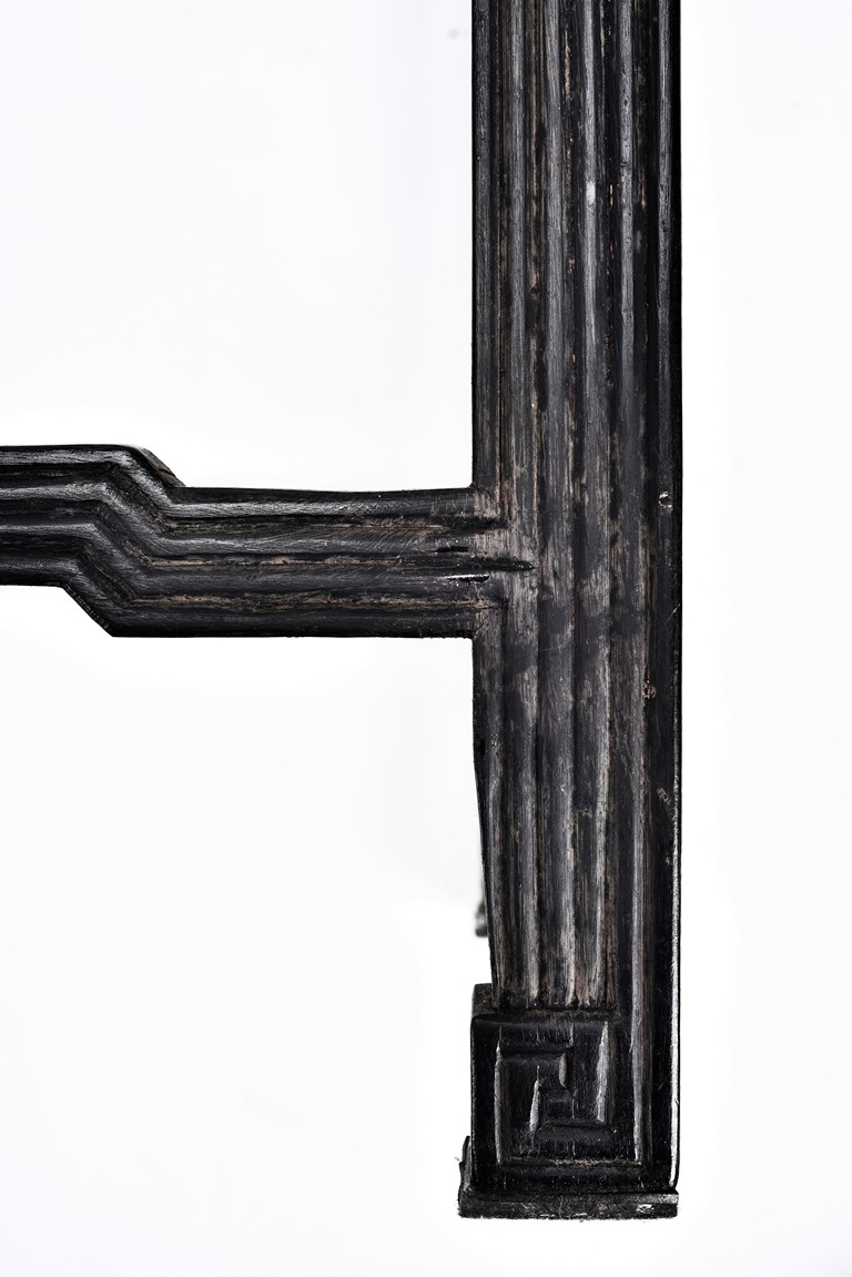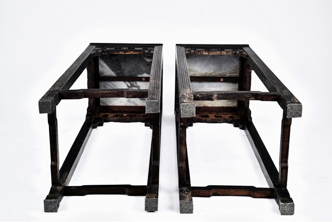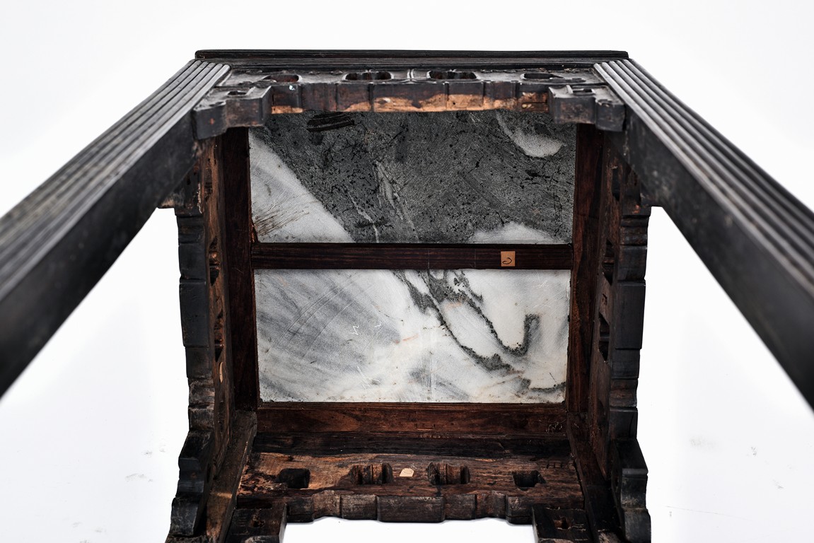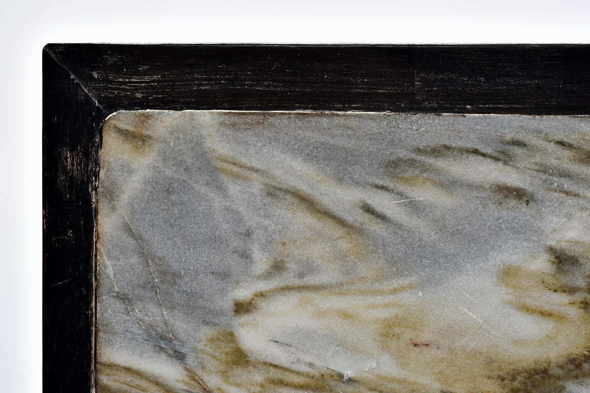 Each square top inset with 'cloud stone' marble with fine black,white, and russet striations, above recessed waist and openwork apron of archaistic scroll, further supported by four slender legs, each linked by straight stretchers. Republic period.