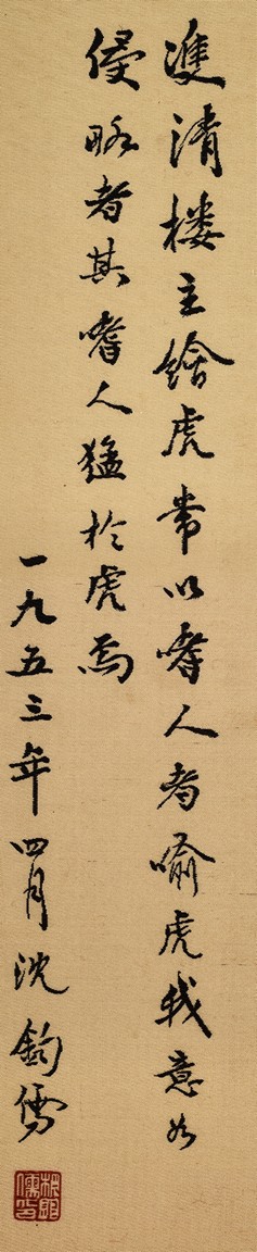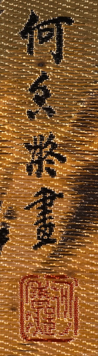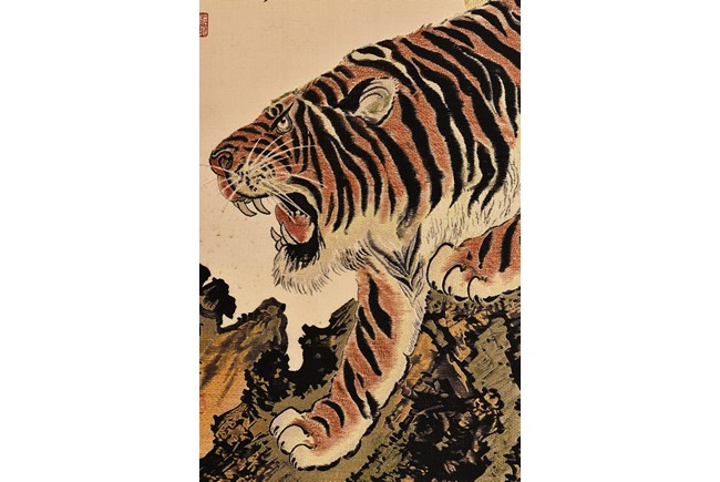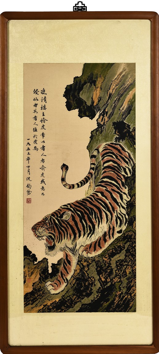 The embroidery finely depicts a tiger in crouching posture, with aggressive expression in a mountain setting. With inscription and colophone, and two seals of the artist, attributed to He Xiangning