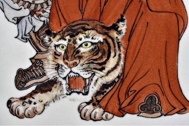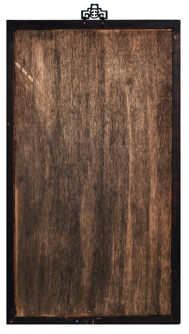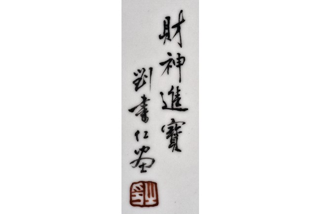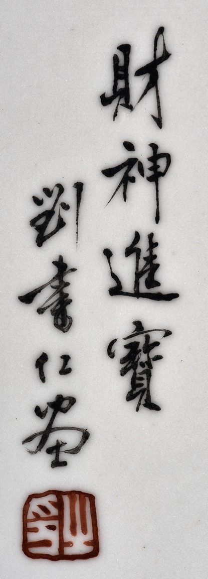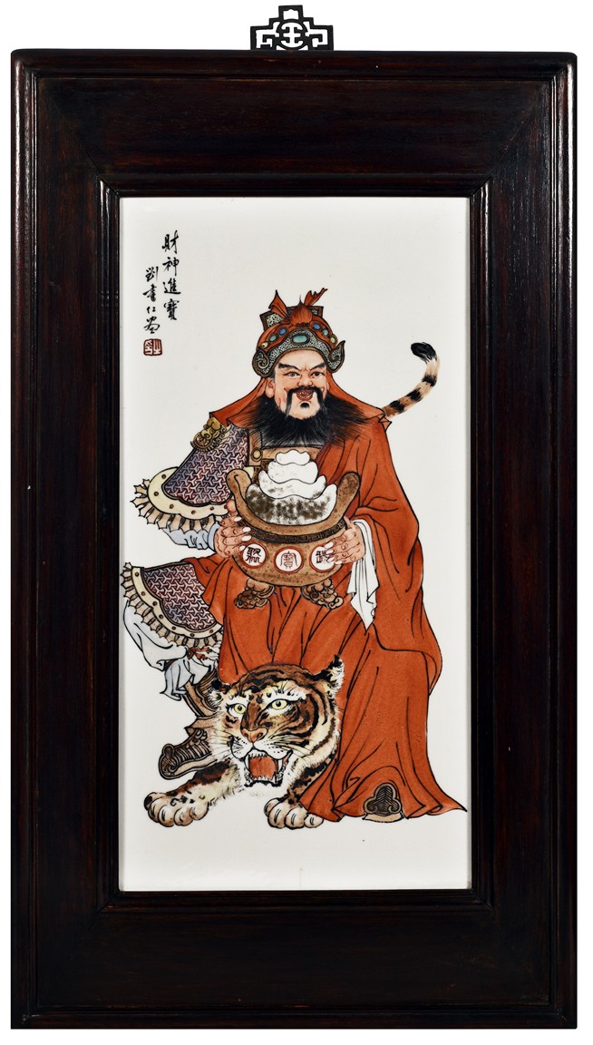 The plaque depicts a military official sitting upon a tiger, holding a censer with gold rugget, with inscription, signature, and seal of the artist.