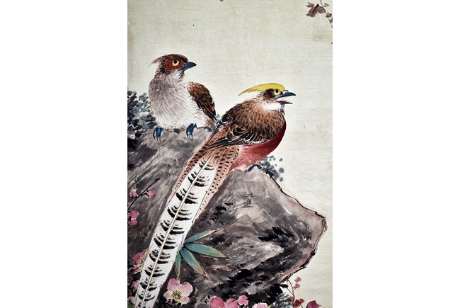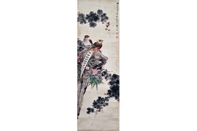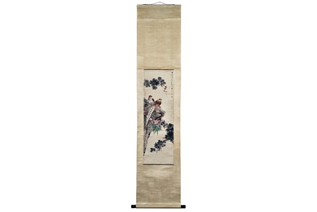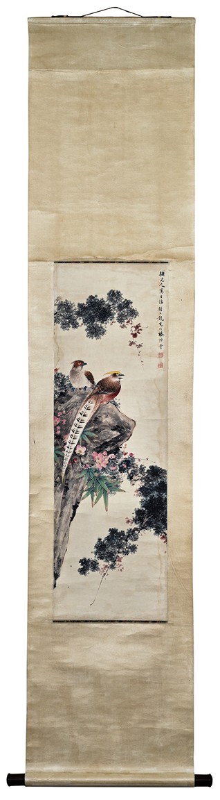 Ink and color on paper. Hanging scroll. With inscription and colophone. Two seals of the artist. Attributed to Yan Bolong