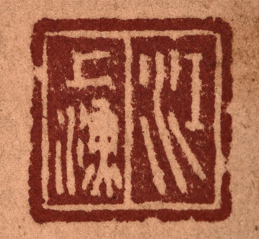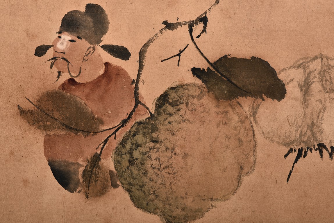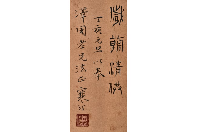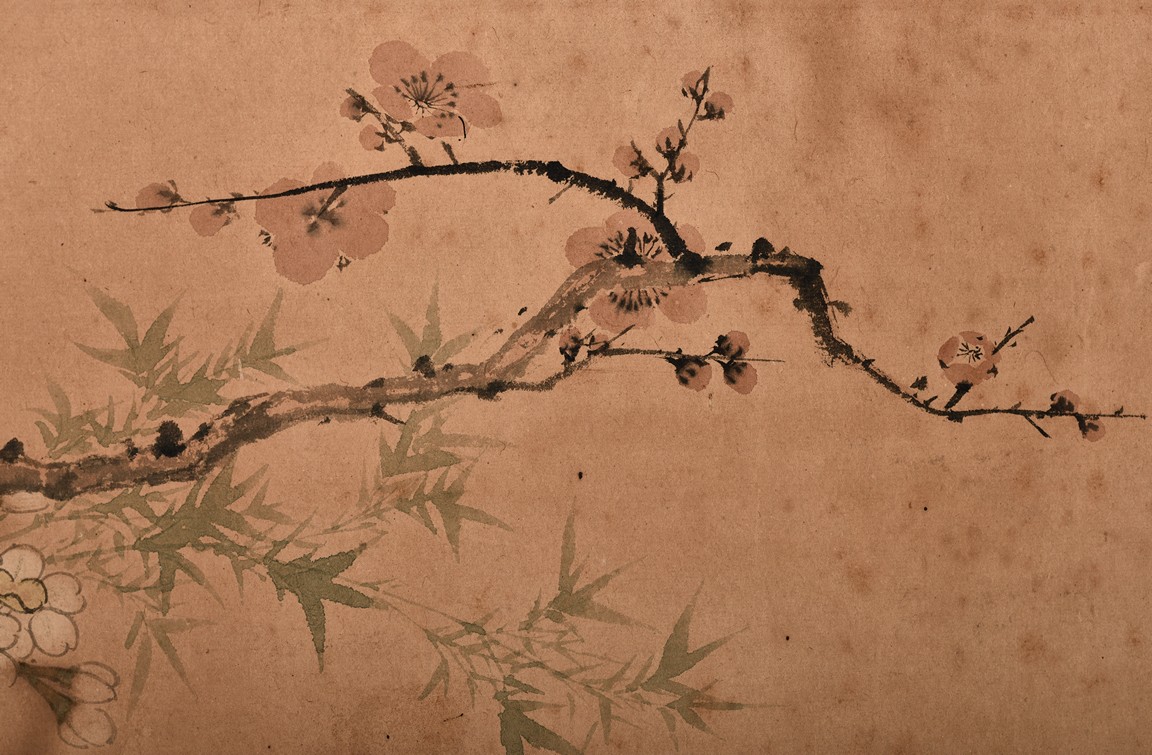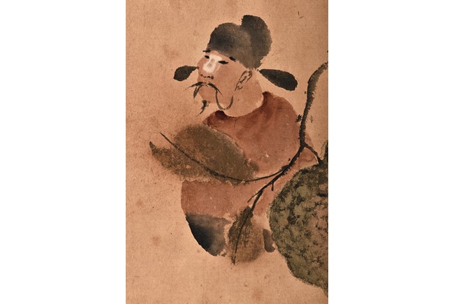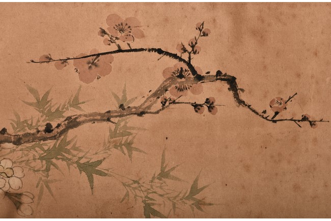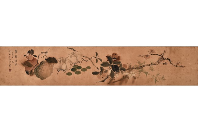 Color and ink on paper, horizontal painting, framed. The painting depicts an official standing next to flower trees, vines, bamboo, and stones, artist signature and mark “Jiang Hanting” on the left side.