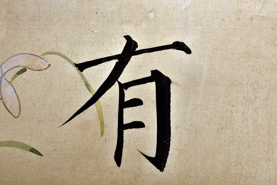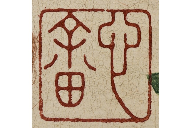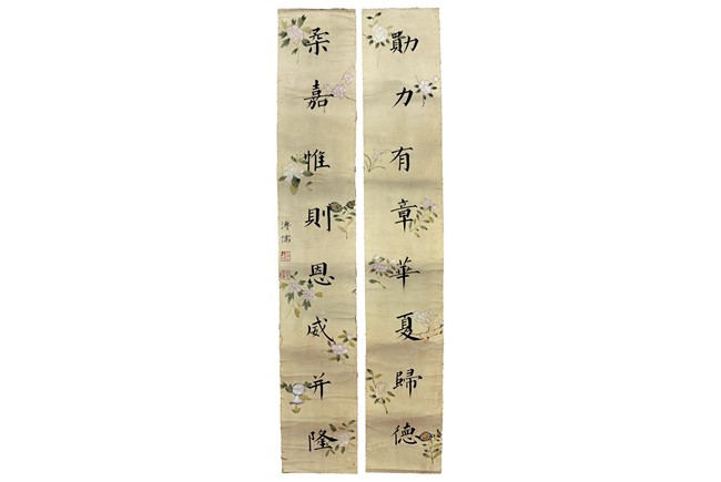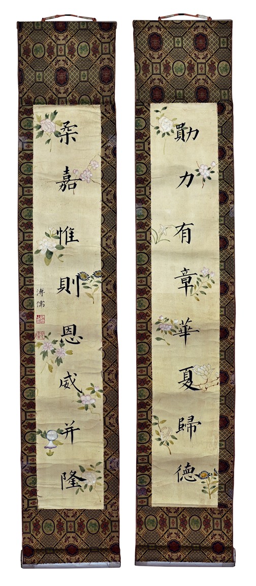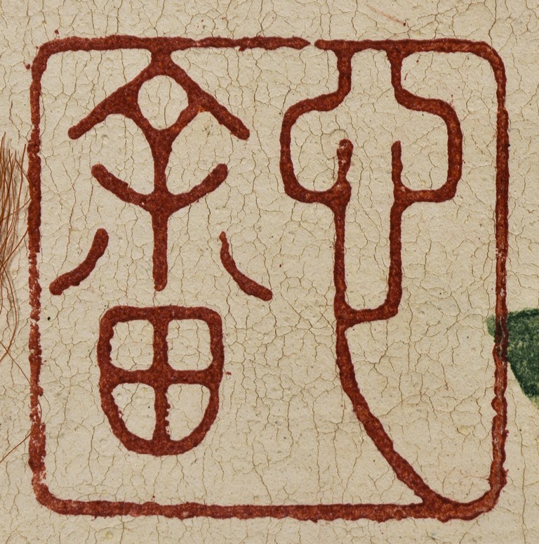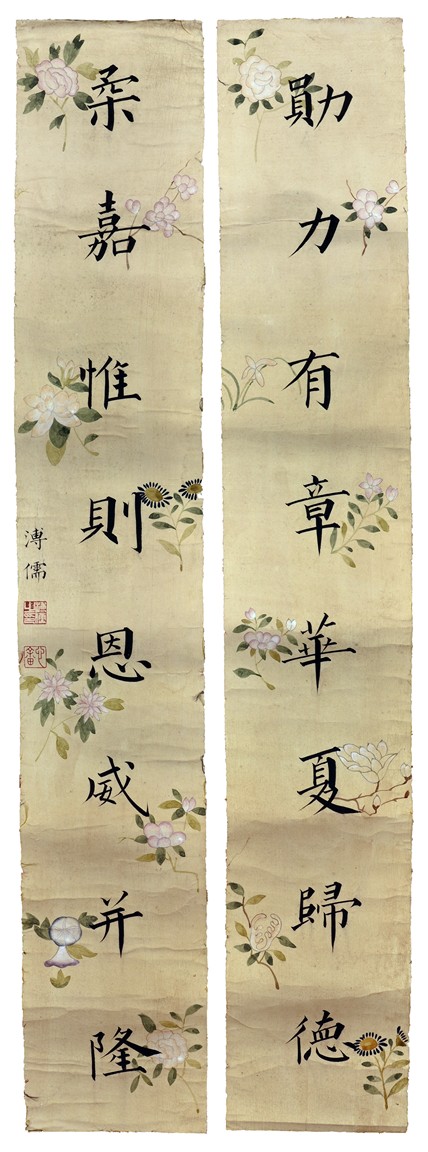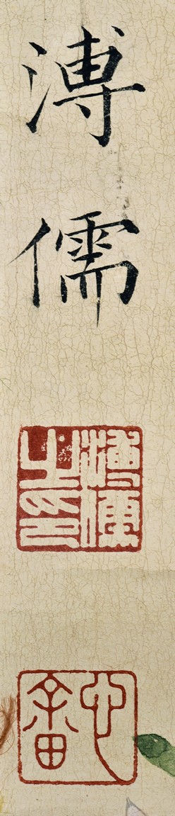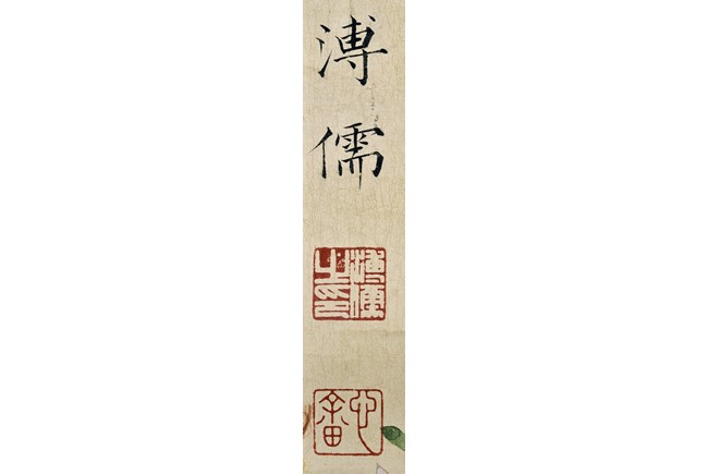Color and ink on paper. Inscribed and signed, the background painted with colored flowers. with two seals of the artist. Attributed to Pu Ru.