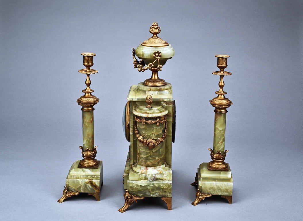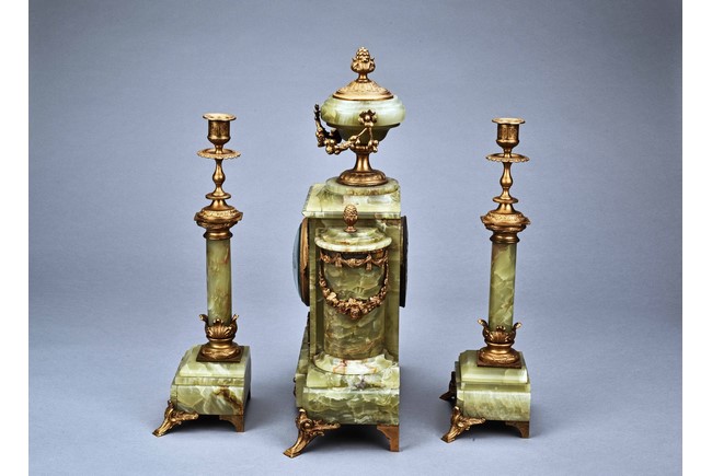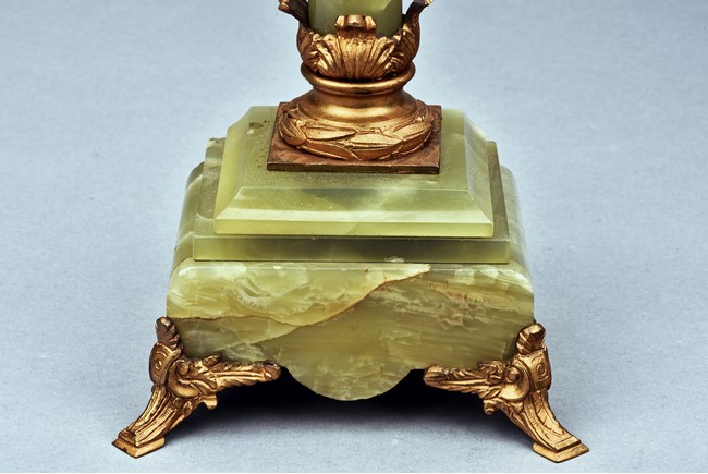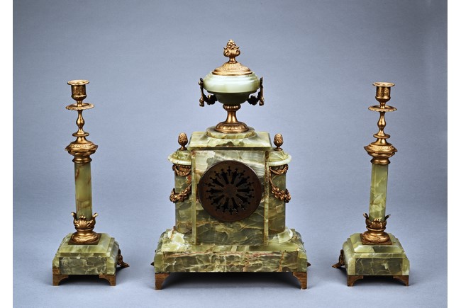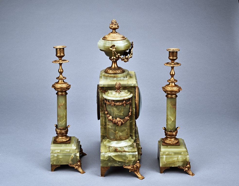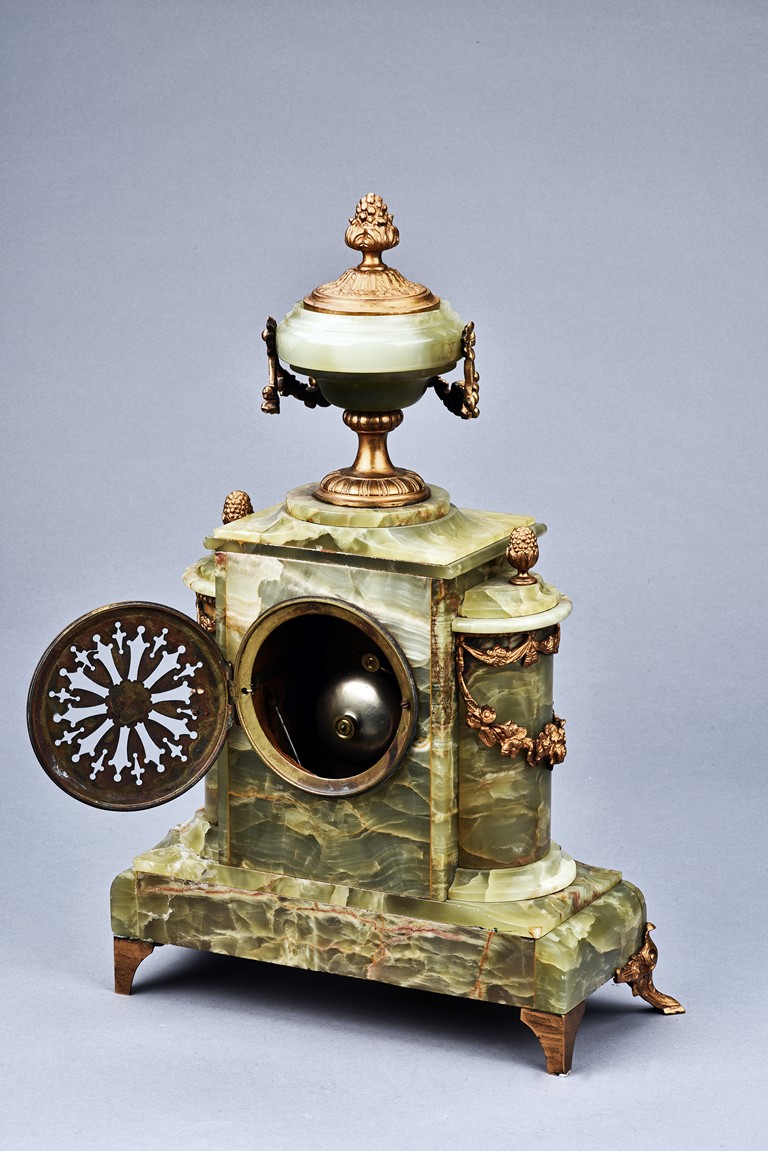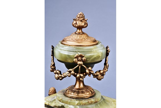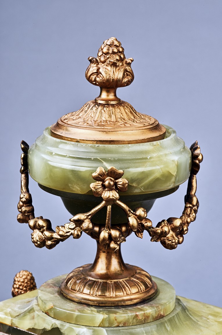 Finely modelled ormolu and mounted green onyx in Louis XVI style, the clock surmounted with a figure of urn.
