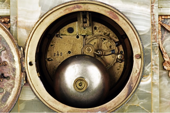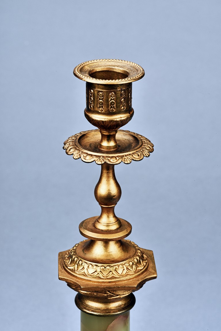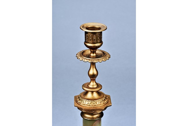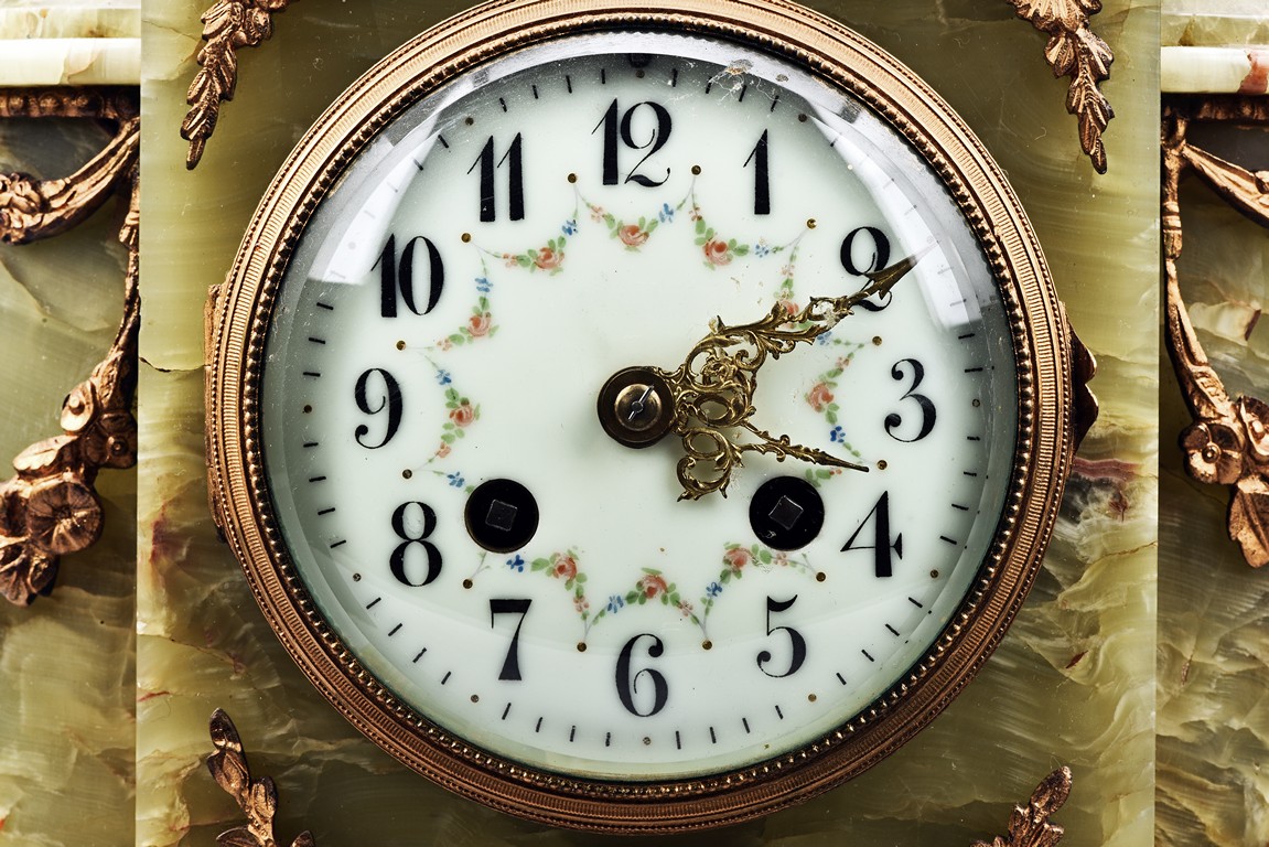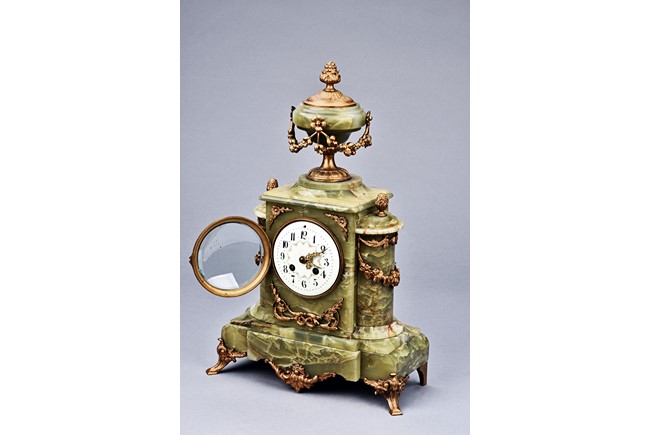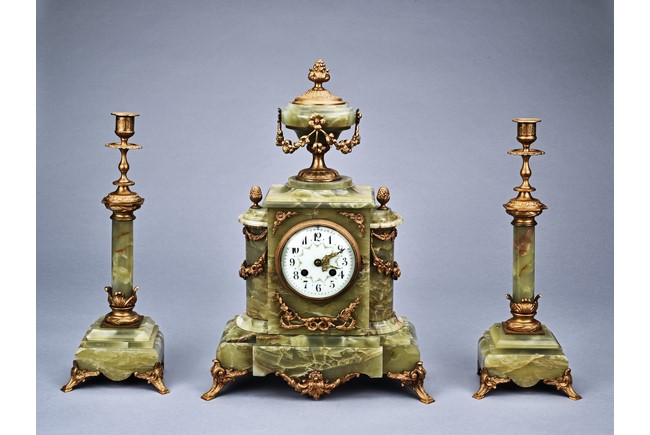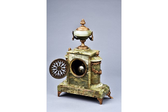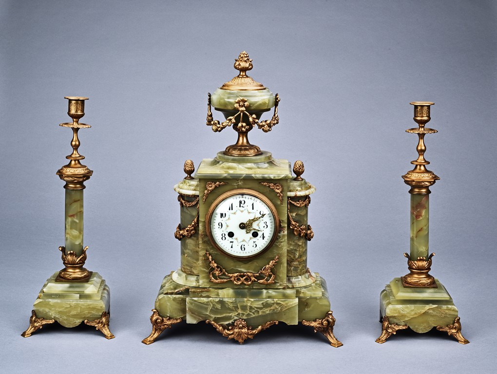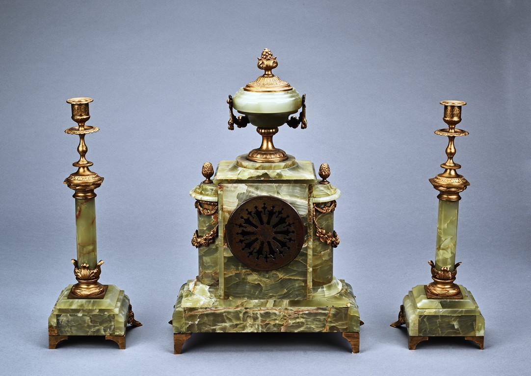 Finely modelled ormolu and mounted green onyx in Louis XVI style, the clock surmounted with a figure of urn.