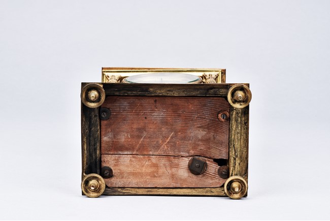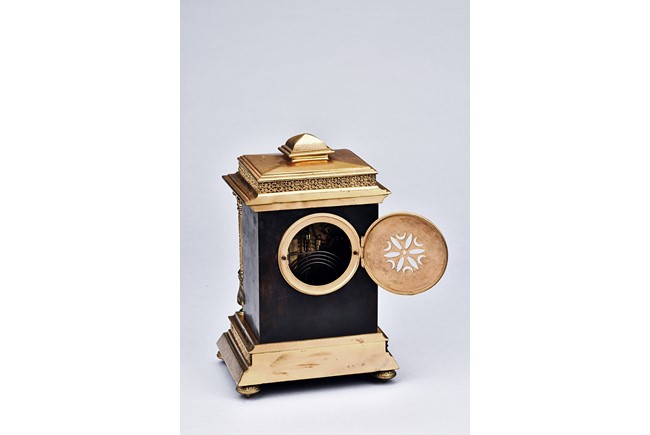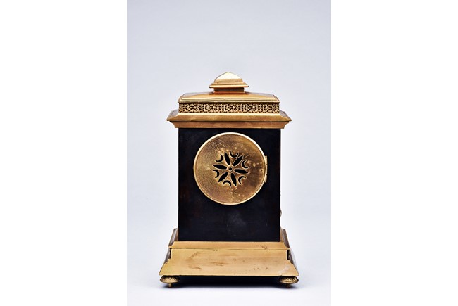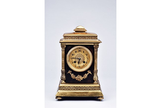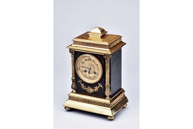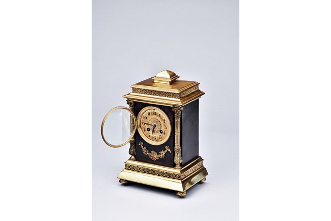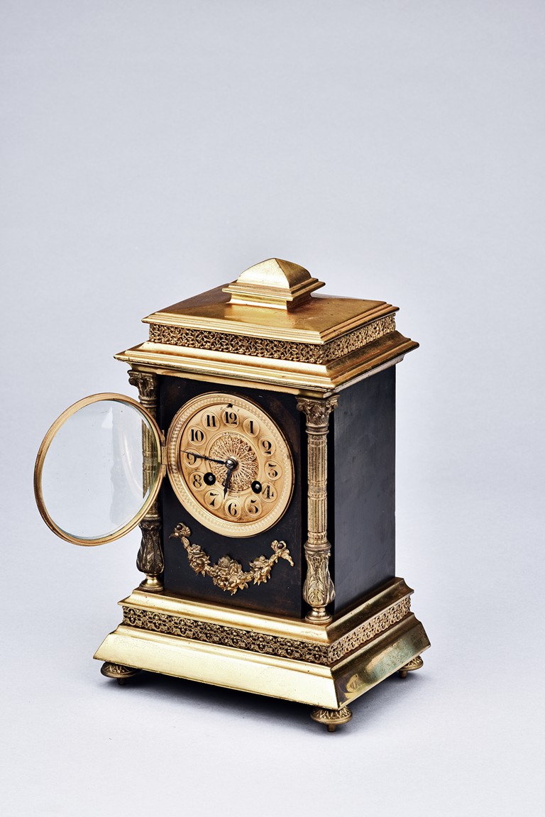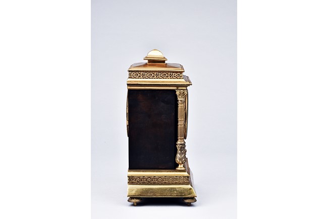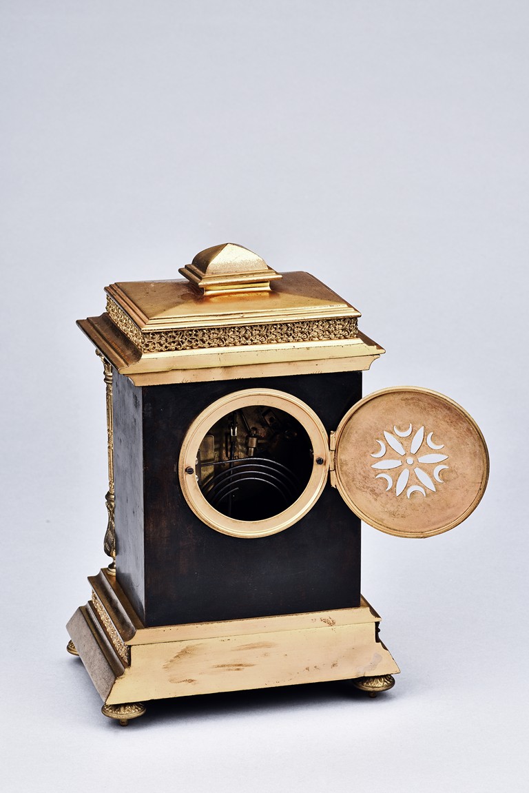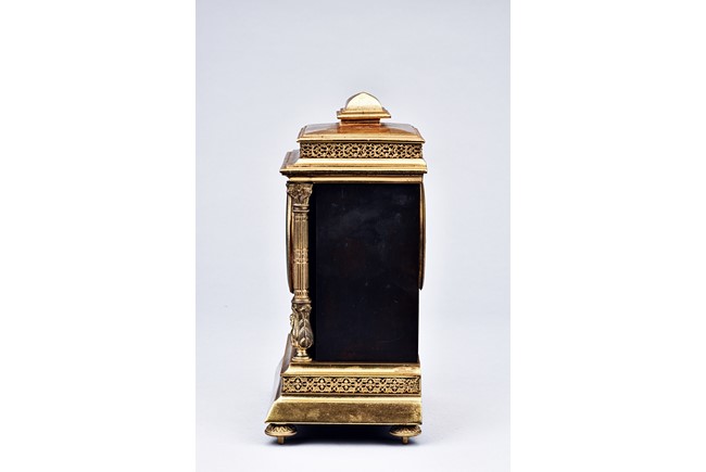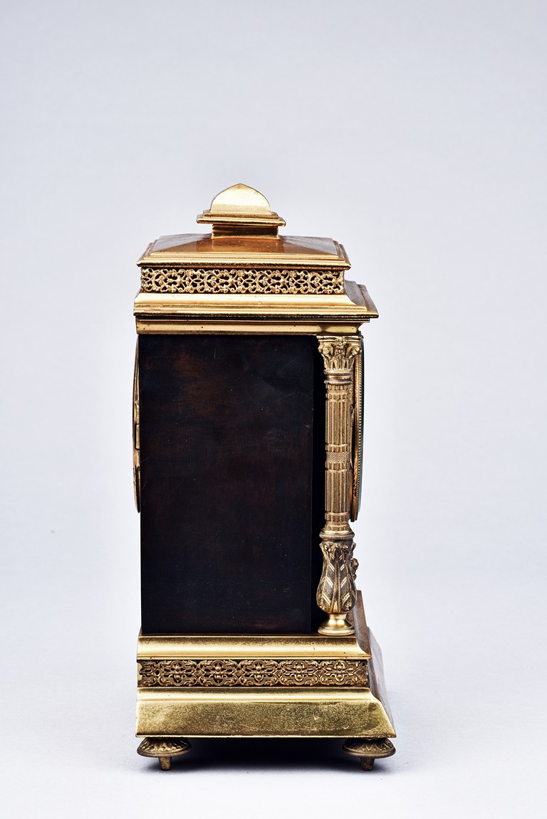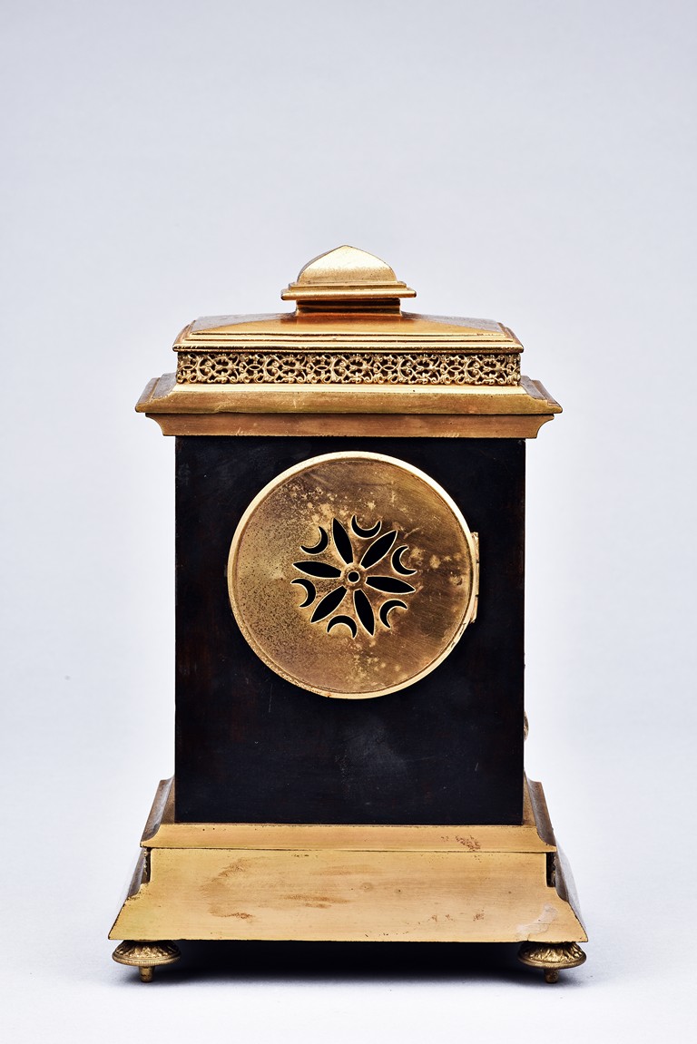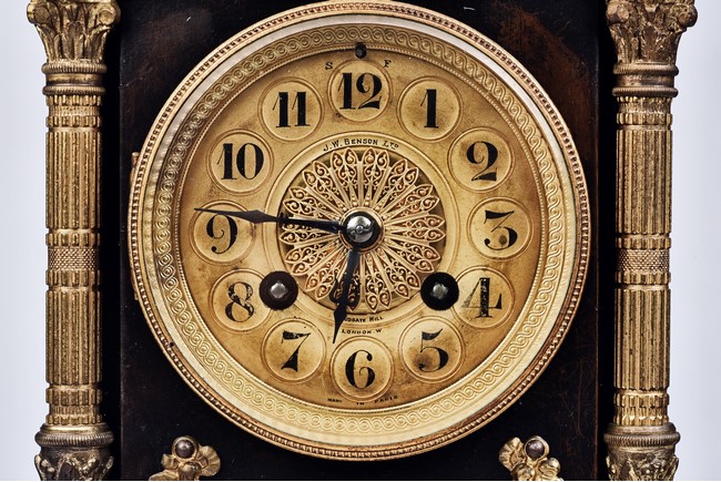 With gilt brass decoration, the mantle clock with Arabic dial, stamped J.W.Benson and made in Paris.