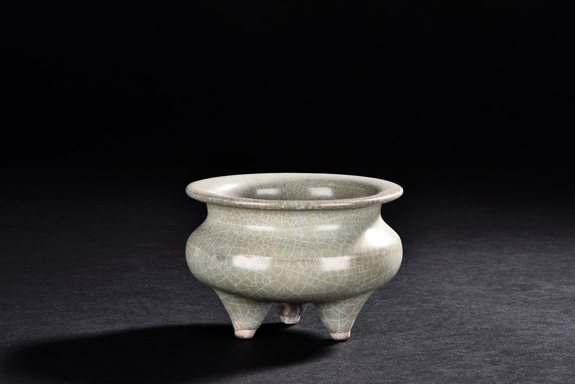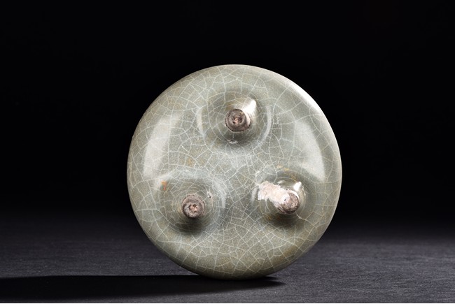 The compressed body raised on three conical supports, with a straight neck rising to flat everted rim, the body with fine crackle and pale celadon tone.