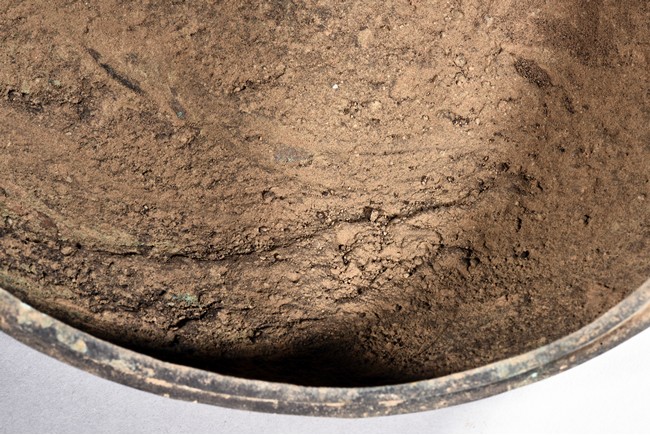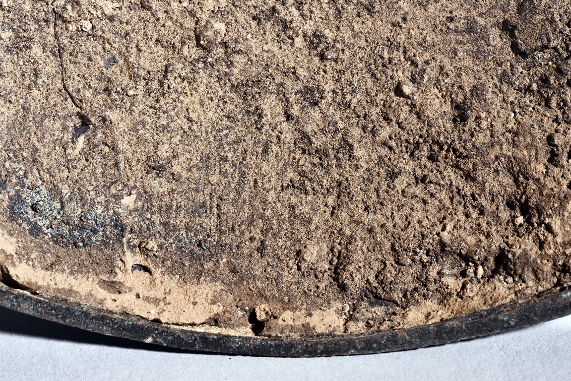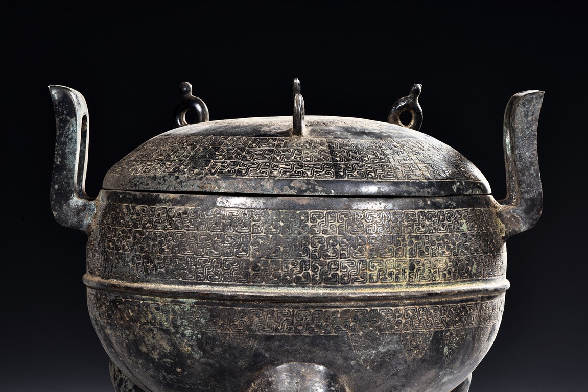 Standing on three tall curved legs, the domed cover and body decorated with repeated leiwen , flanked by projecting arched handles below the three small rings. Qing Dynasty period.