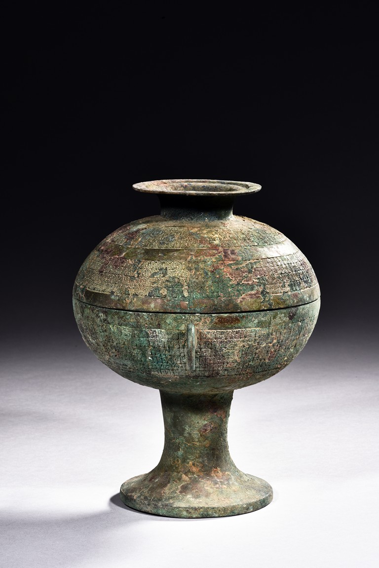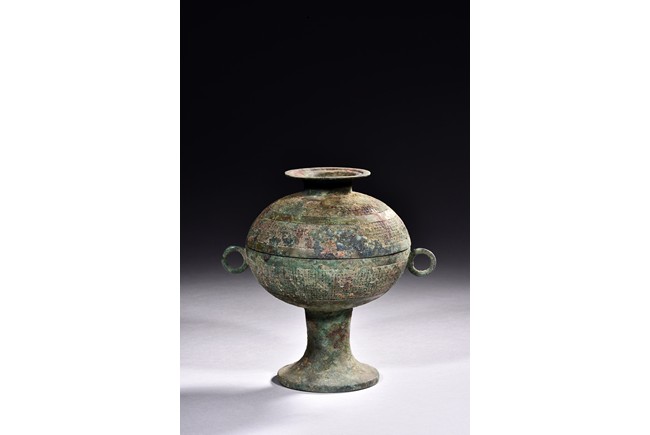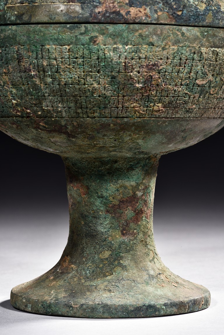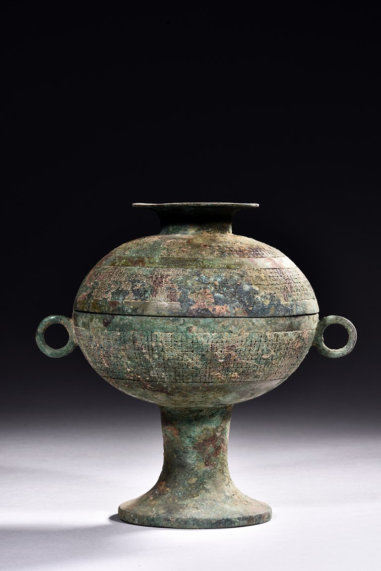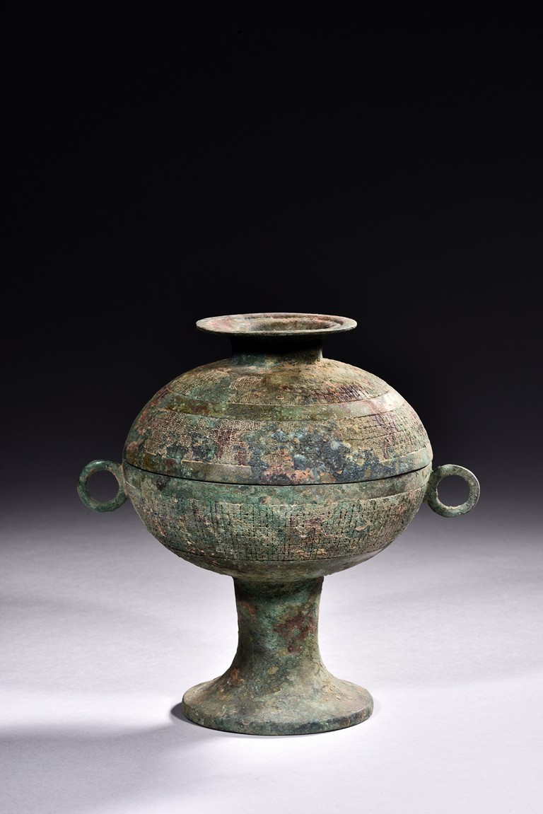 Raised on a pedestal foot, the bowl overall decorated wtih dense bands of s-scrolls patterns and cast with a pair of ring handles flanked the body, the domed cover with a circular crown.