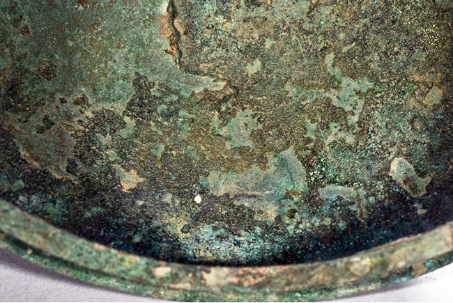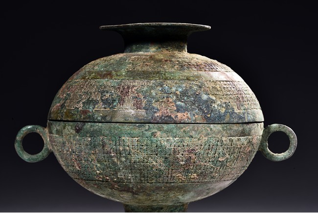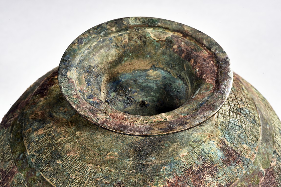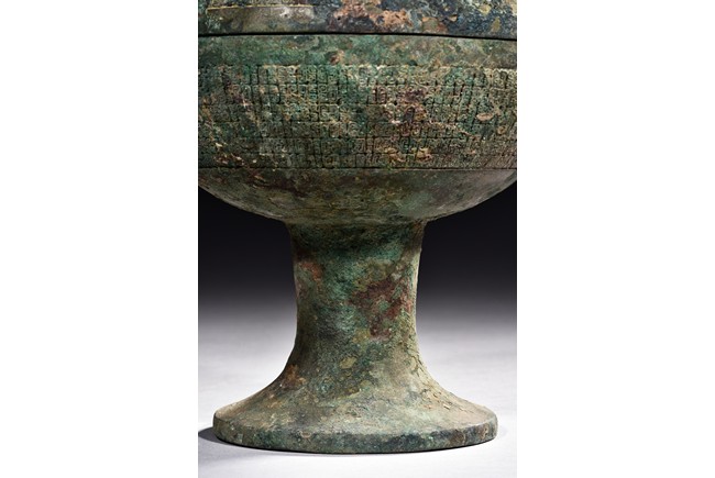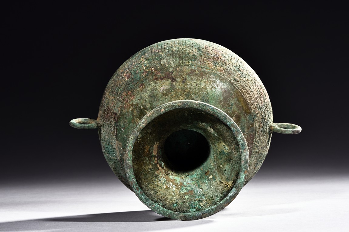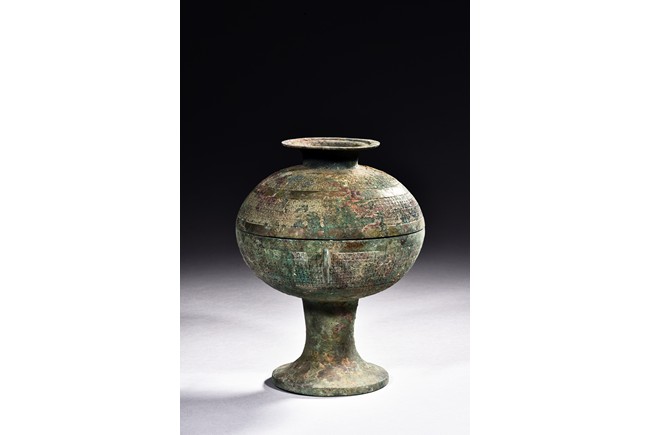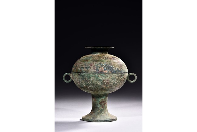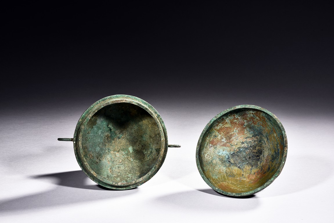 Raised on a pedestal foot, the bowl overall decorated wtih dense bands of s-scrolls patterns and cast with a pair of ring handles flanked the body, the domed cover with a circular crown.