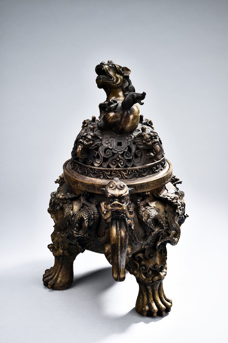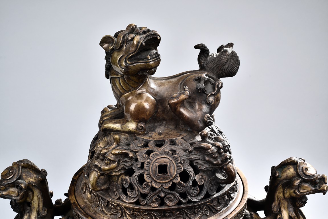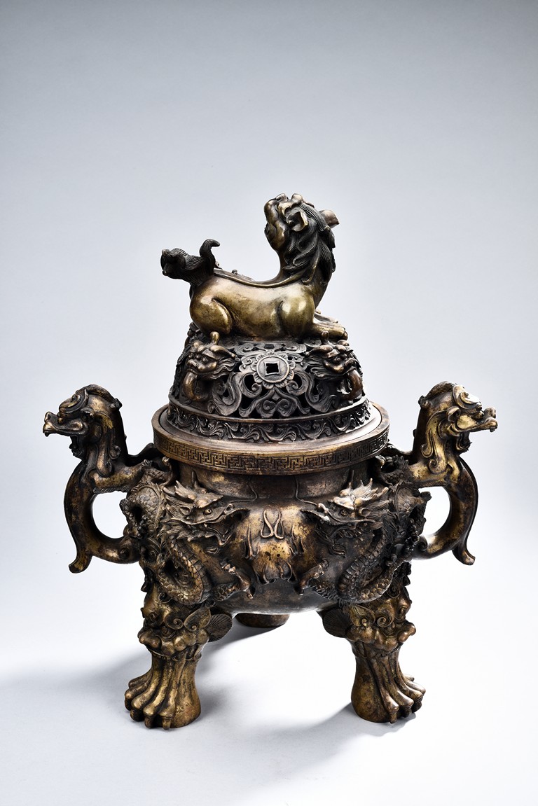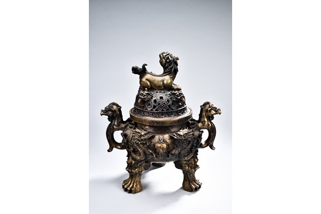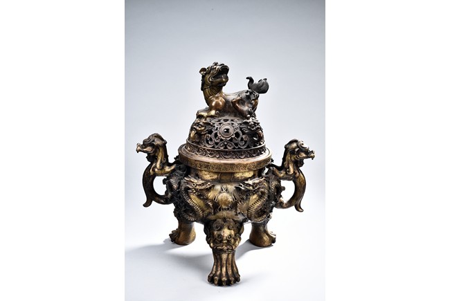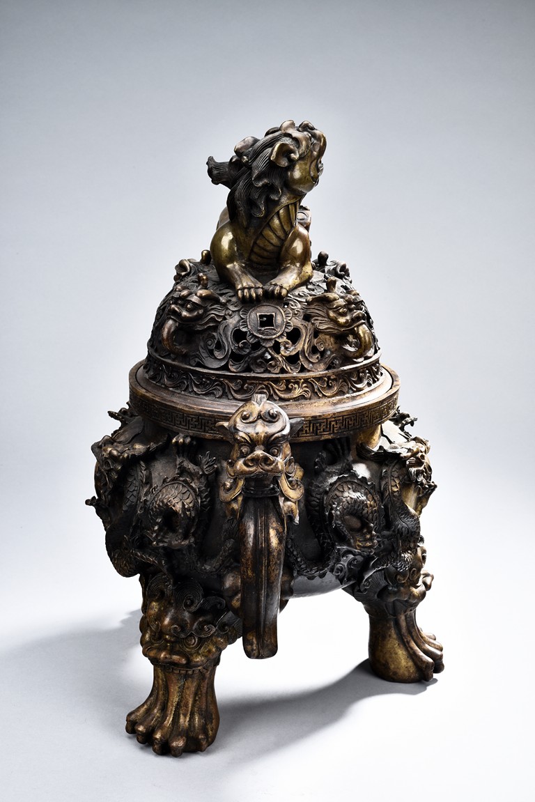 Supported on three beast feet, the body with two dragons aganist a flaming pearl, flanked by two beast formed handle, the cover with openwork mythical beast design, surmounted with a qilin with head turning back. The bottom with six character #Xuande# mark.