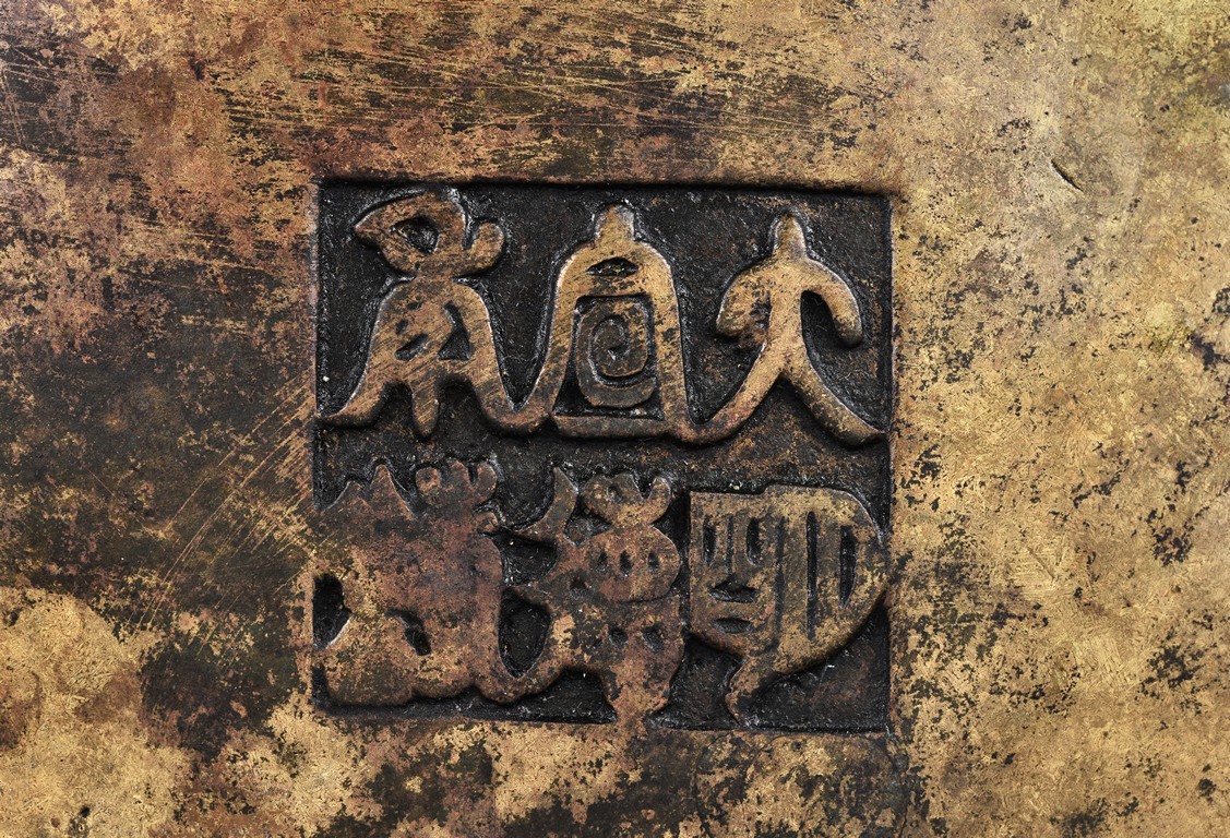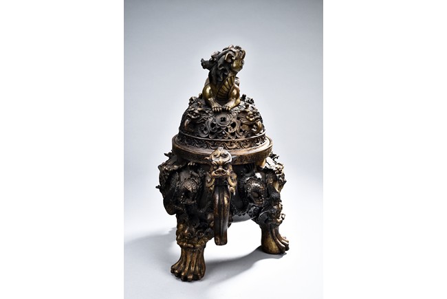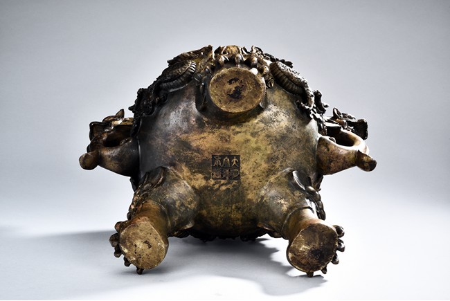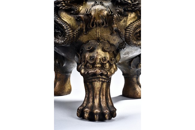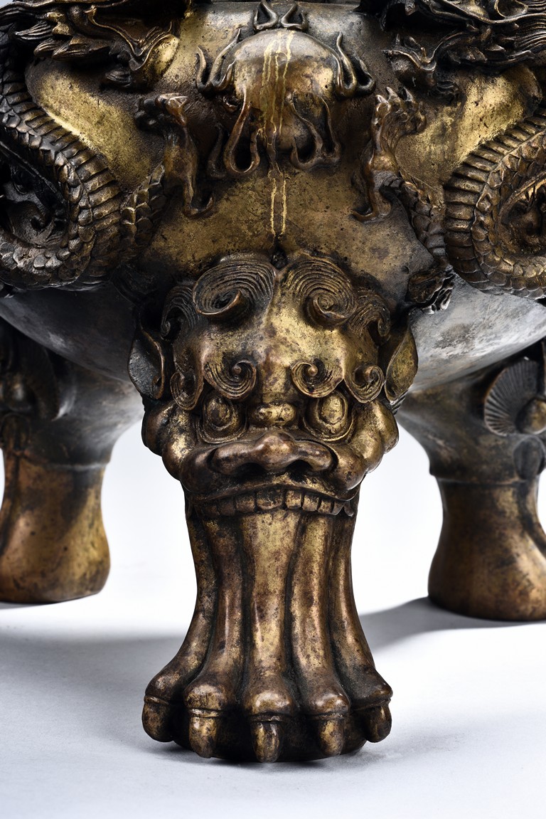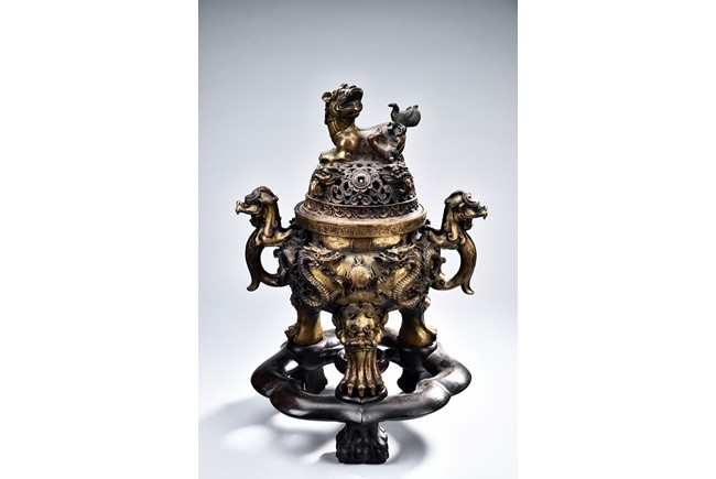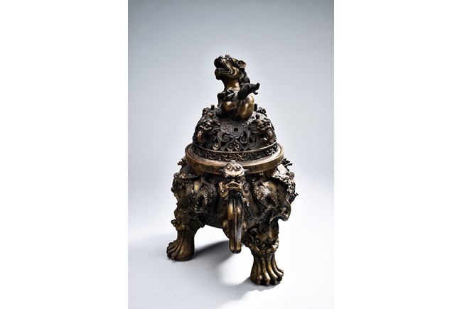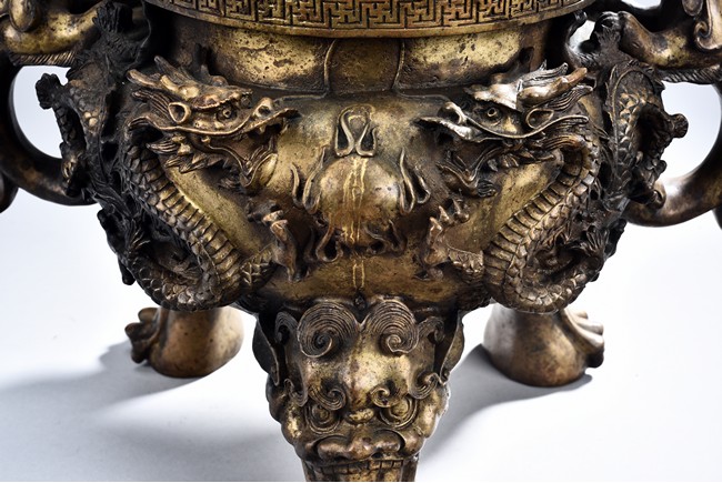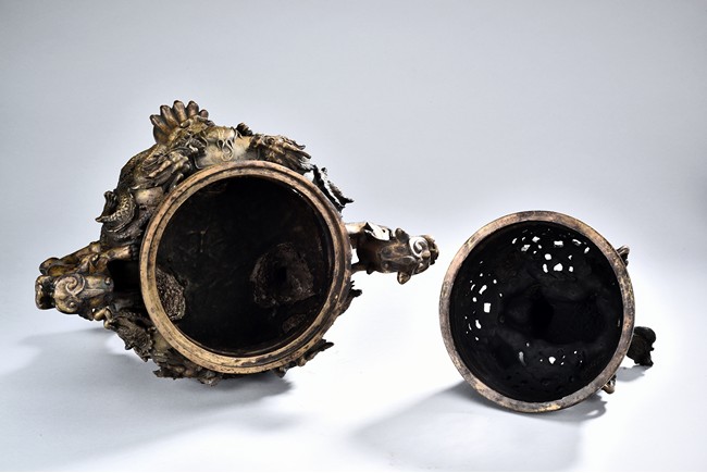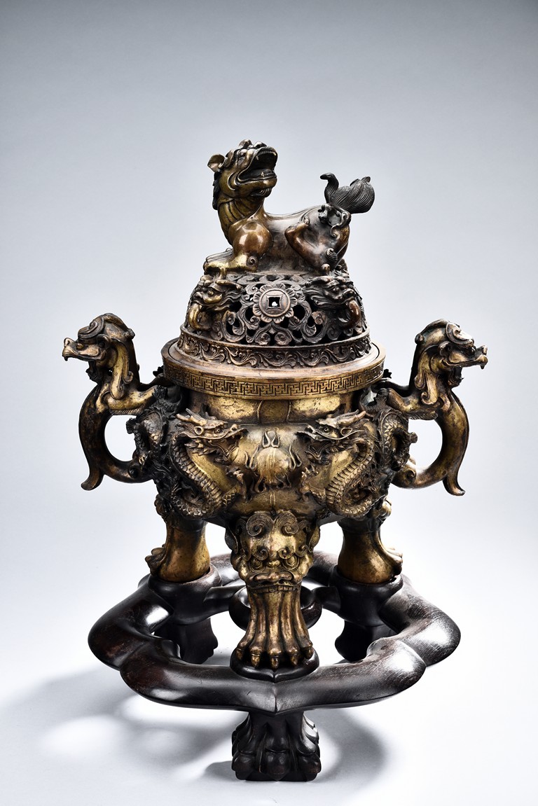 Supported on three beast feet, the body with two dragons aganist a flaming pearl, flanked by two beast formed handle, the cover with openwork mythical beast design, surmounted with a qilin with head turning back. The bottom with six character #Xuande# mark.