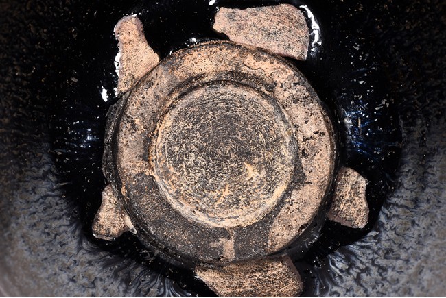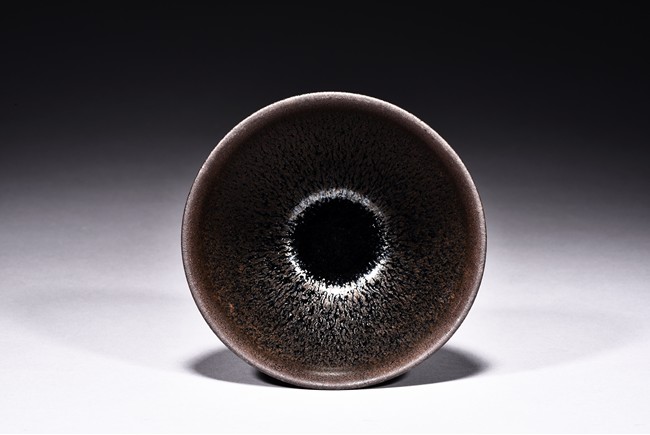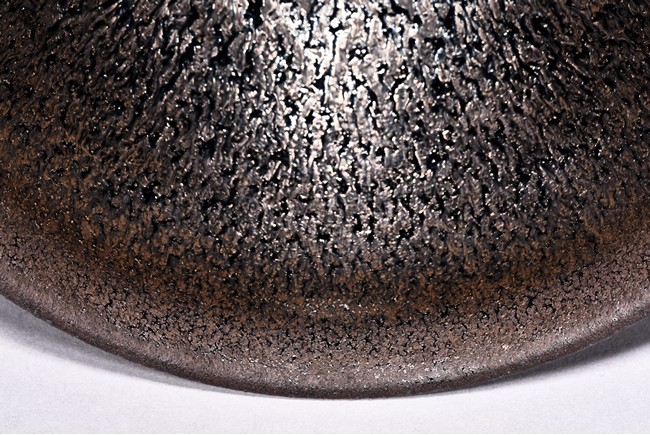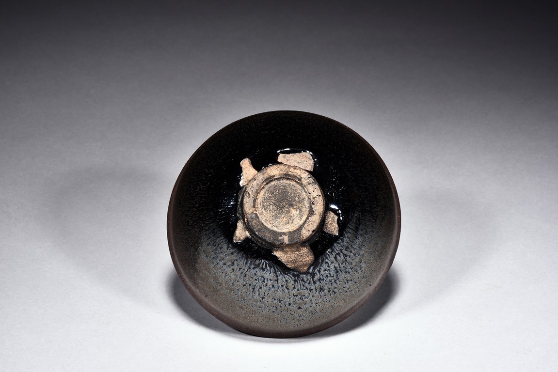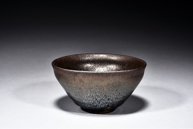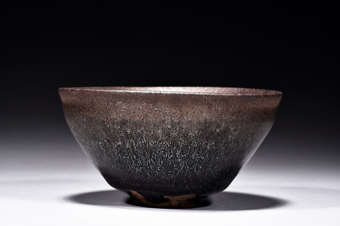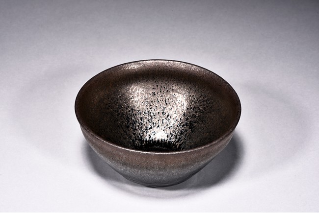 The rounded sides rising from short, the bowl is overall covered with lustrous brown glaze infused to the interior and exterior with silvery black streaks. The glaze ends irregularly around the foot to expose the stoneware body.