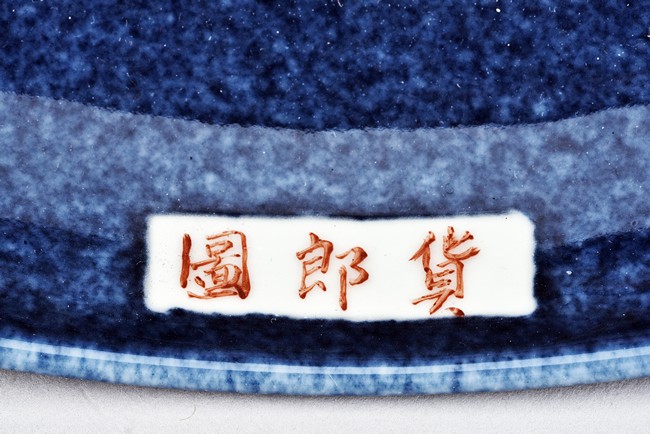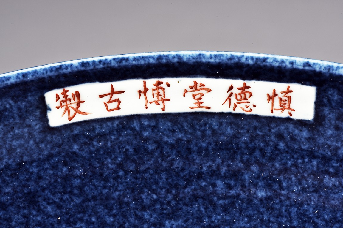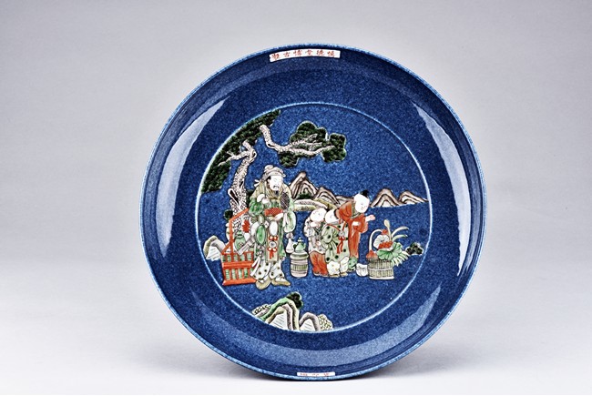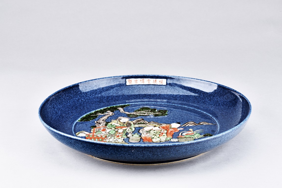 A BLUE PORCELAIN DISH 慎德堂博古製 貨郎圖瓷盤