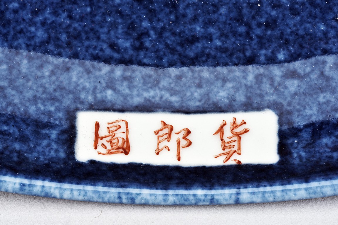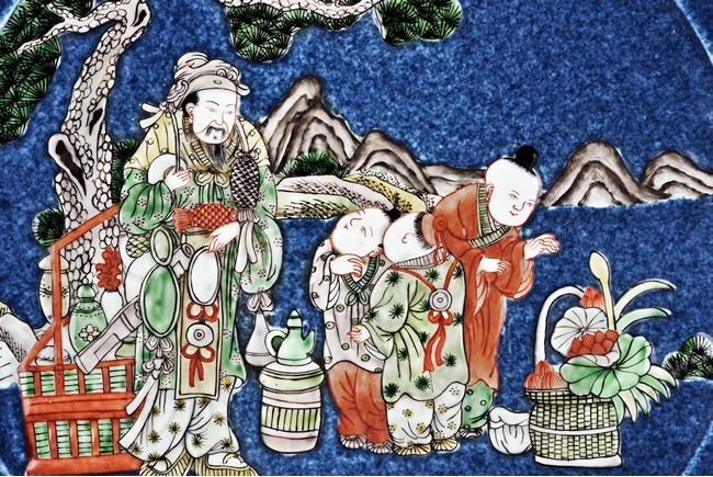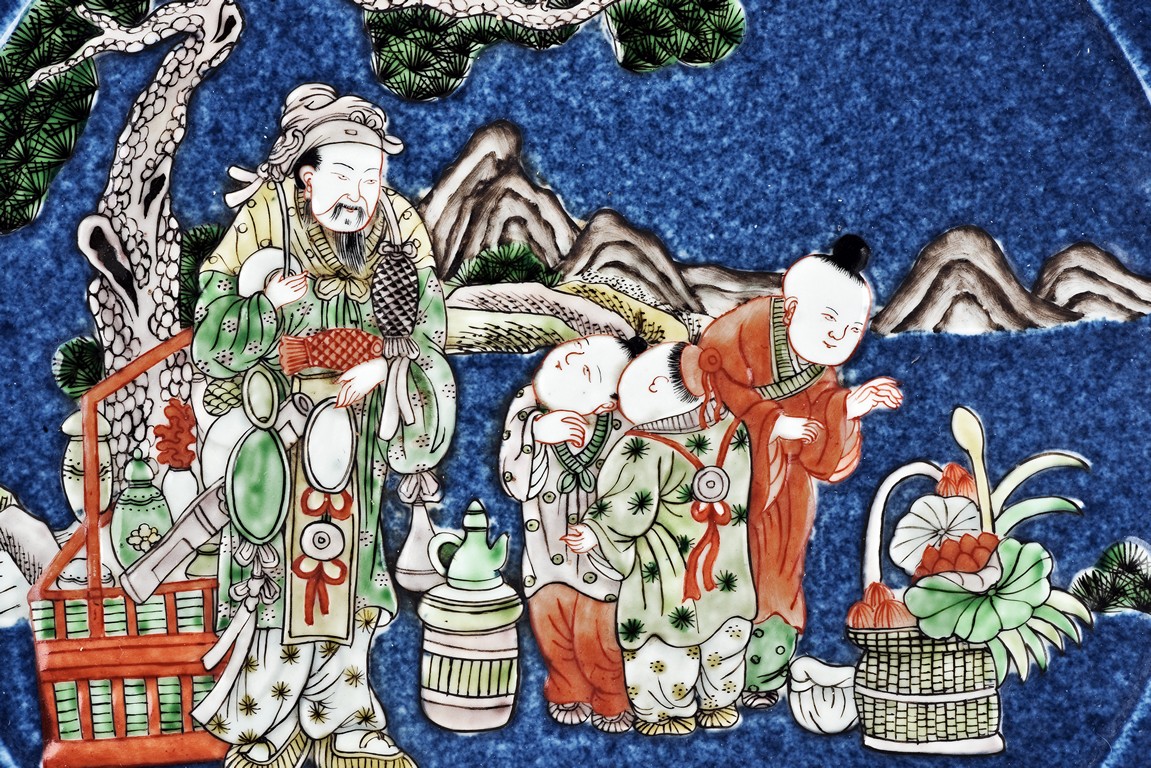 All aganist blue glaze ground, with figures and marks.