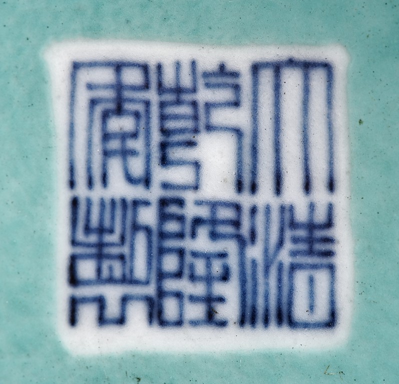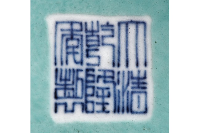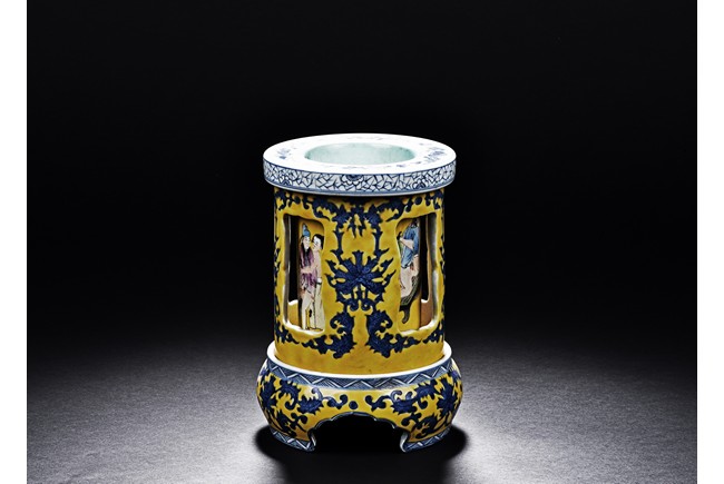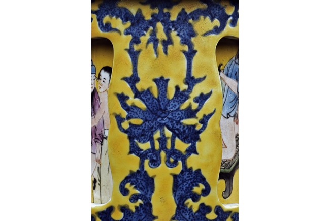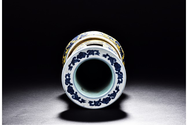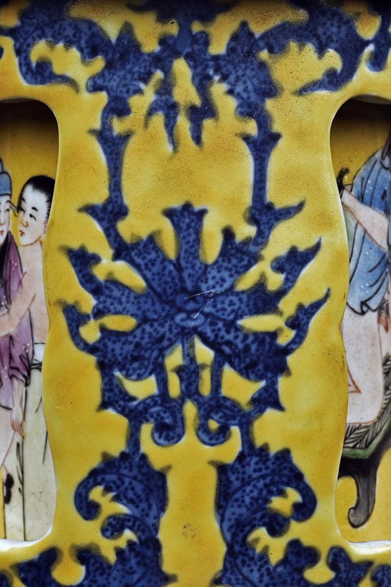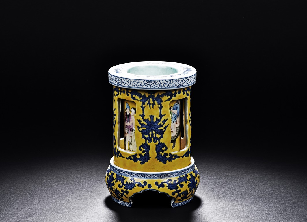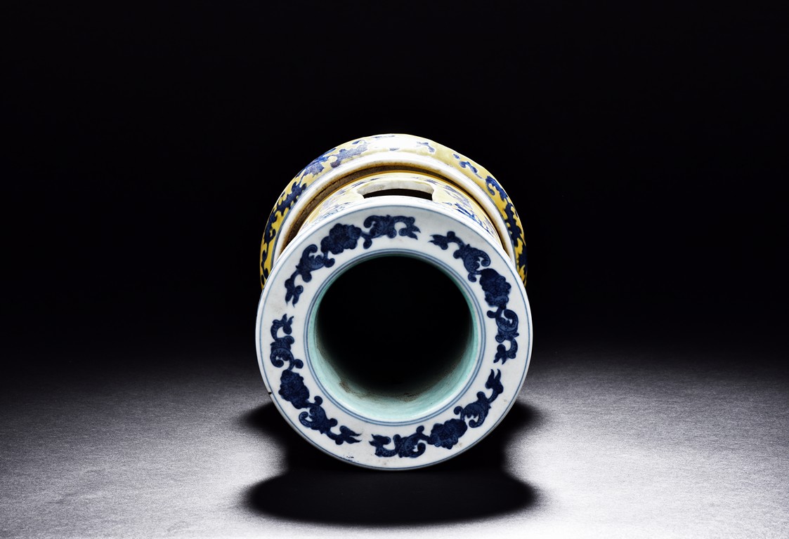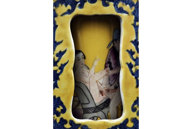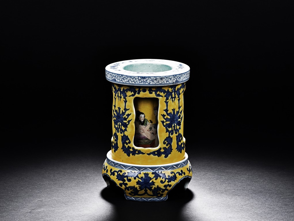 Supported on three stubs, the revolving body with blue foliage aganist yellow ground, revealing erotic scene in interior. The bottom with six character 'Qianlong' mark.