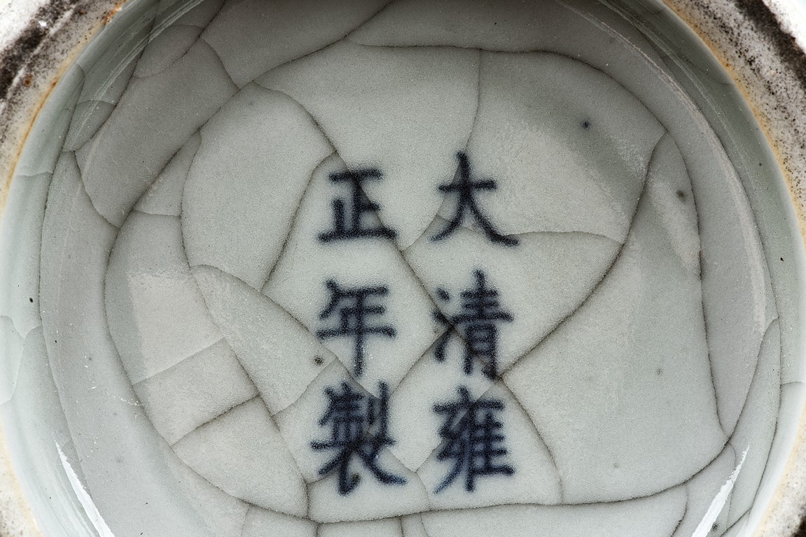 Of rectangular form and rounded mouth and bottom, each side moulded with bagua pattern.