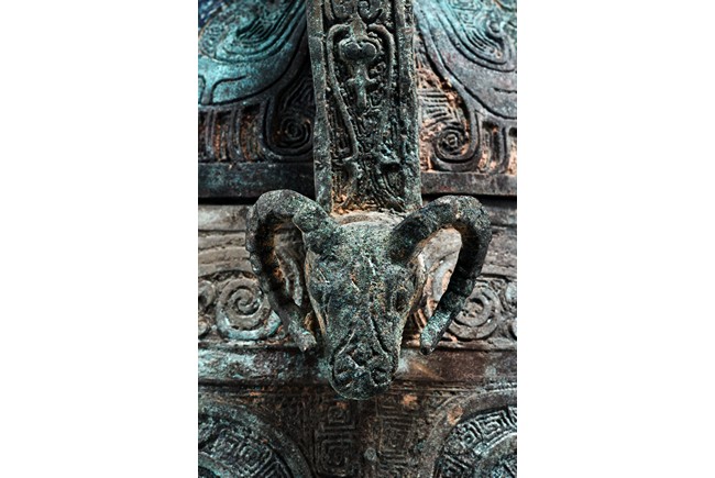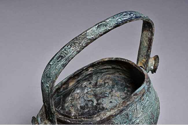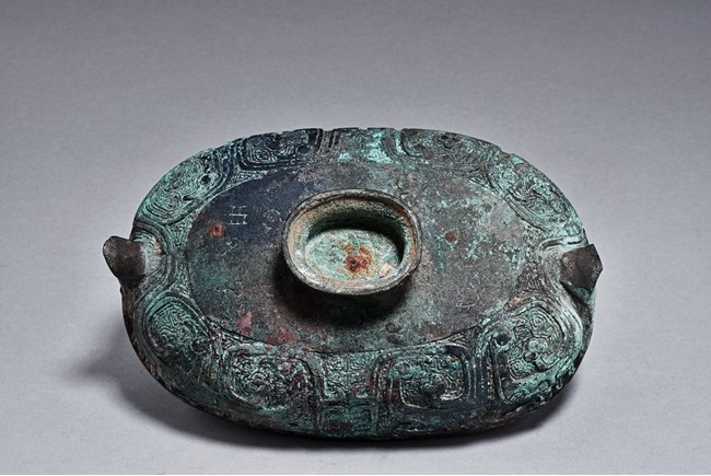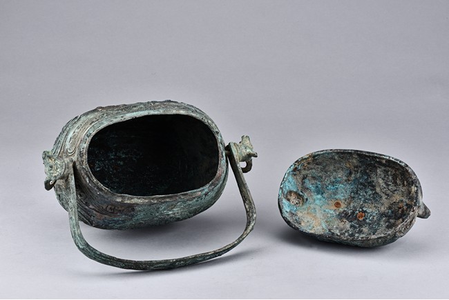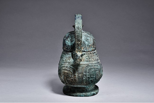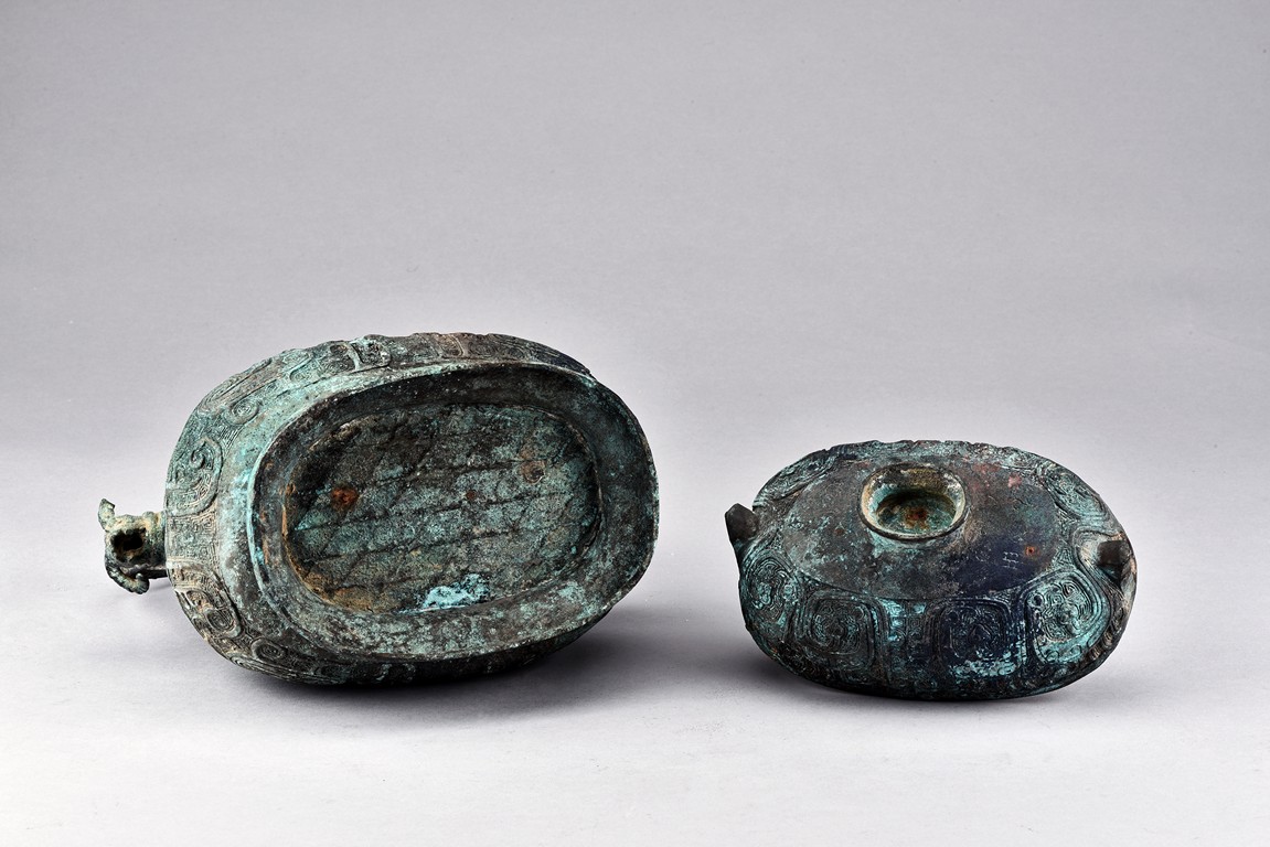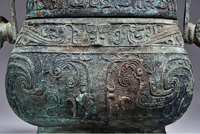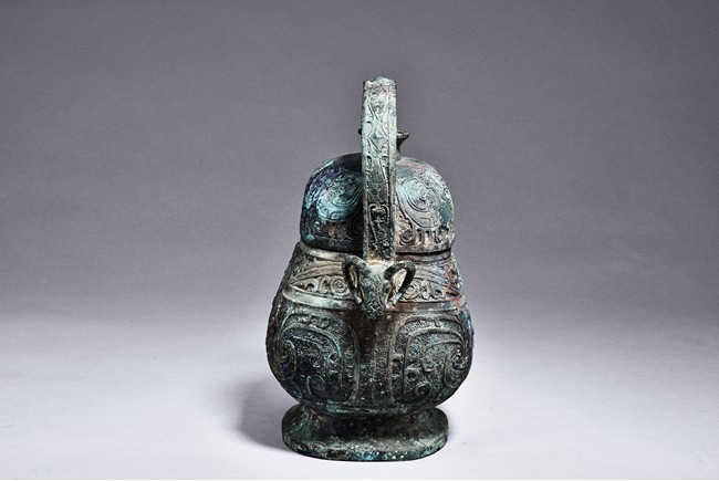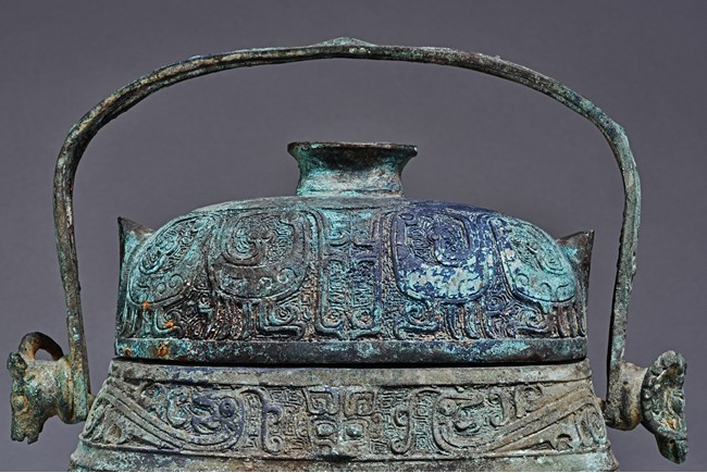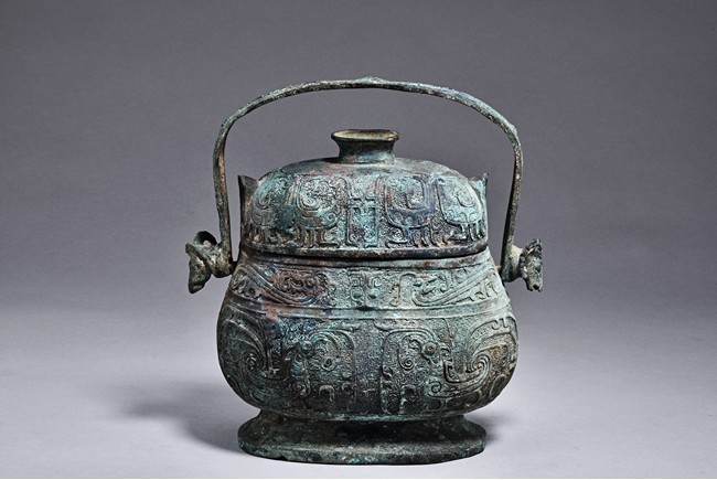 Of broad oval shaped body, the vessel is cast standing on spreading foot ring, the sides cast with arched handle terminating in ram masks. The high domed cover is surmounted with a flared finial. It is decorated around the main body and cover in relief with stylized phoenix pairs on the front and back reserved on leiwen ground, with a band of scrolling mythical beast confronting a raised bovine mask. The exterior of the cover top with inscriptions. The vessel has extensive mottled green patina with malachite encrustations.