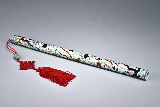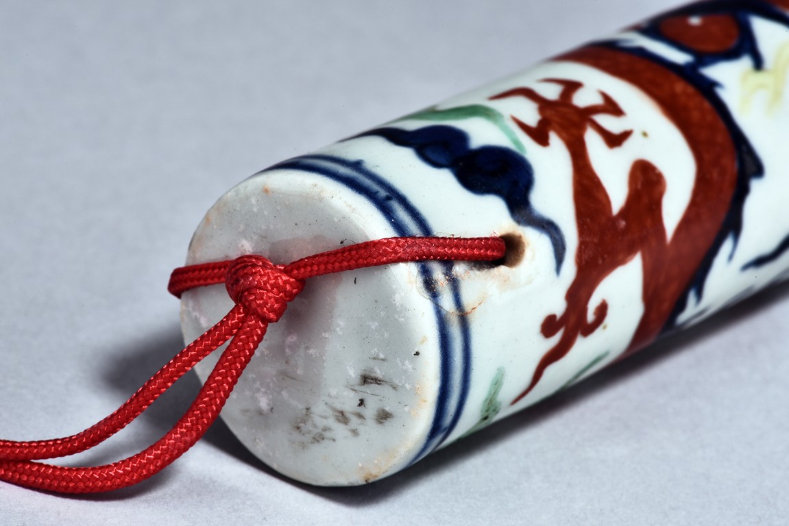 A WUCAI PORCELAIN FLUTE    粉彩龍紋瓷笛 大明萬曆款