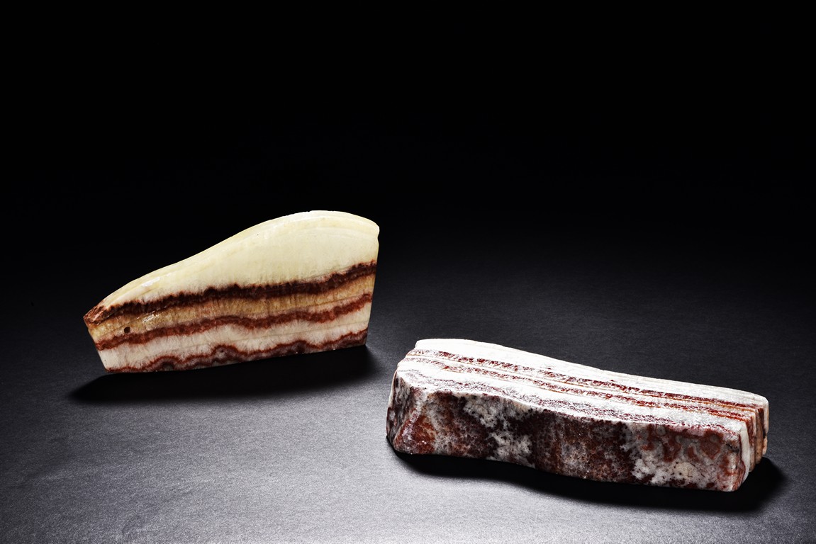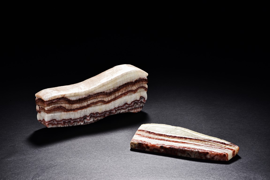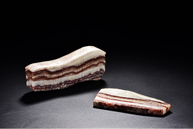 A SET OF TWO 'PORK BELLY' STONE DISPLAY 隨型石五花肉兩個
