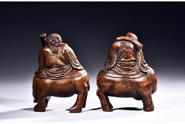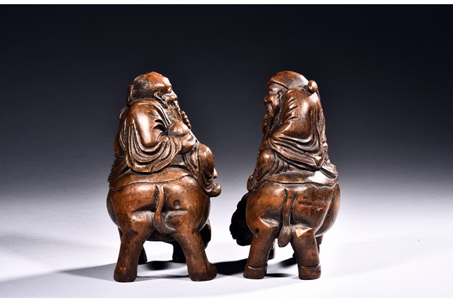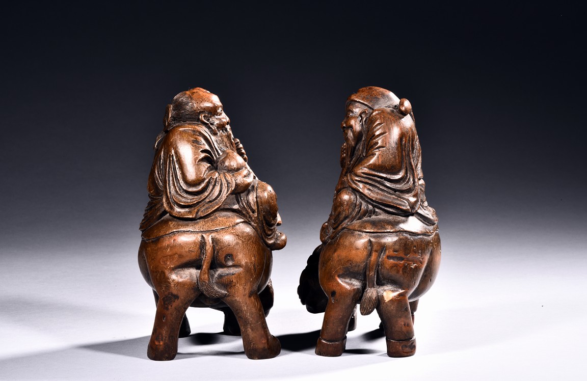 Comprised of a shou and lu star figure shown sitting on a buffalo, the shou star shown holding a peach and staff, the lu star shown holding a scroll, both with benevolent expression.
