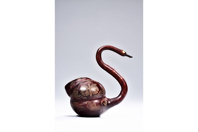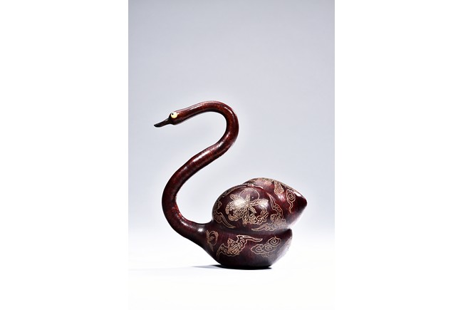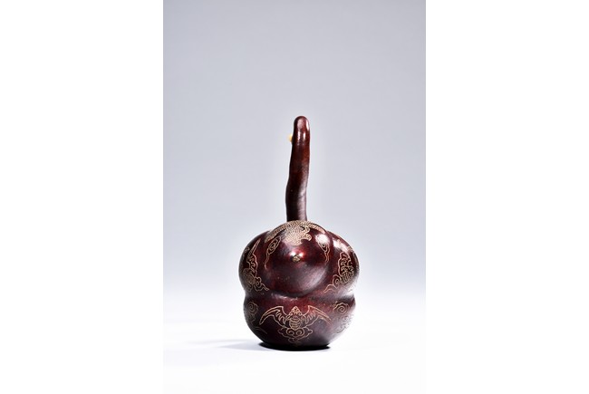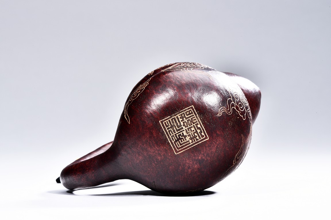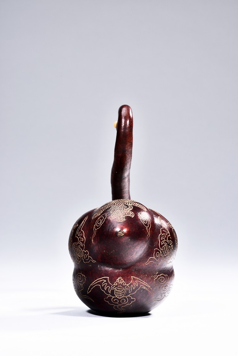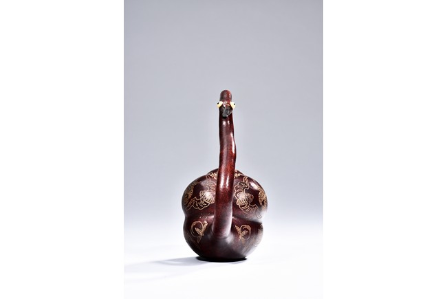 This gourd in the form of a goose shape, with curled neck, the body gilt painted with floral and auspicious bat pattern, with additional four character “GUANGXU” mark on the reddish and naturalistic gourd goose. Republic period.