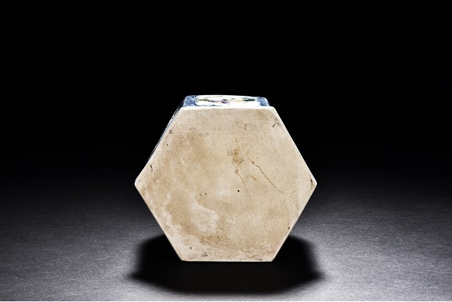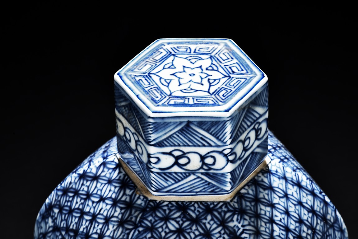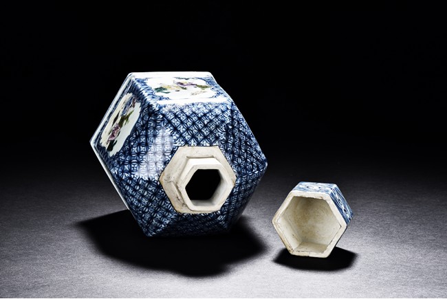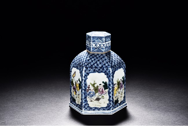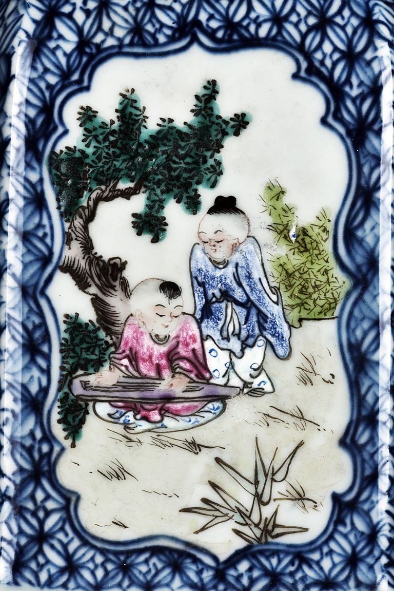 Each of the six roundels depicts two children engaging in leisurly activity in famille rose, all aganist a dense repeated blue and white motif. The cover is of hexagonal shape.
