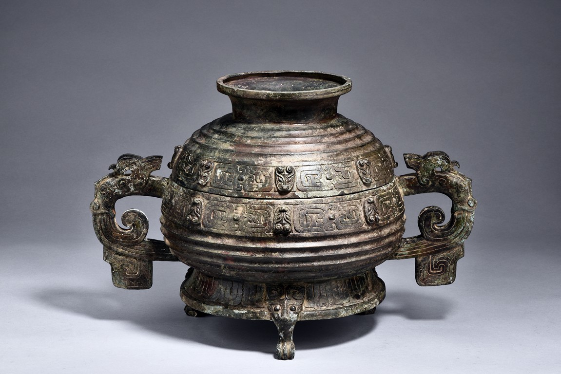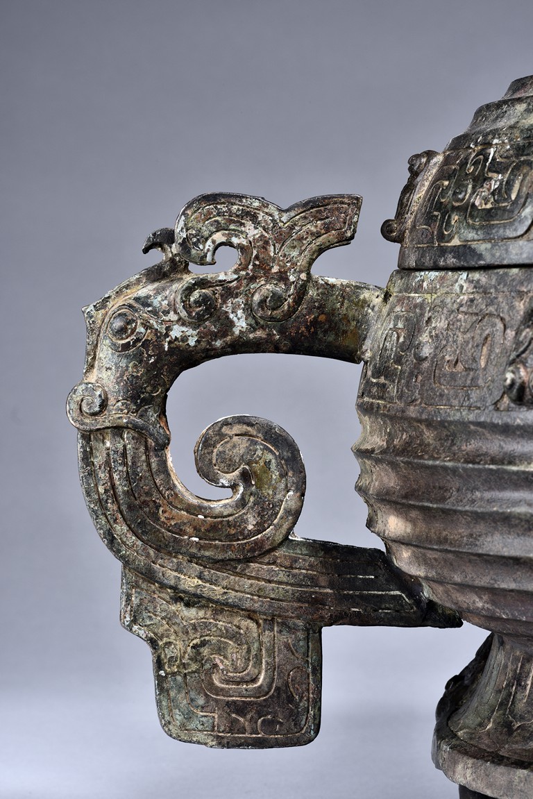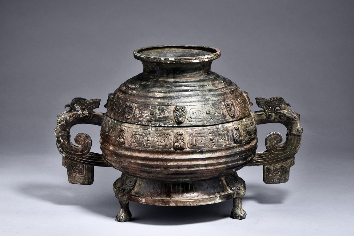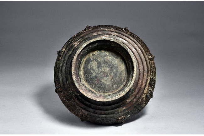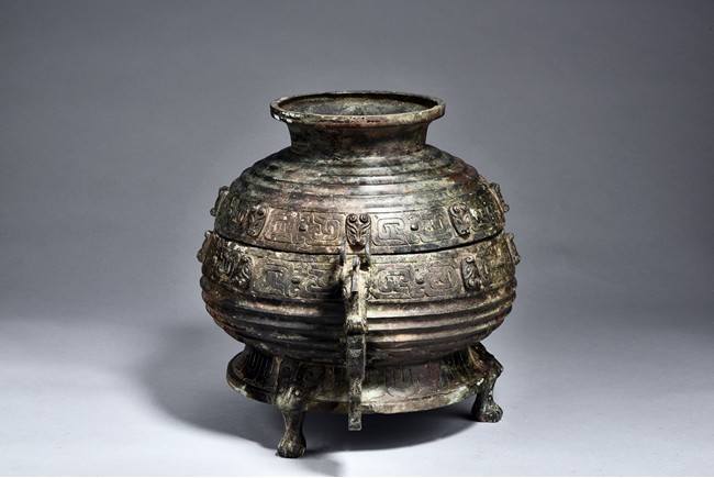 Supported on three animal mask surmounted legs, the compressed globular body is encircled by horizontal grooves below a band of alternating stylized dragon and raised mythical beast mask motif, and sides with a pair of arched handles in the form of stylized animal. The domed-shaped matching cover is surmounted with a flared finial with inscriptions.