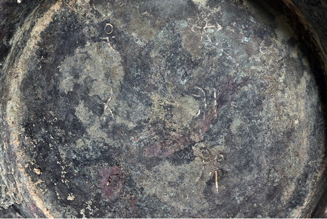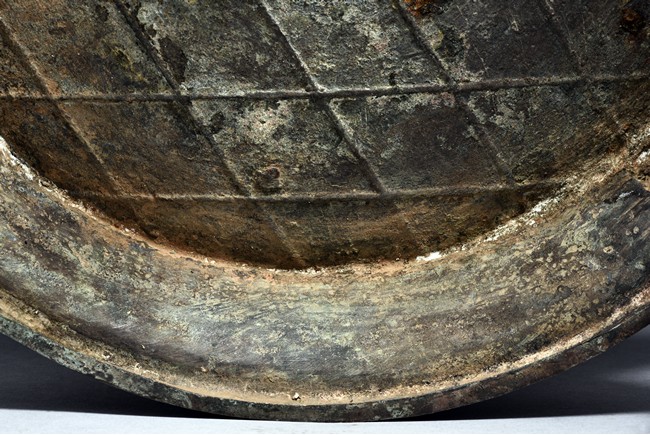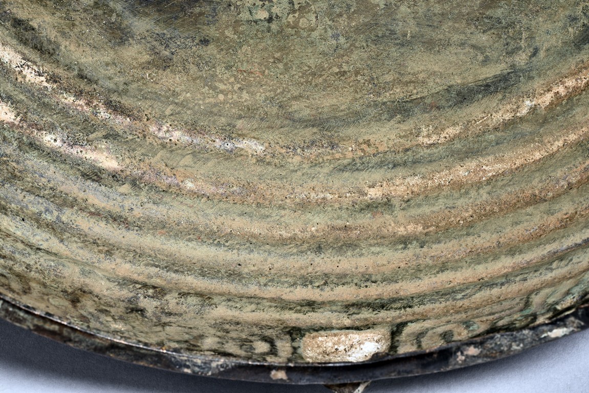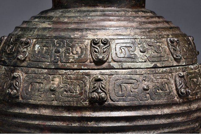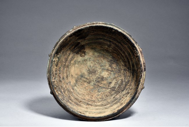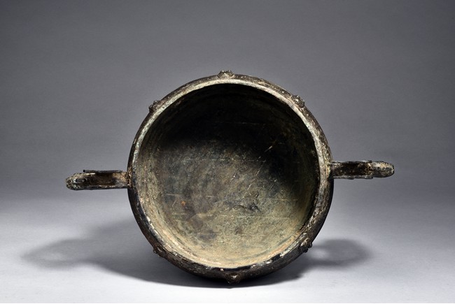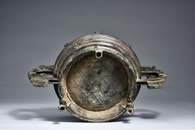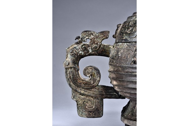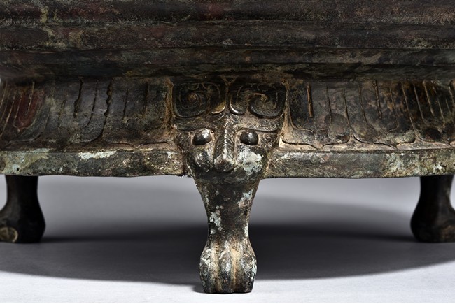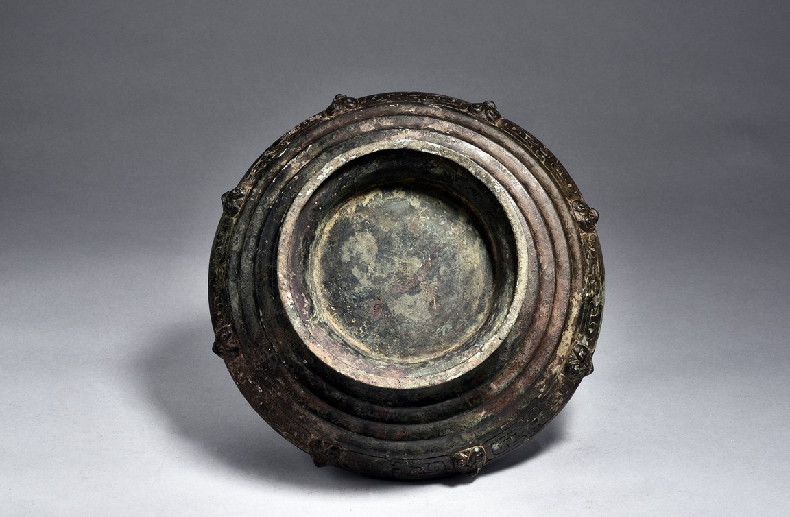 Supported on three animal mask surmounted legs, the compressed globular body is encircled by horizontal grooves below a band of alternating stylized dragon and raised mythical beast mask motif, and sides with a pair of arched handles in the form of stylized animal. The domed-shaped matching cover is surmounted with a flared finial with inscriptions.