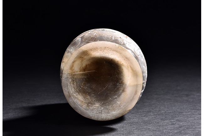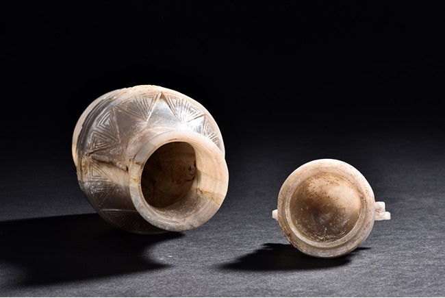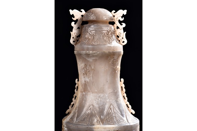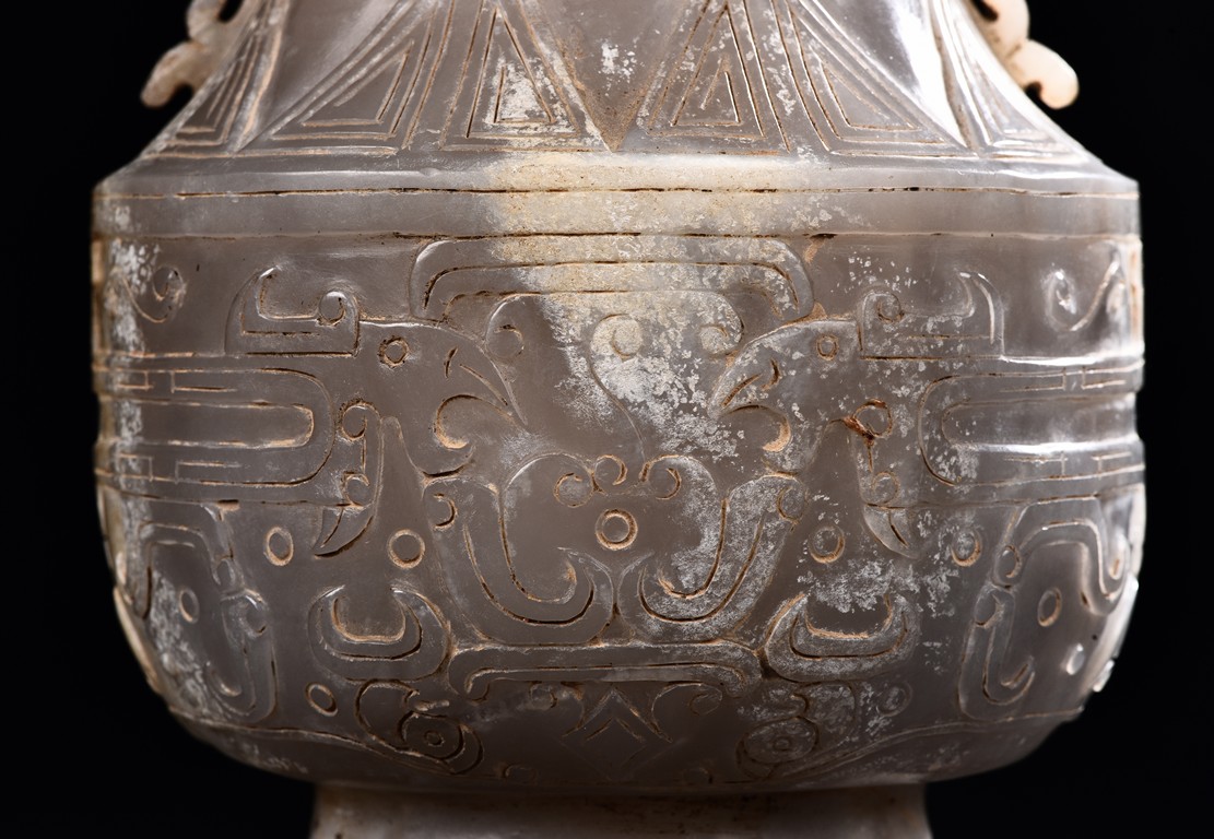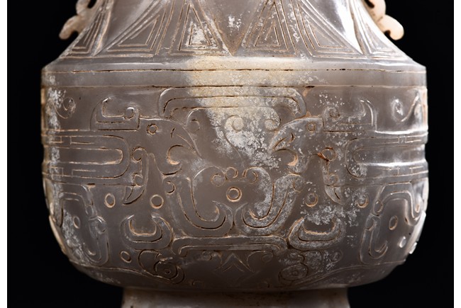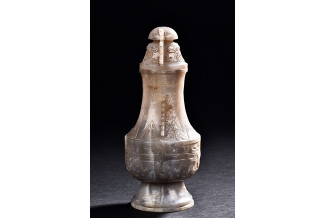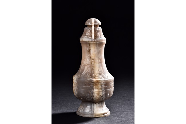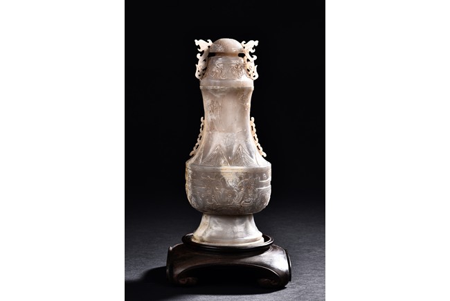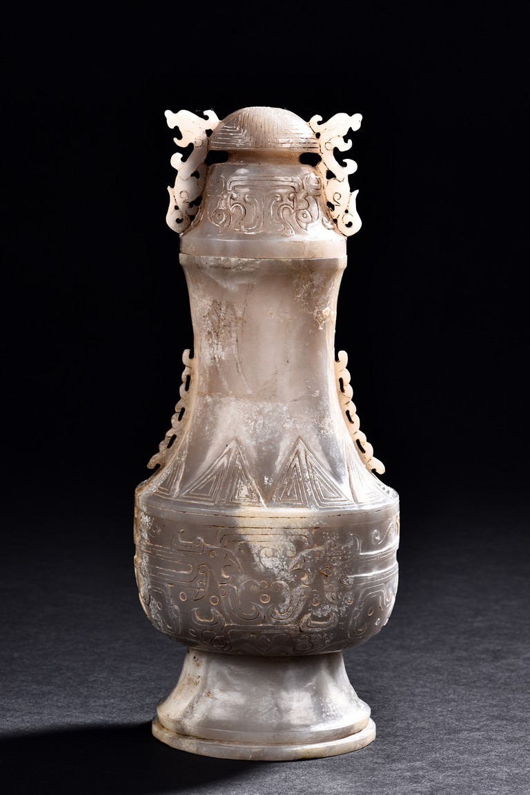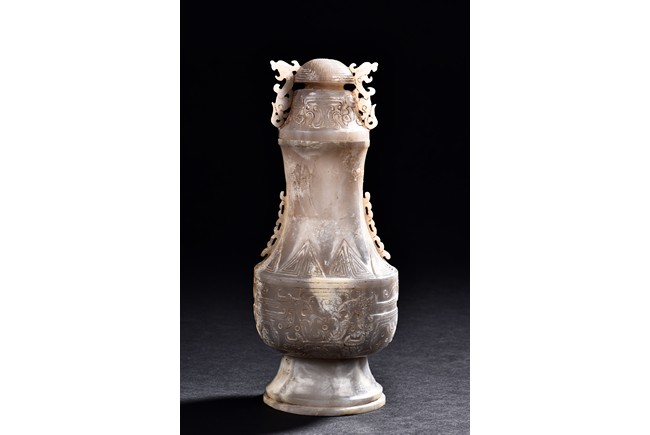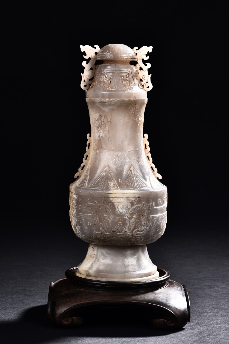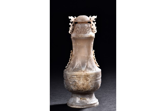 Rising from a splayed circular foot, the body with confronting stylized mythical beast pattern, the neck long and waisted, with a cover topped with domed finial.