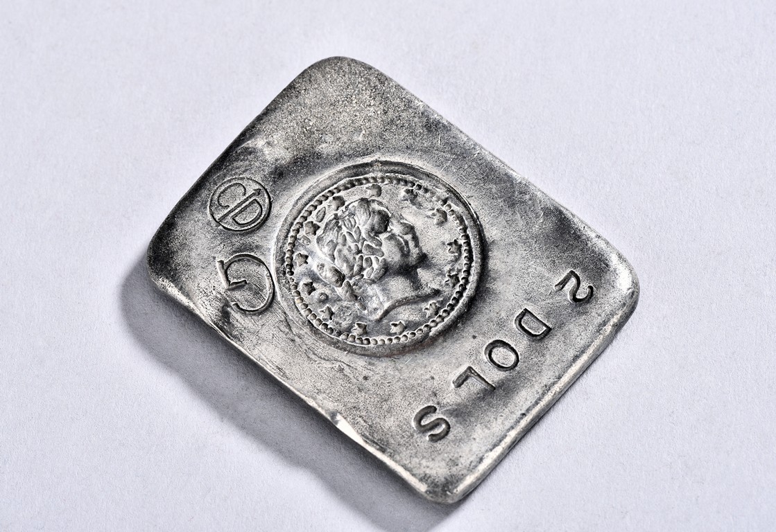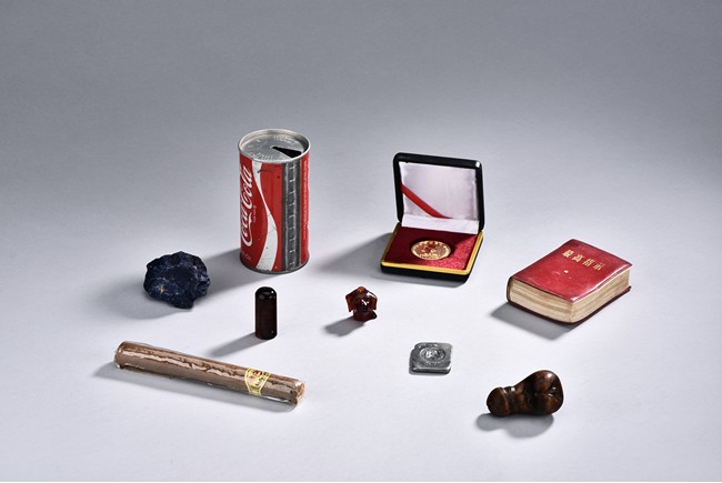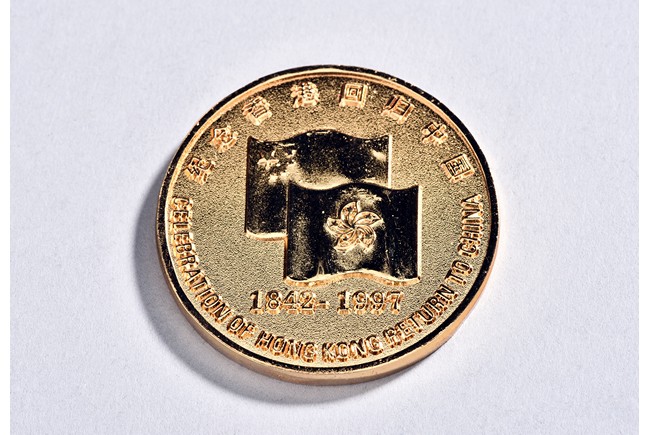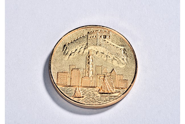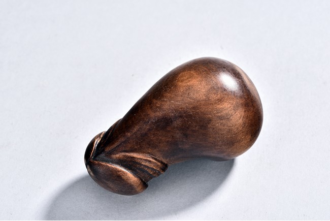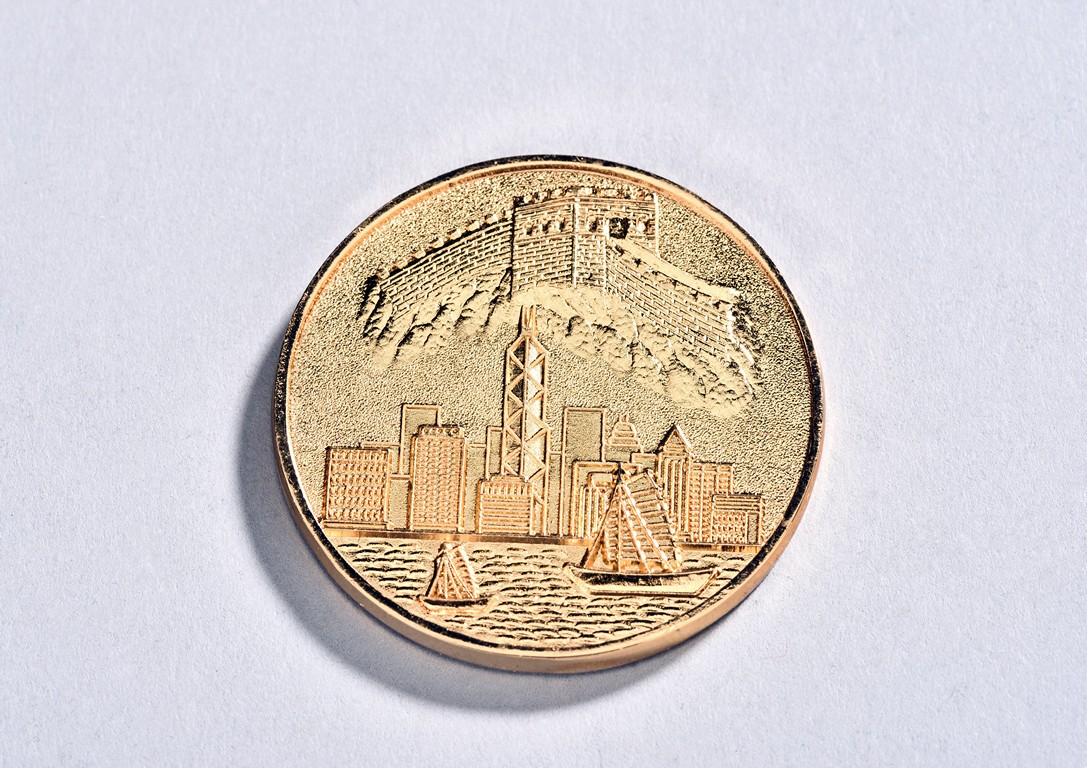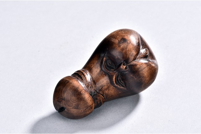 Shown standing on base with golden toad on his left, his right hand holding a coin, wearing long robes exposing belly, the face with laughing expression with mouth open, hair finely incised.