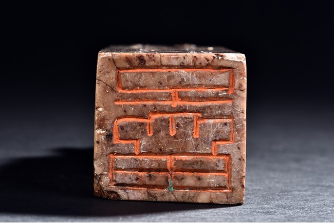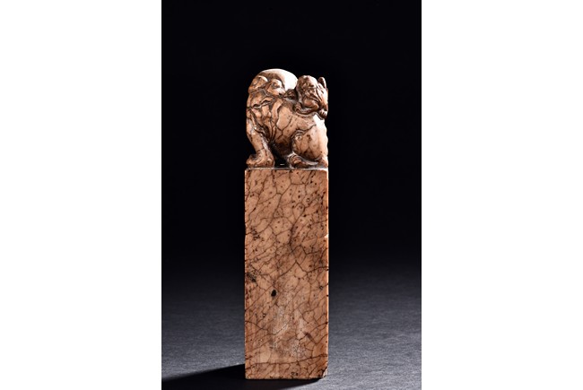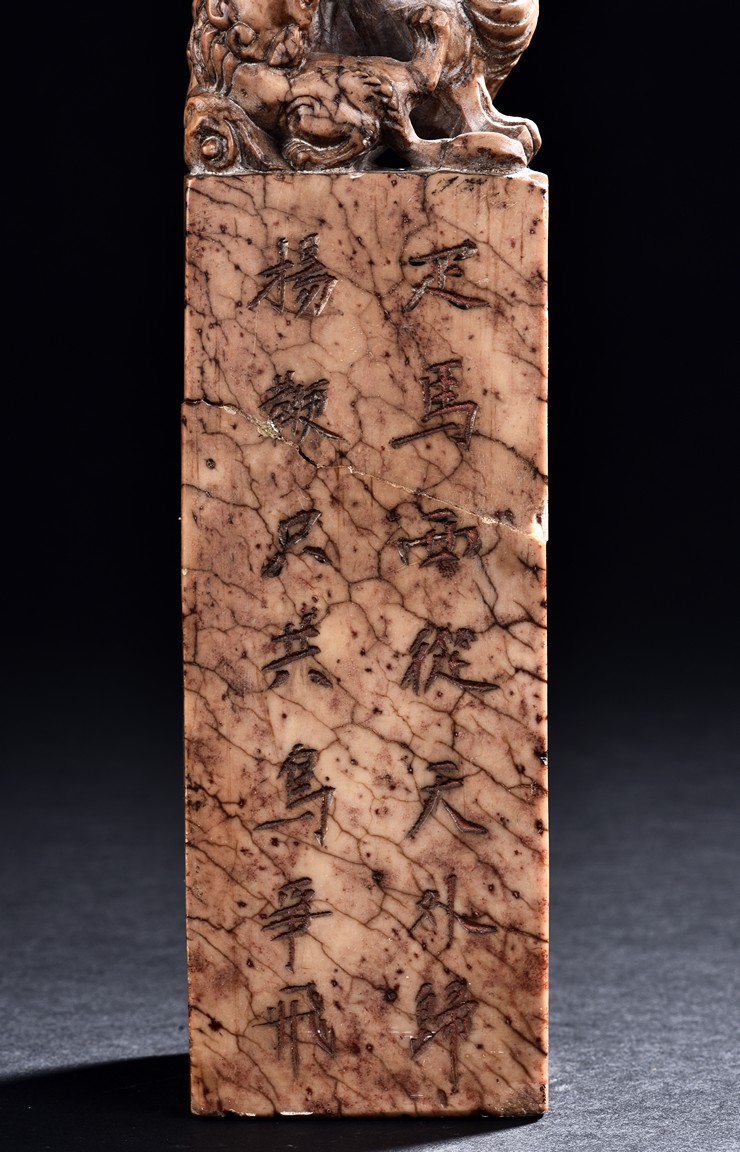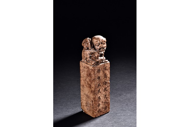 The soapstone seal carved with a mother Buddhist lion playing with two infant lions, the body of seal with inscriptions.