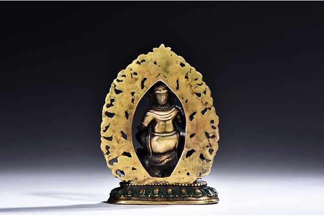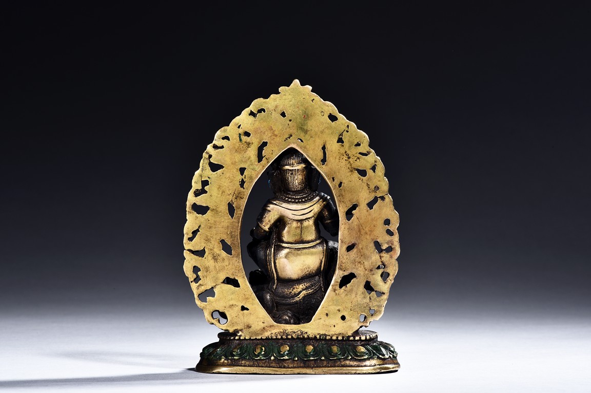 Set on a lotus throne and enamelled in red, green, and blue, the bodhisattva is shown standing upon a buddhist lion, his large belly exposed, face with stern expression and wearing pointed crown, backed by a large throne back-slab.