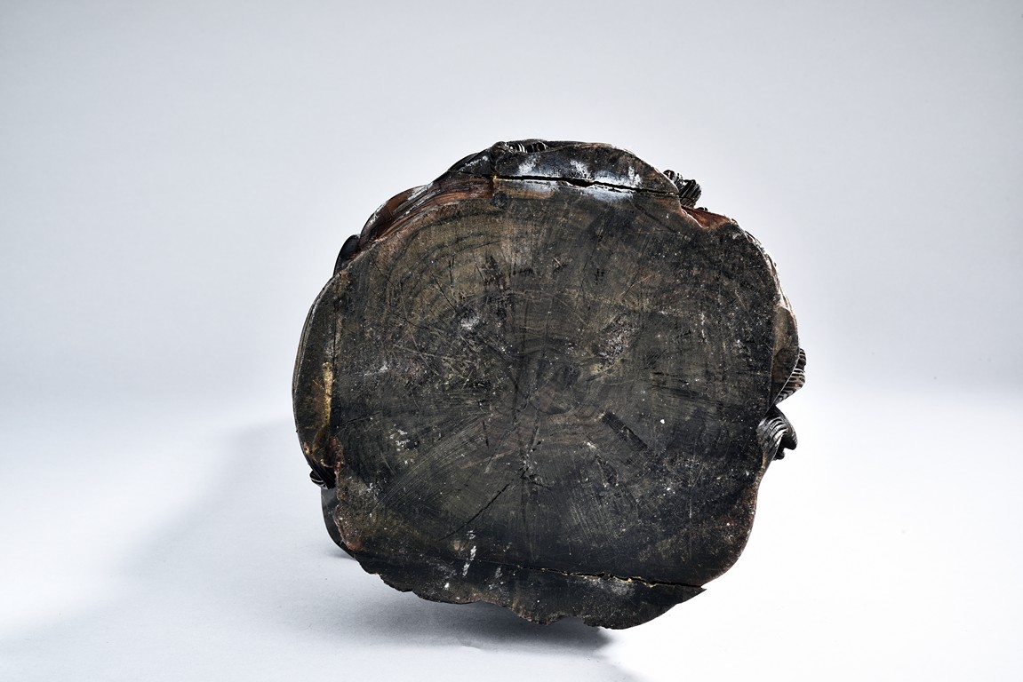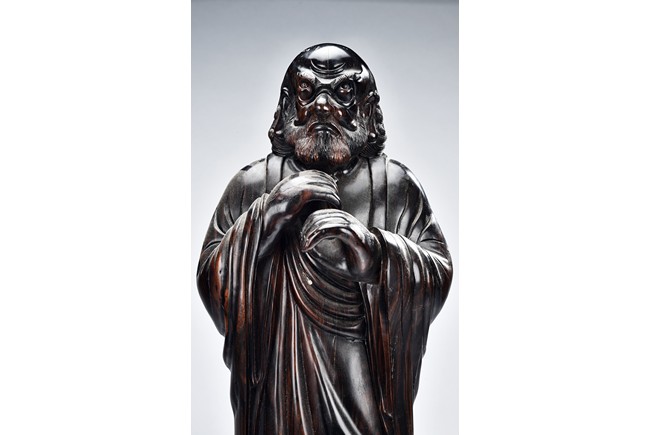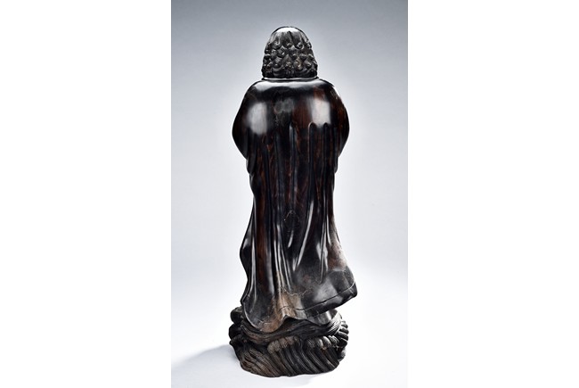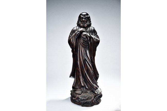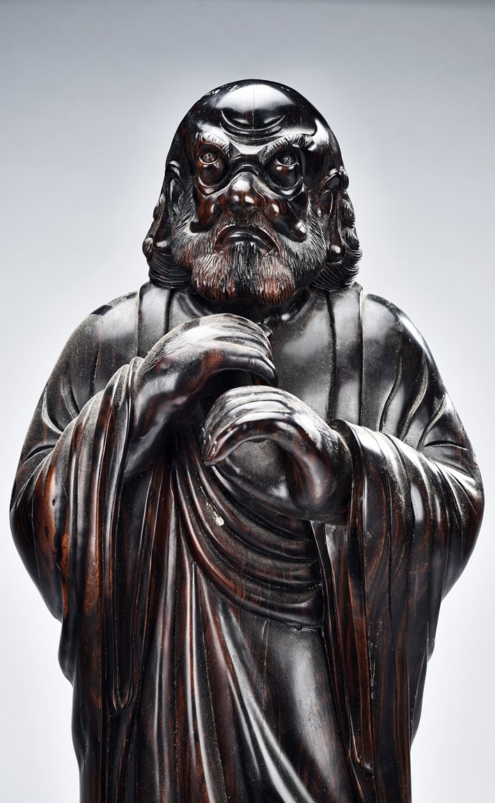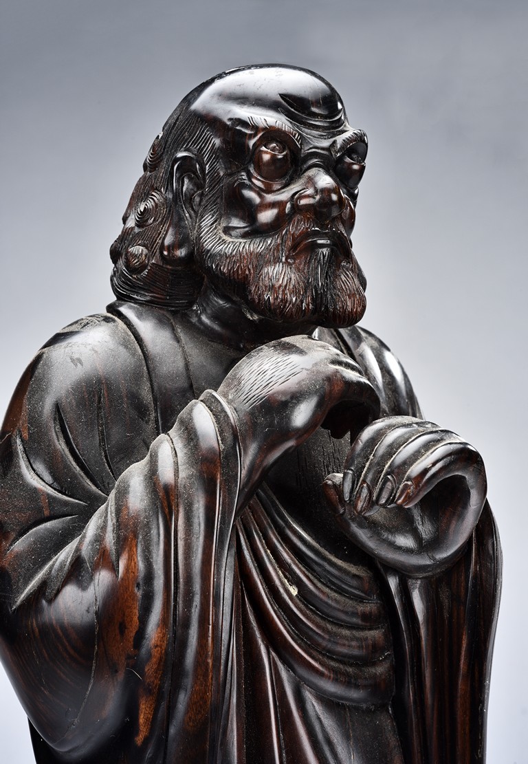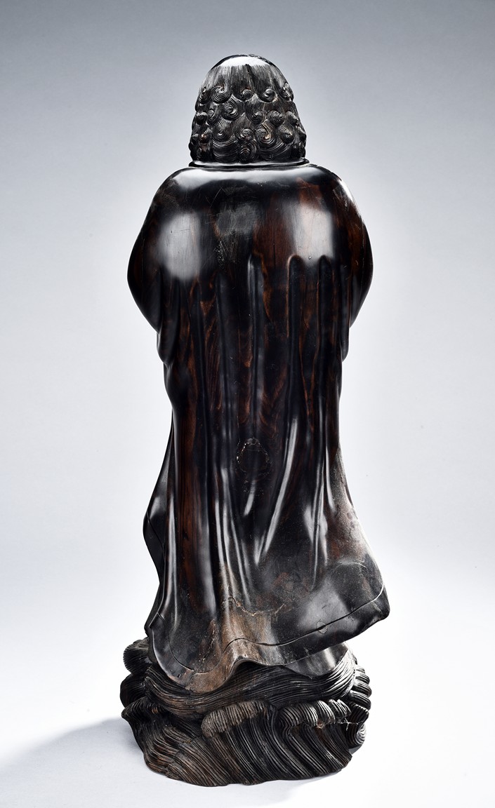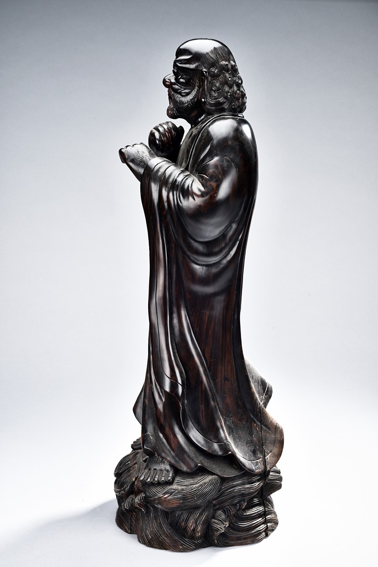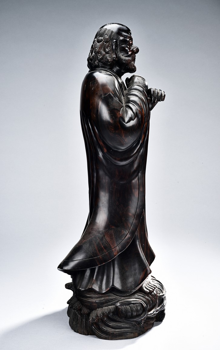 Carved standing upon wave-like base, the figure is shown wearing long robe with heavy holds, two hands raised as if holding a staff, the intense face with prominent eyes looking upward.