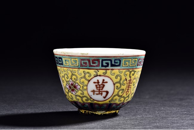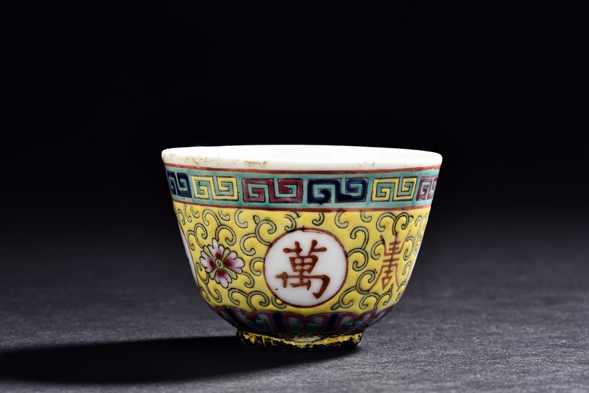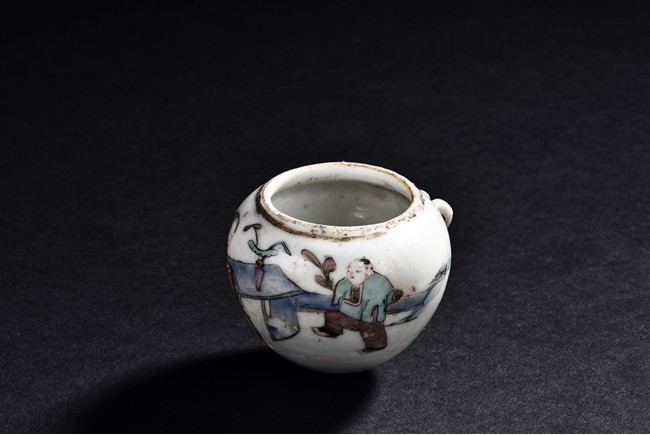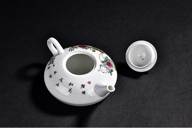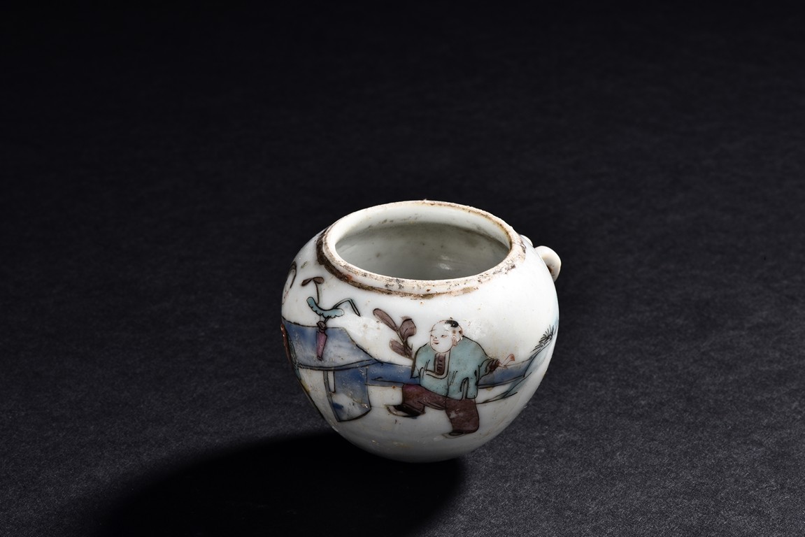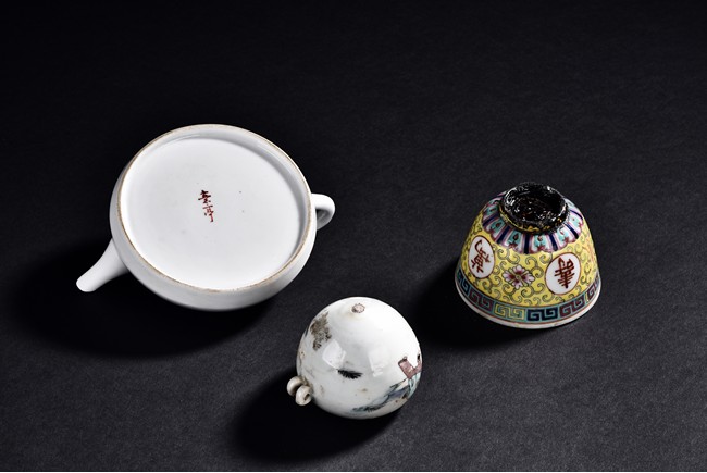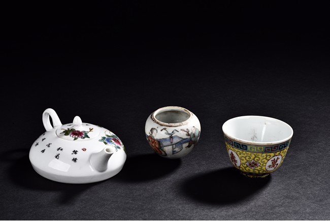 Comprising of a famille rose cup, a wucai water pot, and a famille rose teapot