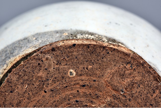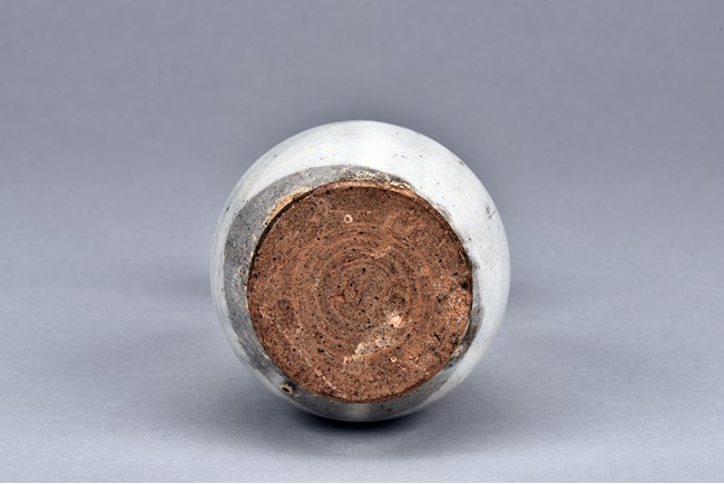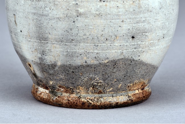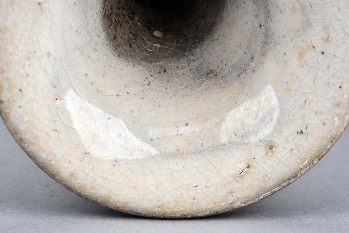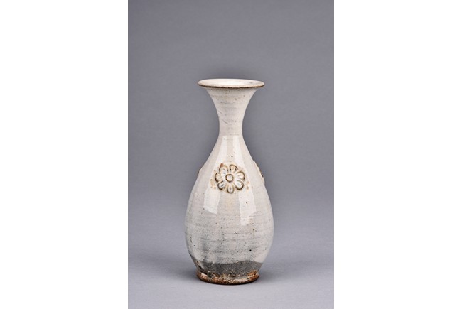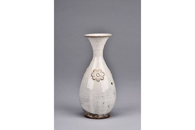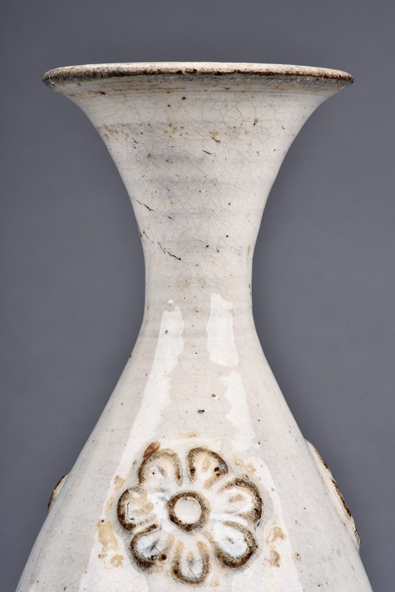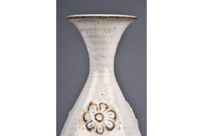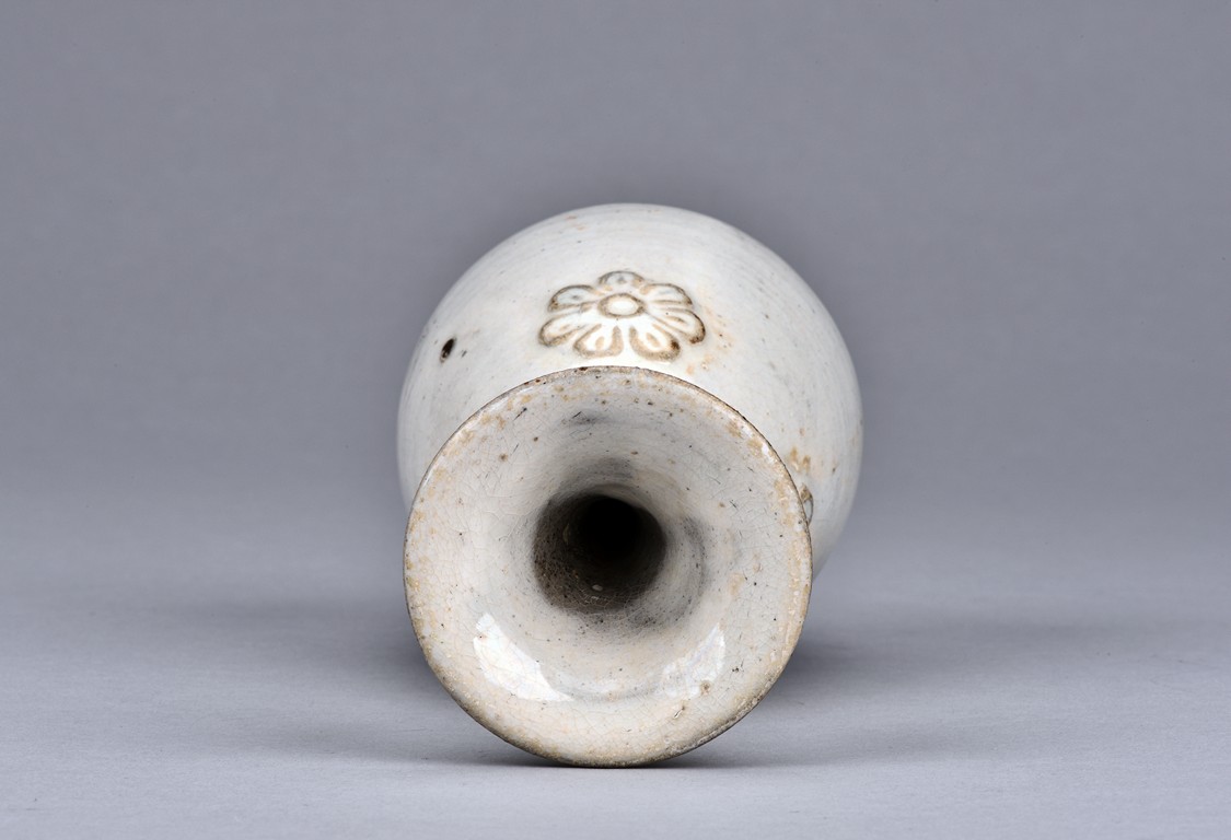 Overall glazed in white, the bottom unglazed, the waisted neck rising to flared rim, the upper body potted with flower decoration in relief.