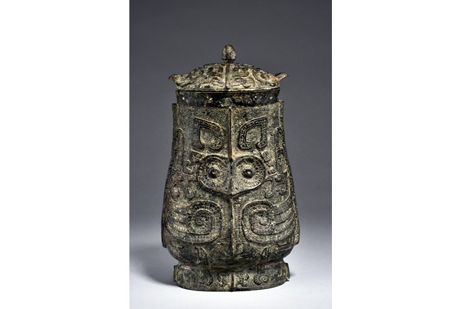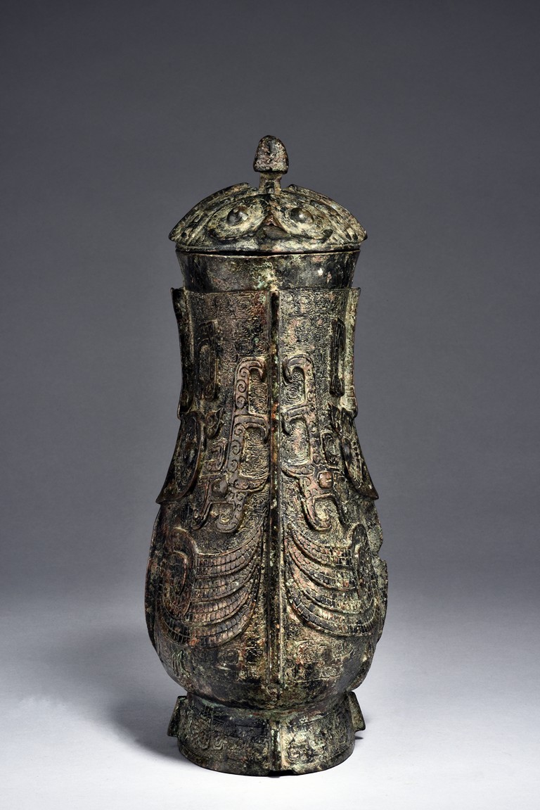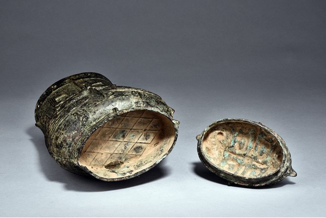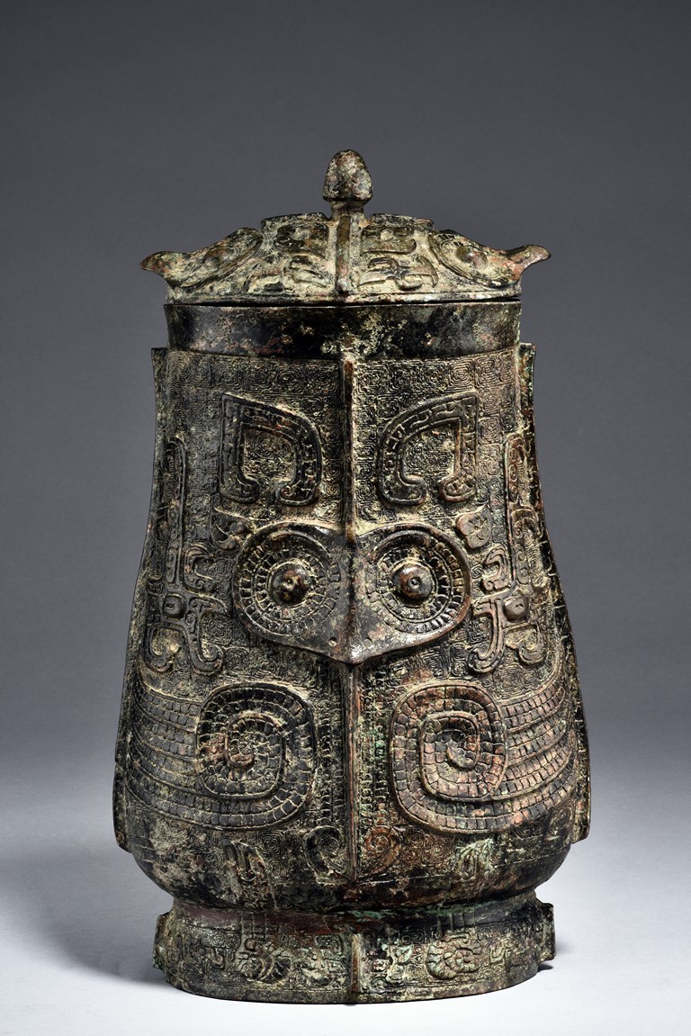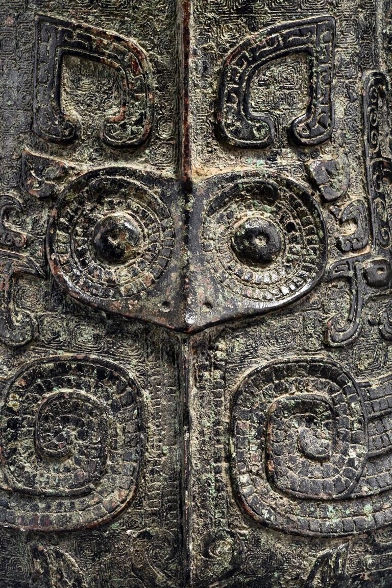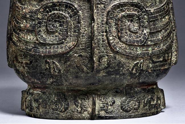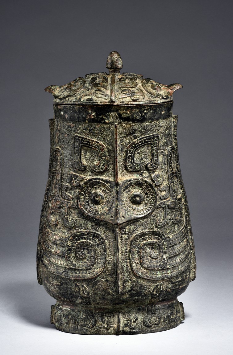 Of oval section and pear shape, the front and back body cast with owl mask in the center seperated by a raised flange. The oval and domed shaped cover is finely cast with a pair of owl head, separated by raised flange and surmounted with a knob finial, all reserved on dense leiwen ground. The sides flanked by notched flanges. The slightly flared and short foot with decoration continued down from the body.