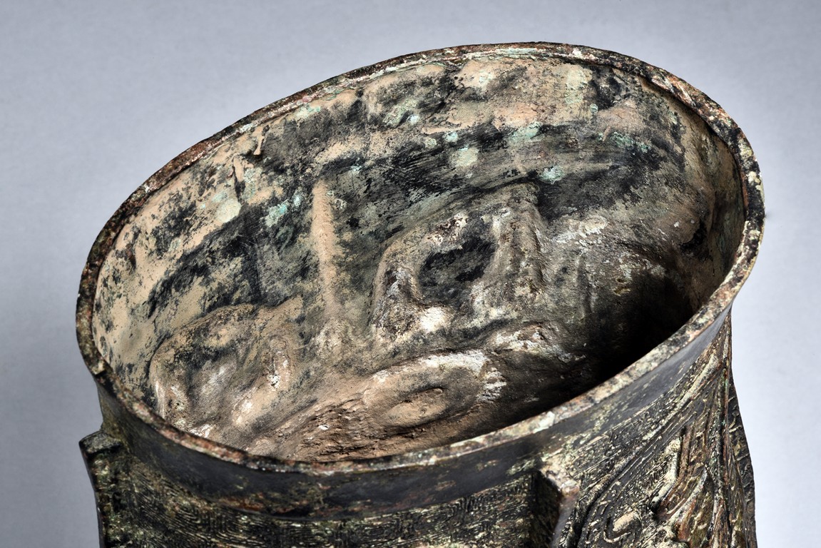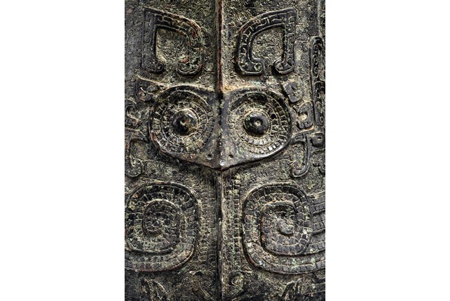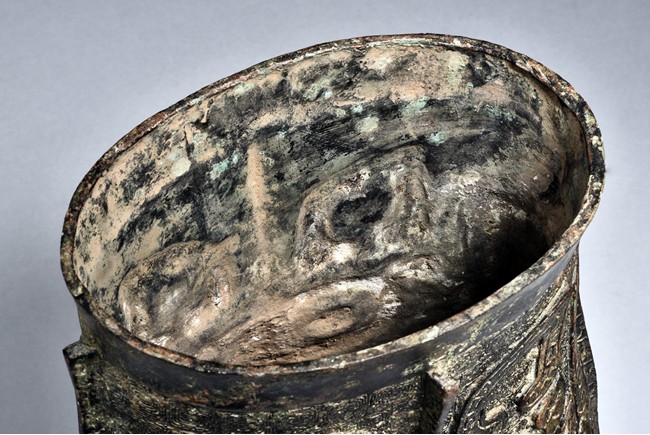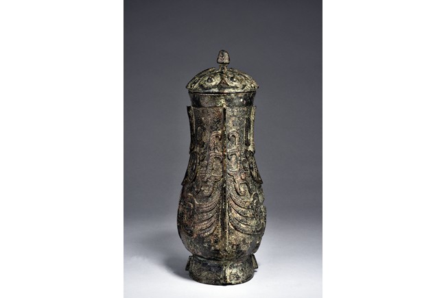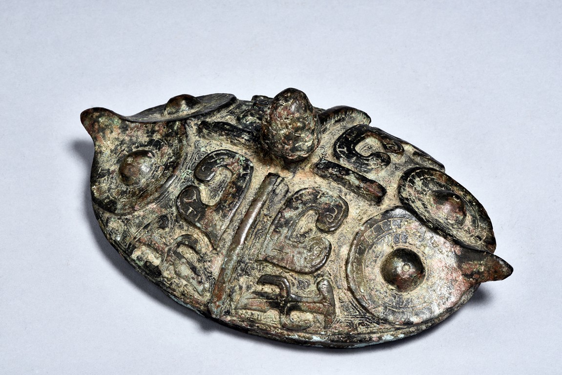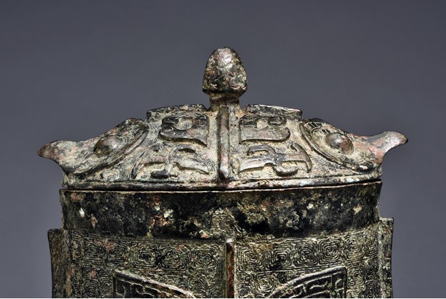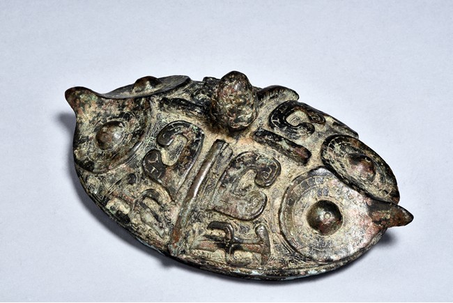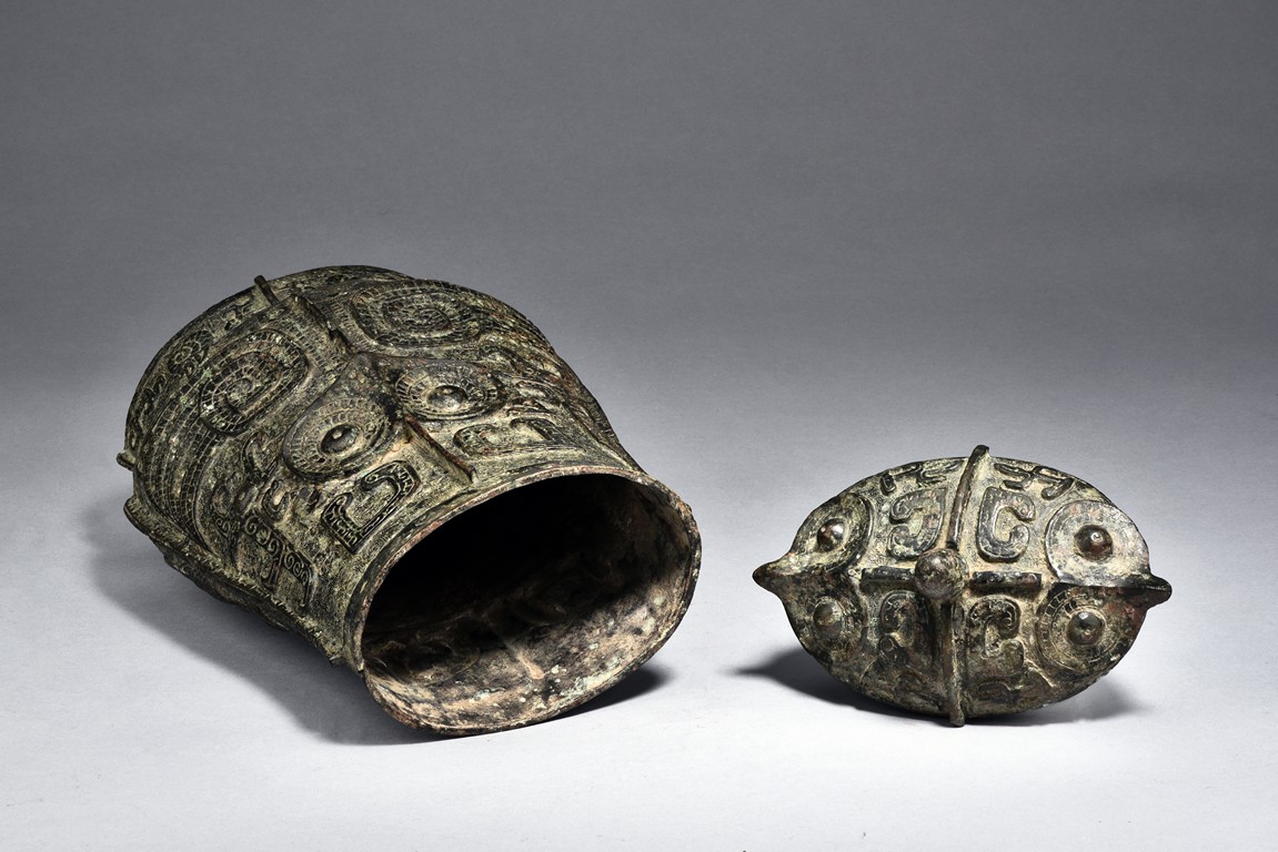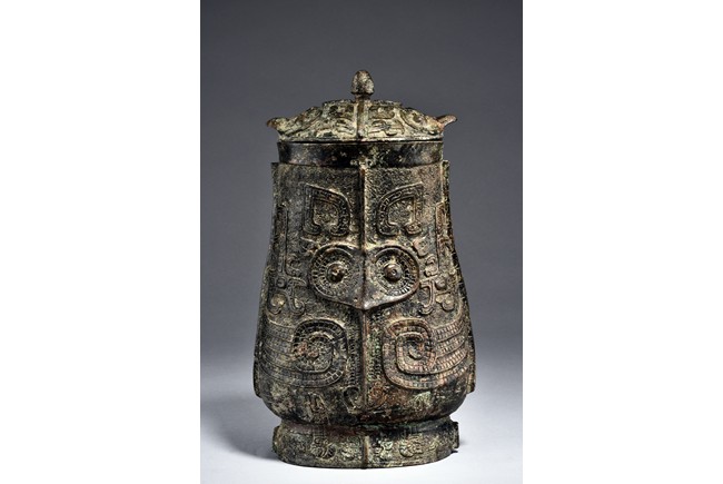 Of oval section and pear shape, the front and back body cast with owl mask in the center seperated by a raised flange. The oval and domed shaped cover is finely cast with a pair of owl head, separated by raised flange and surmounted with a knob finial, all reserved on dense leiwen ground. The sides flanked by notched flanges. The slightly flared and short foot with decoration continued down from the body.