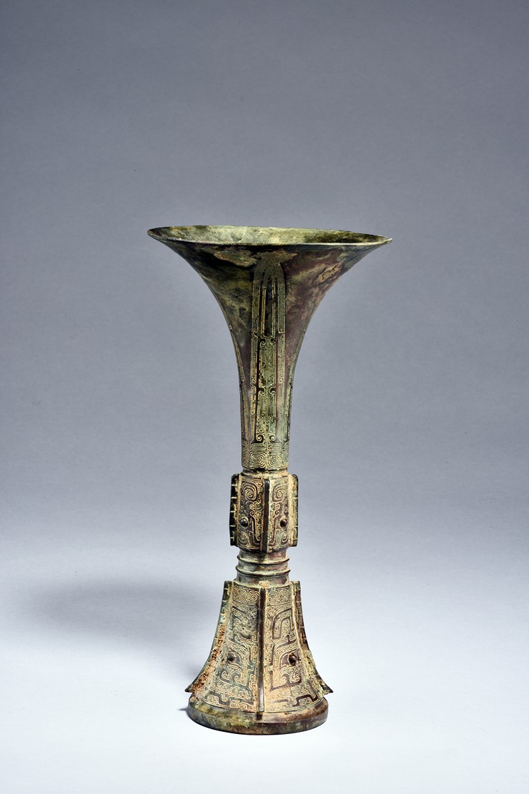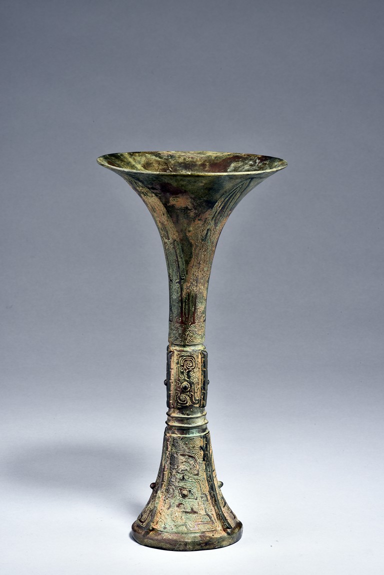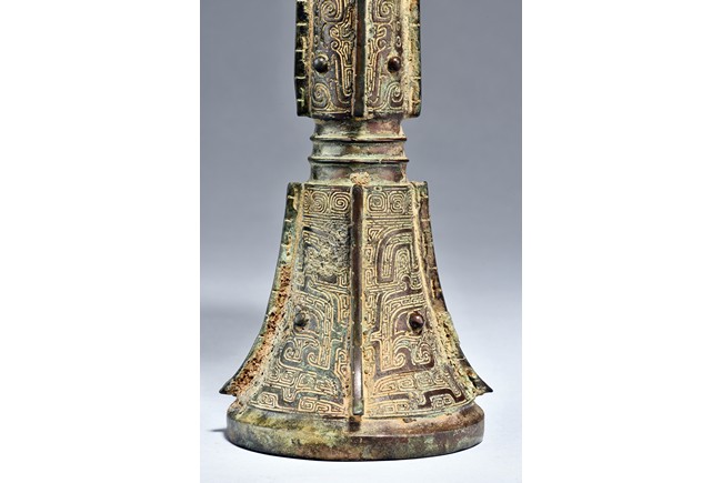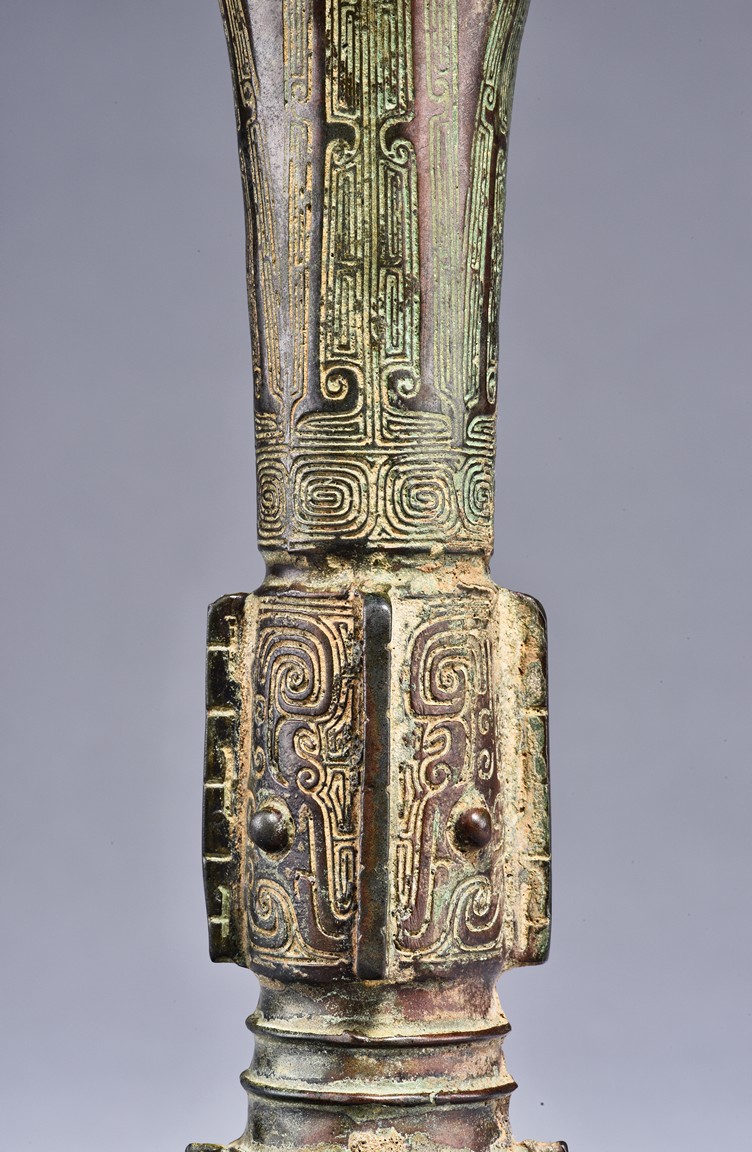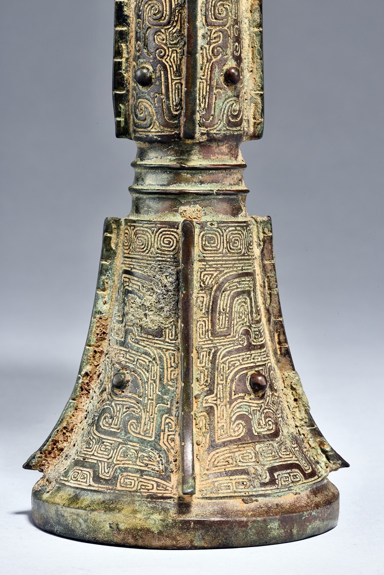 The neck is of trumpet form and finely cast with four blades rising from a band of leiwen, the middle section and spread foot cast with taotie masks decorated with leiwen and separated by notched flanges, with a kui dragons motif on the foot, all reserved on leiwen grounds. The bronze is of mottled grey and malachite patina, and entensive encrustation on the interior.
