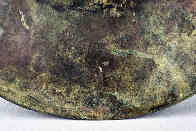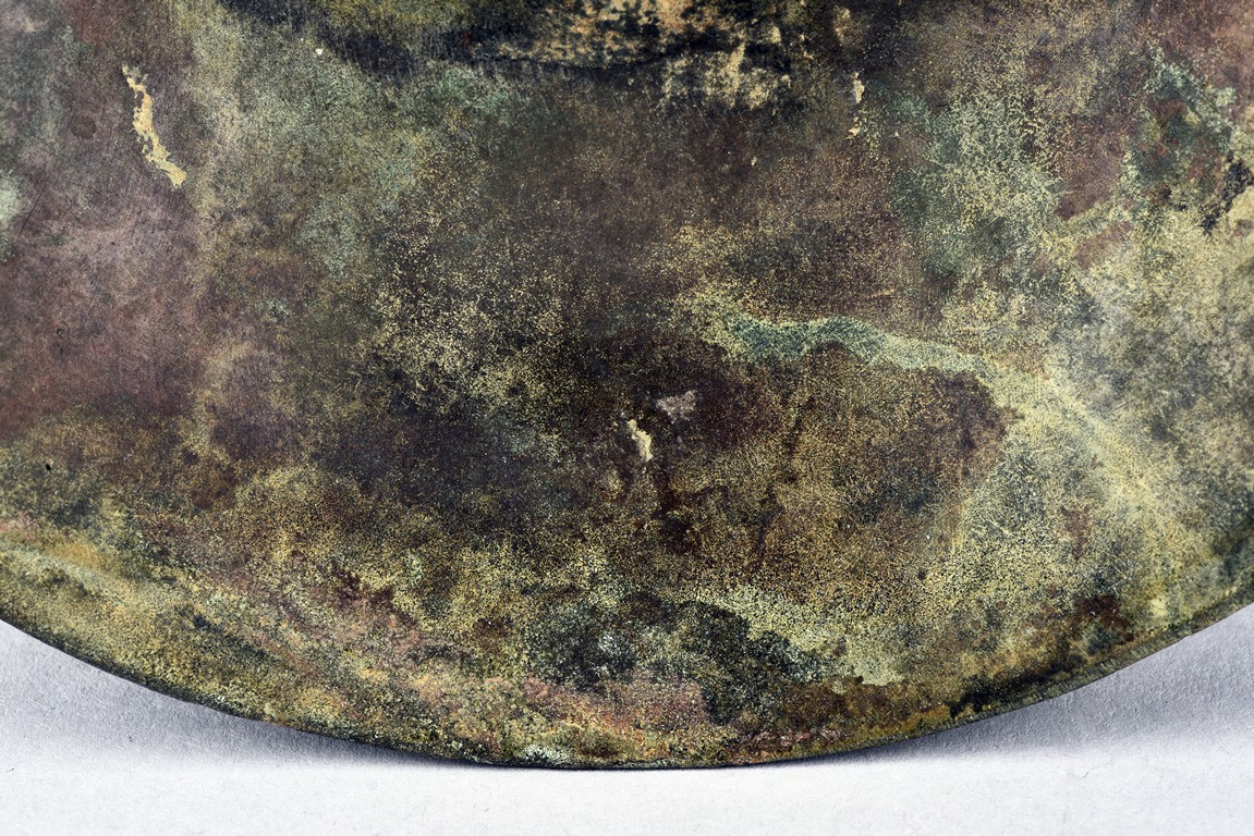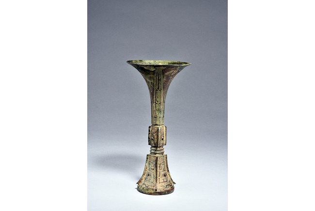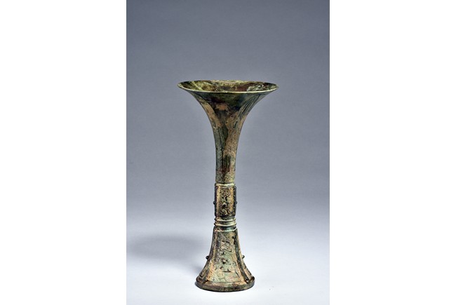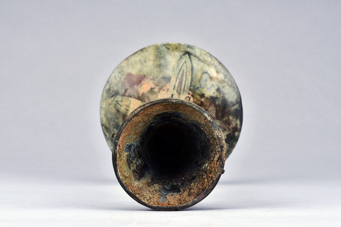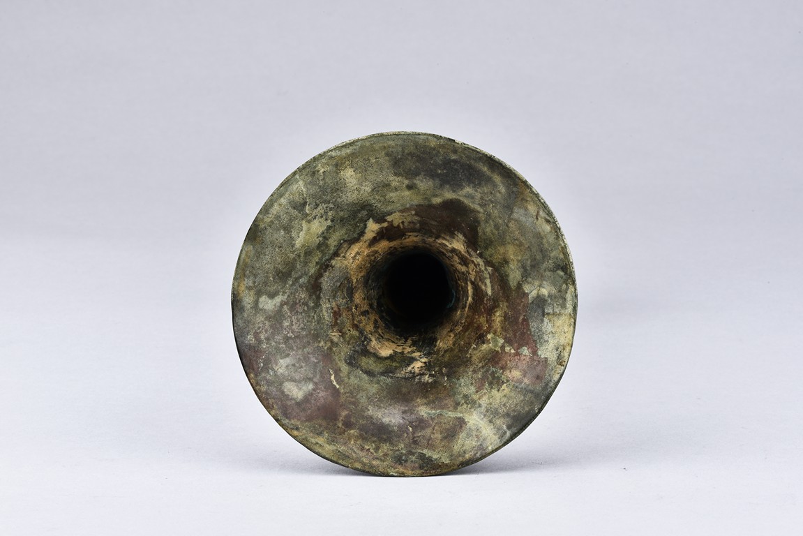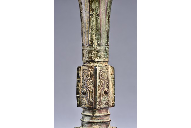 The neck is of trumpet form and finely cast with four blades rising from a band of leiwen, the middle section and spread foot cast with taotie masks decorated with leiwen and separated by notched flanges, with a kui dragons motif on the foot, all reserved on leiwen grounds. The bronze is of mottled grey and malachite patina, and entensive encrustation on the interior.