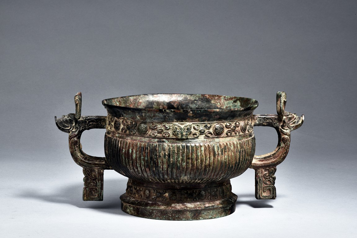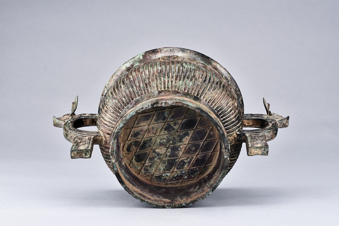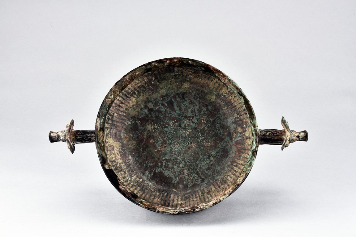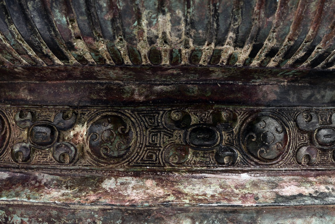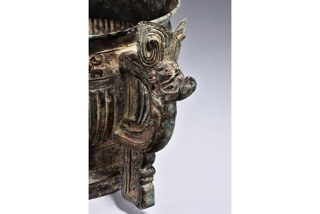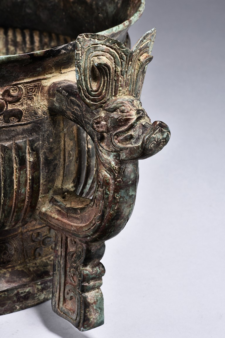 Raised on high foot ring, the body and foot cast with a band of raised whorl roundels and four crescent motif flanking a raised roundles, centered by a bovine mask on each side, with a band of vertical ribs on the body. The large handles are cast in the form of tusked animal heads with upright horns, swallowing birds whose beaks just emerge from their jaws; below the handles are decorated with bird's wings, bodies and tails. The bronze has mottled patina and extensive encrustation. The interior with eight character inscriptions.
