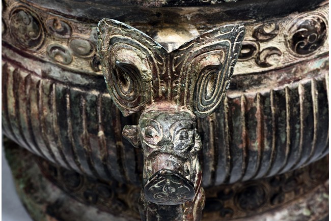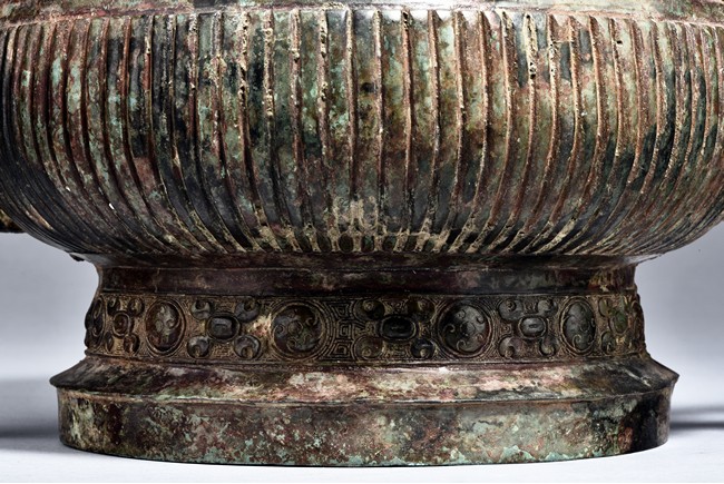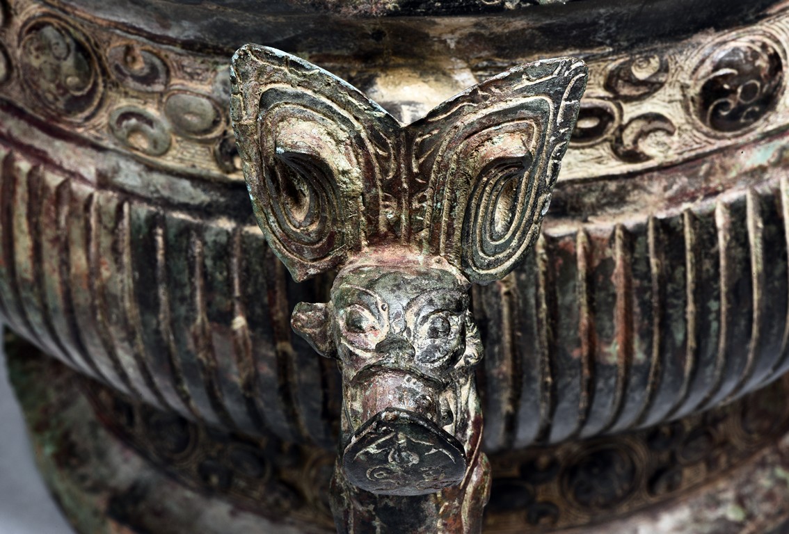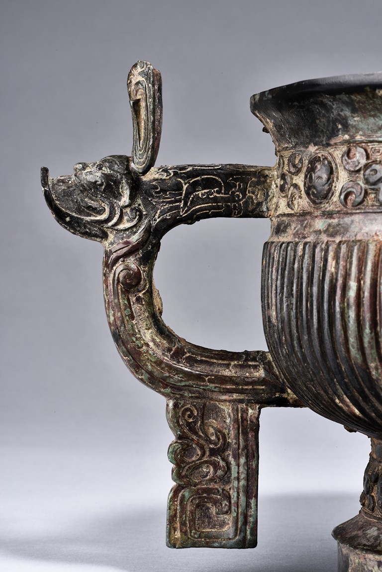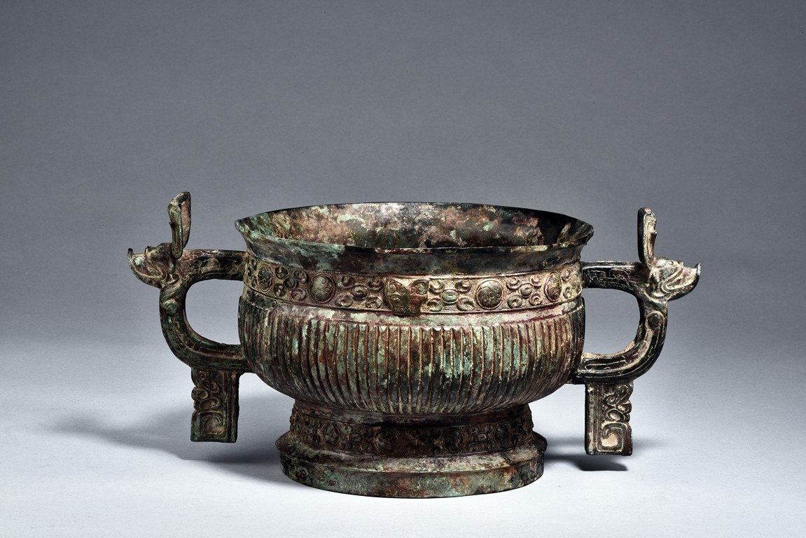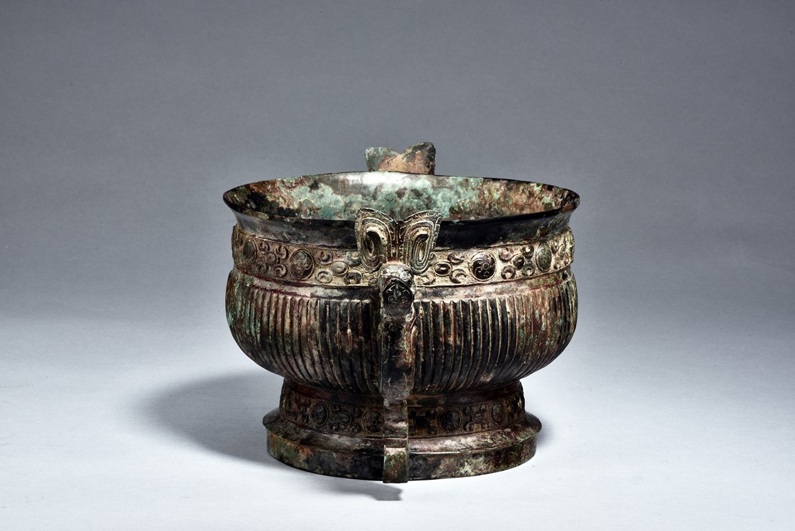 Raised on high foot ring, the body and foot cast with a band of raised whorl roundels and four crescent motif flanking a raised roundles, centered by a bovine mask on each side, with a band of vertical ribs on the body. The large handles are cast in the form of tusked animal heads with upright horns, swallowing birds whose beaks just emerge from their jaws; below the handles are decorated with bird's wings, bodies and tails. The bronze has mottled patina and extensive encrustation. The interior with eight character inscriptions.
