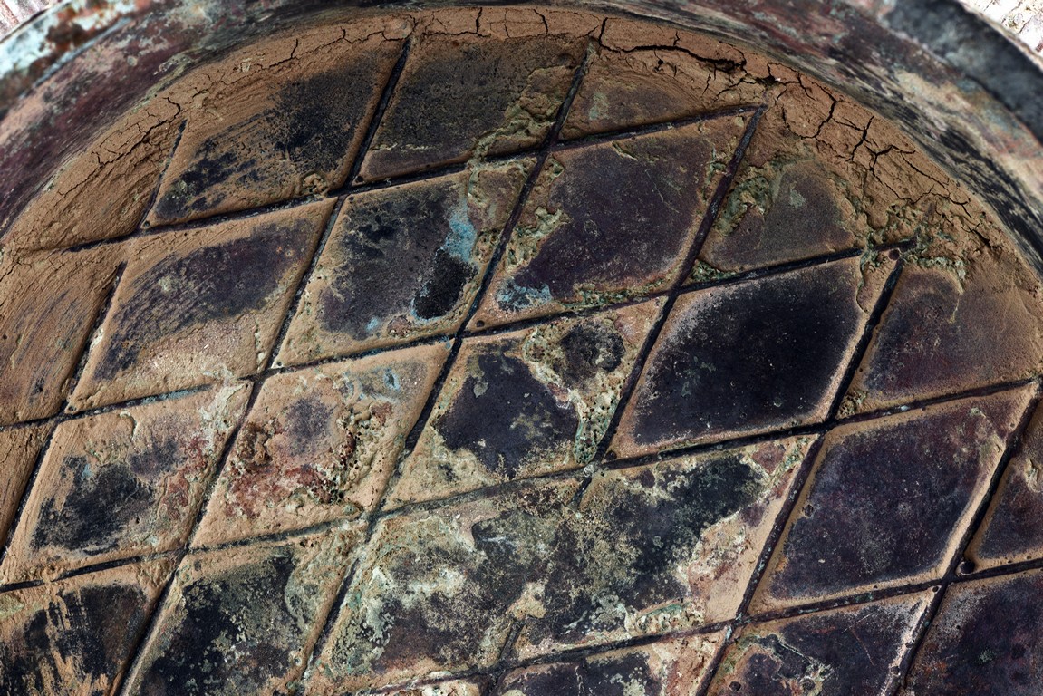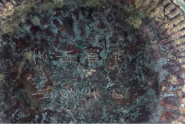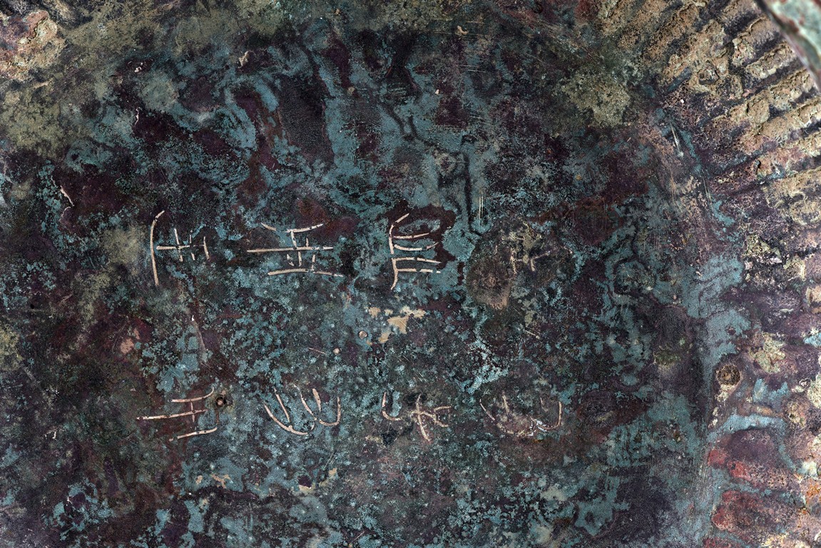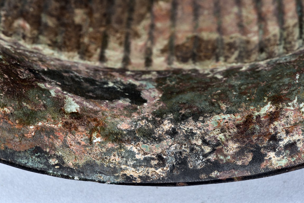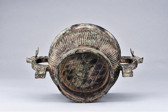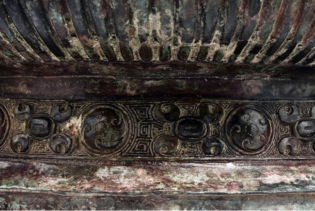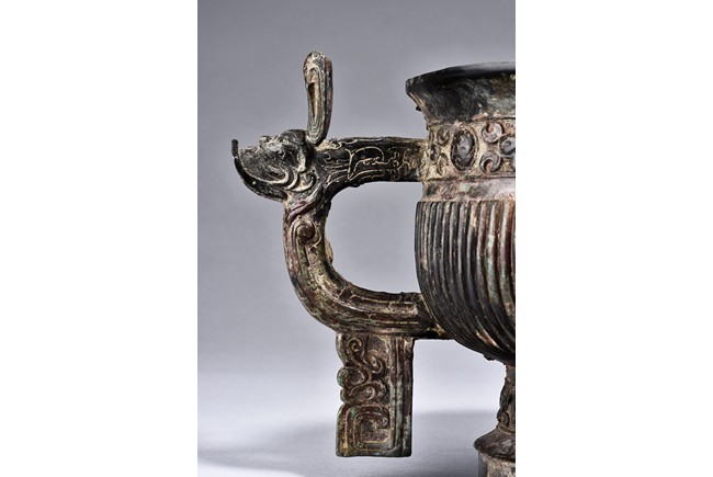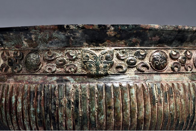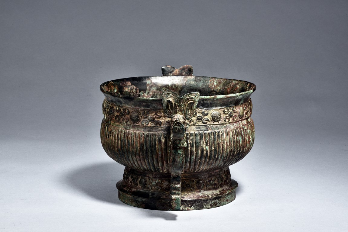 Raised on high foot ring, the body and foot cast with a band of raised whorl roundels and four crescent motif flanking a raised roundles, centered by a bovine mask on each side, with a band of vertical ribs on the body. The large handles are cast in the form of tusked animal heads with upright horns, swallowing birds whose beaks just emerge from their jaws; below the handles are decorated with bird's wings, bodies and tails. The bronze has mottled patina and extensive encrustation. The interior with eight character inscriptions.