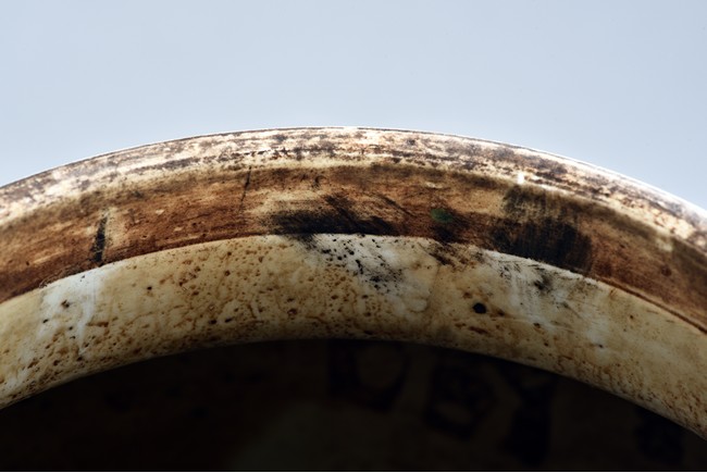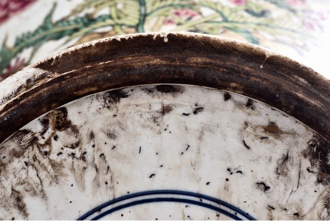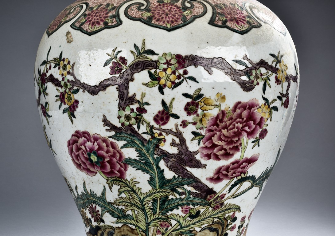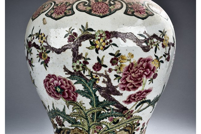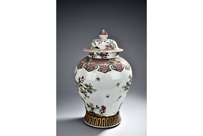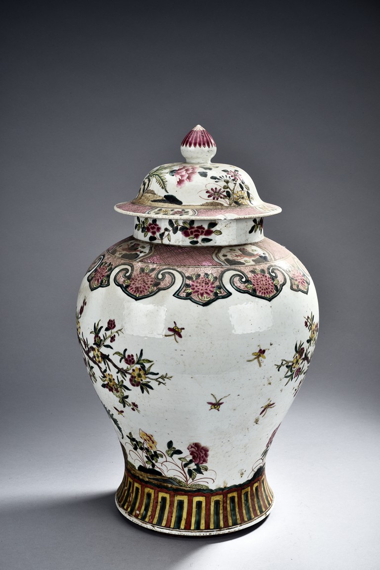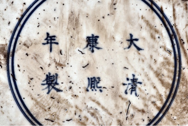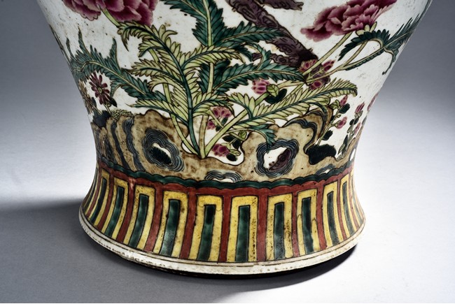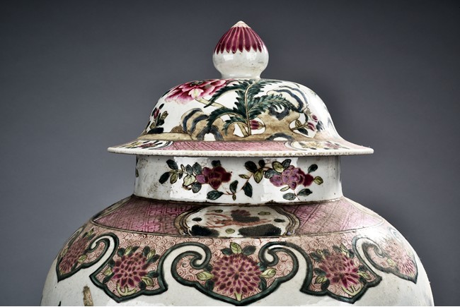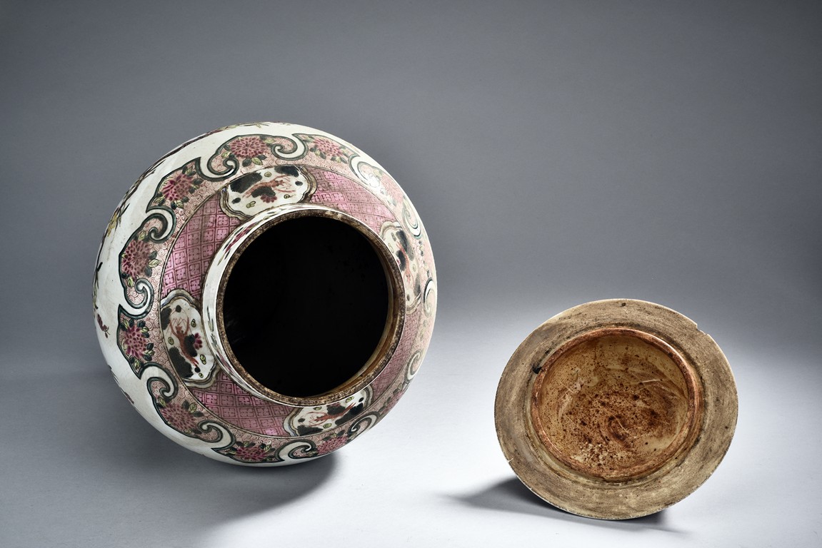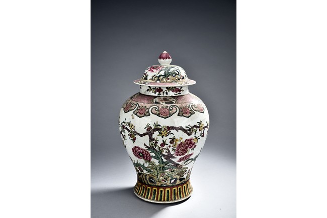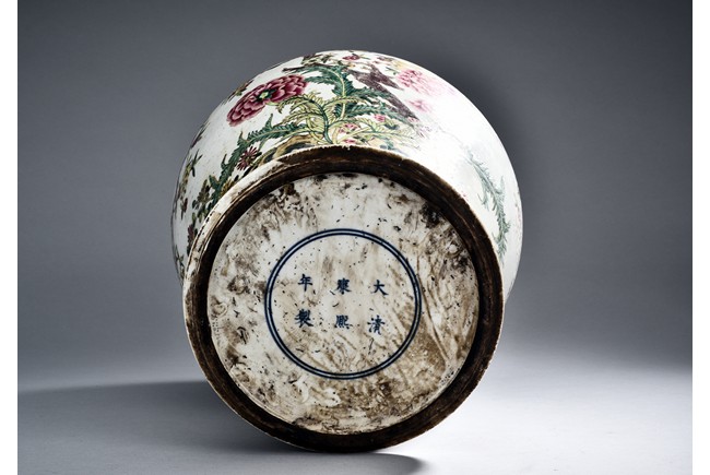 Painted on the broad body with garden scene of plum and peonies issuing from rockbase, the cover of domed form, topped with a lotus-bud finial. The bottom bears six character 'Kang Xi' mark within circle.