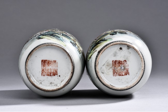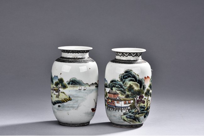 A PAIR OF FAMILLE ROSE JARS 山水瓶 一對