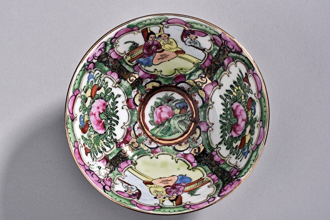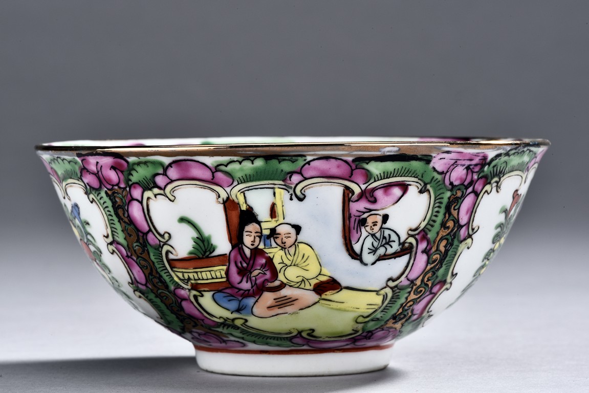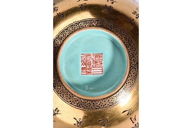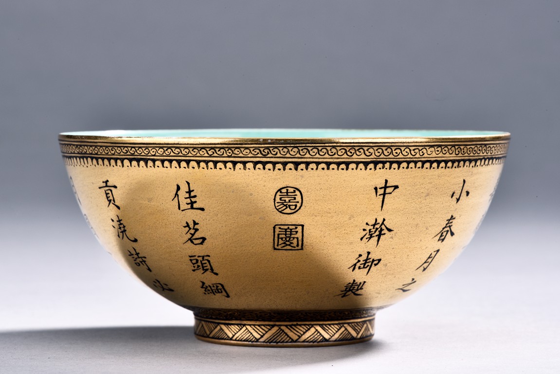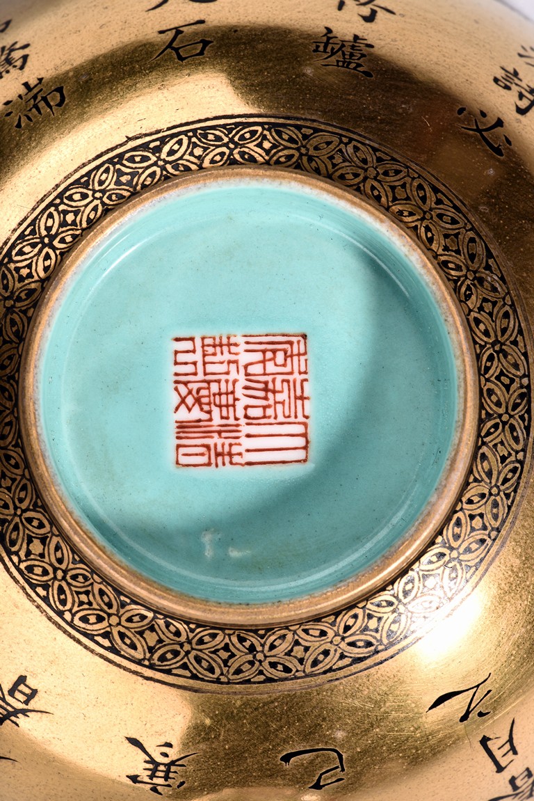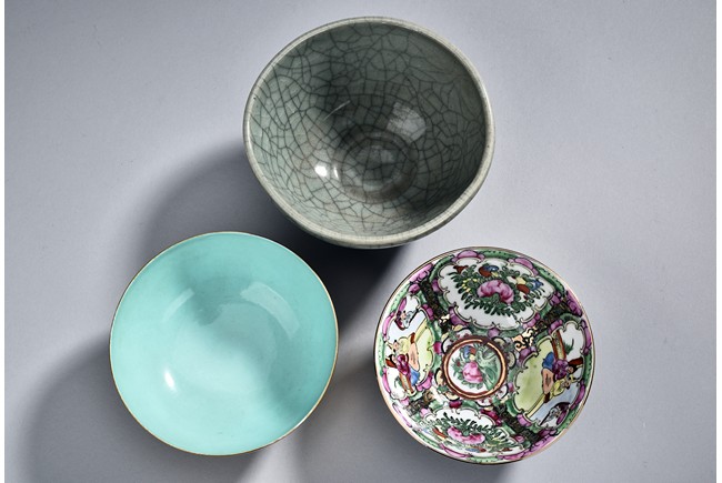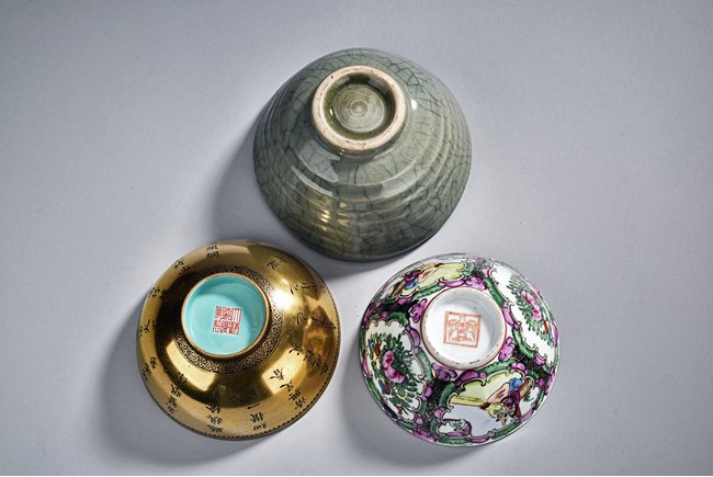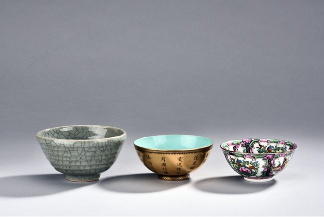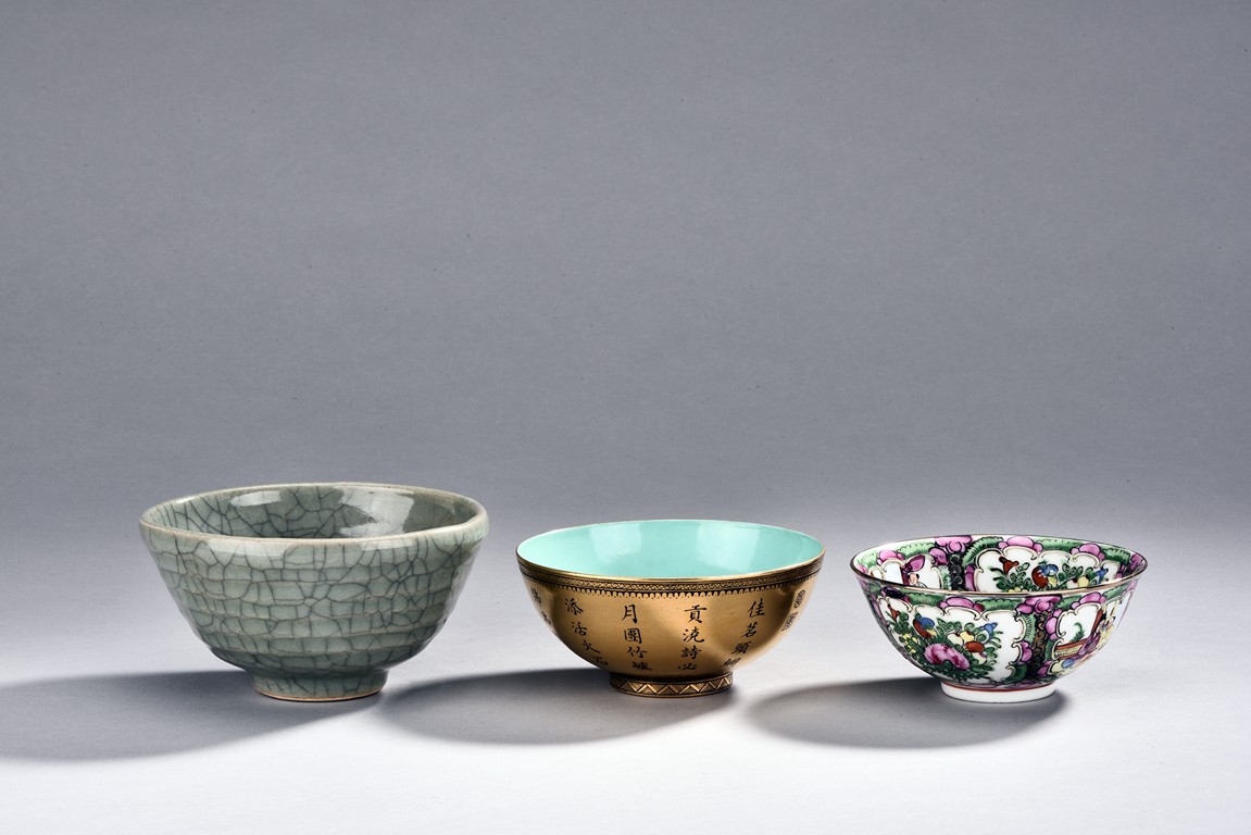 Comprising of a celadon bowl, a golden ground bowl with chinese inscription, and a wucai bowl