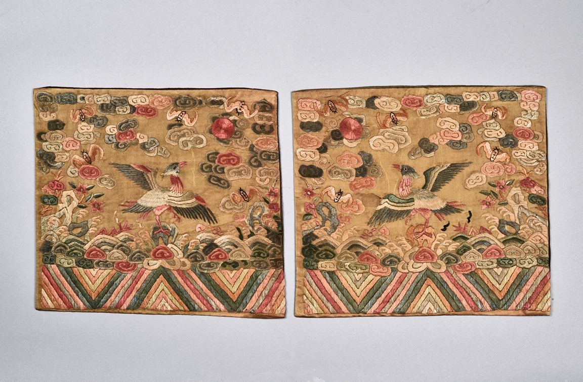 A PAIR OF EMBROIDERED SILK CIVIL OFFICIAL'S RANK BADGES 清 刺繡文官補子兩張