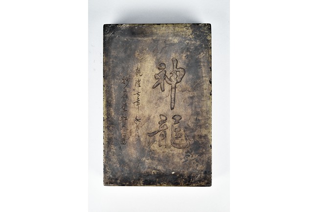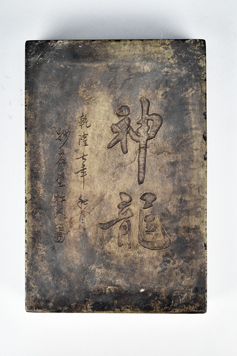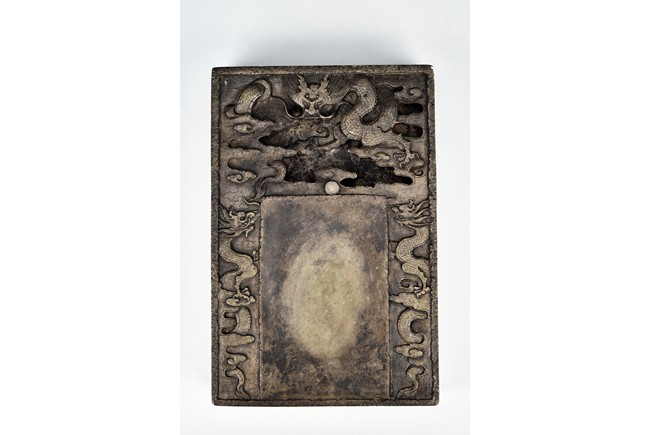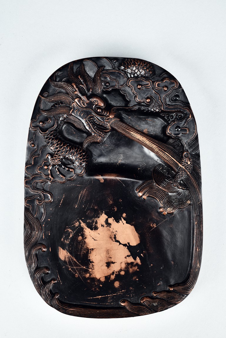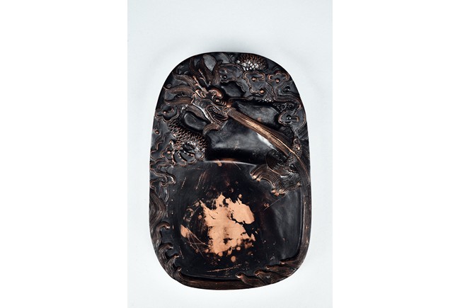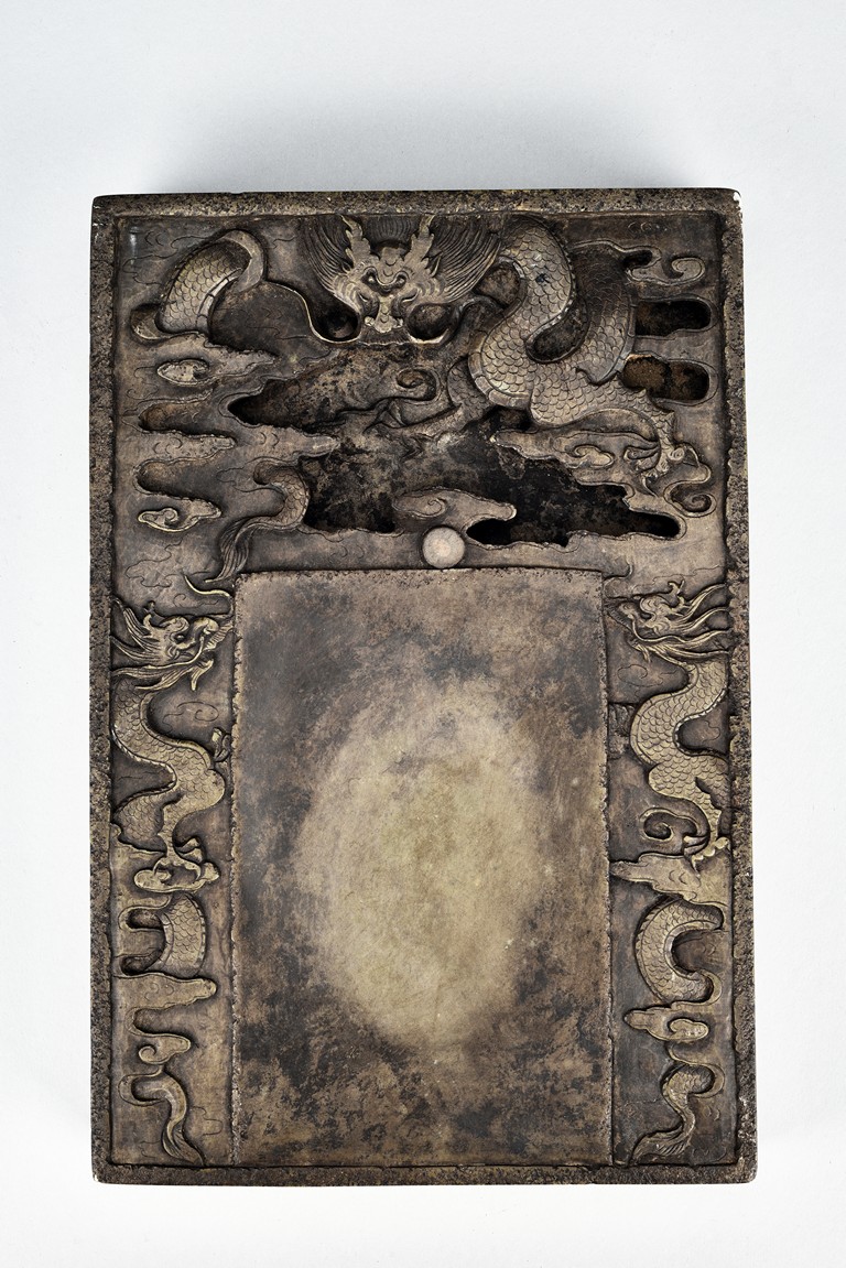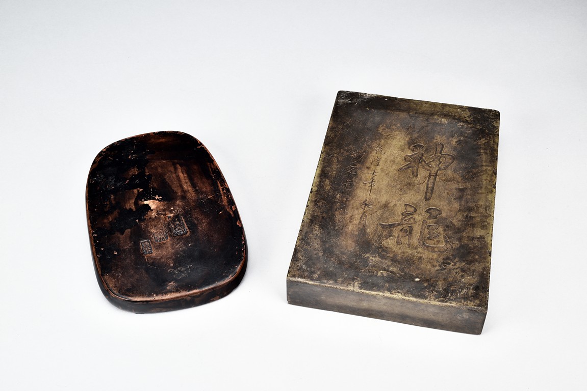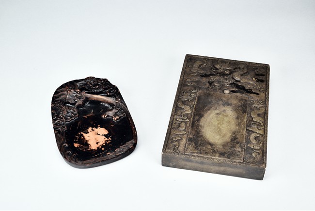 Comprising of two ink stone with carved dragon design in relief.