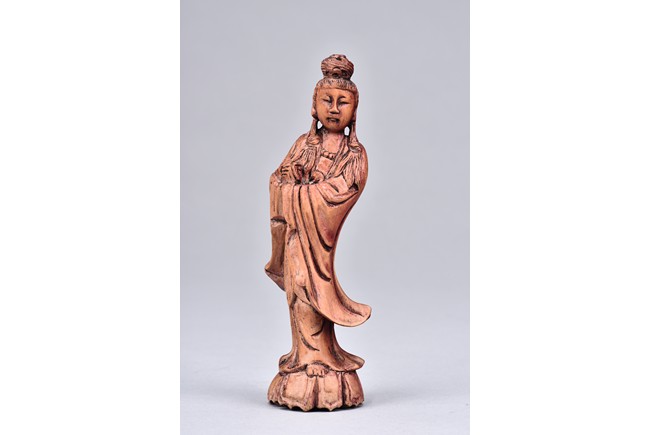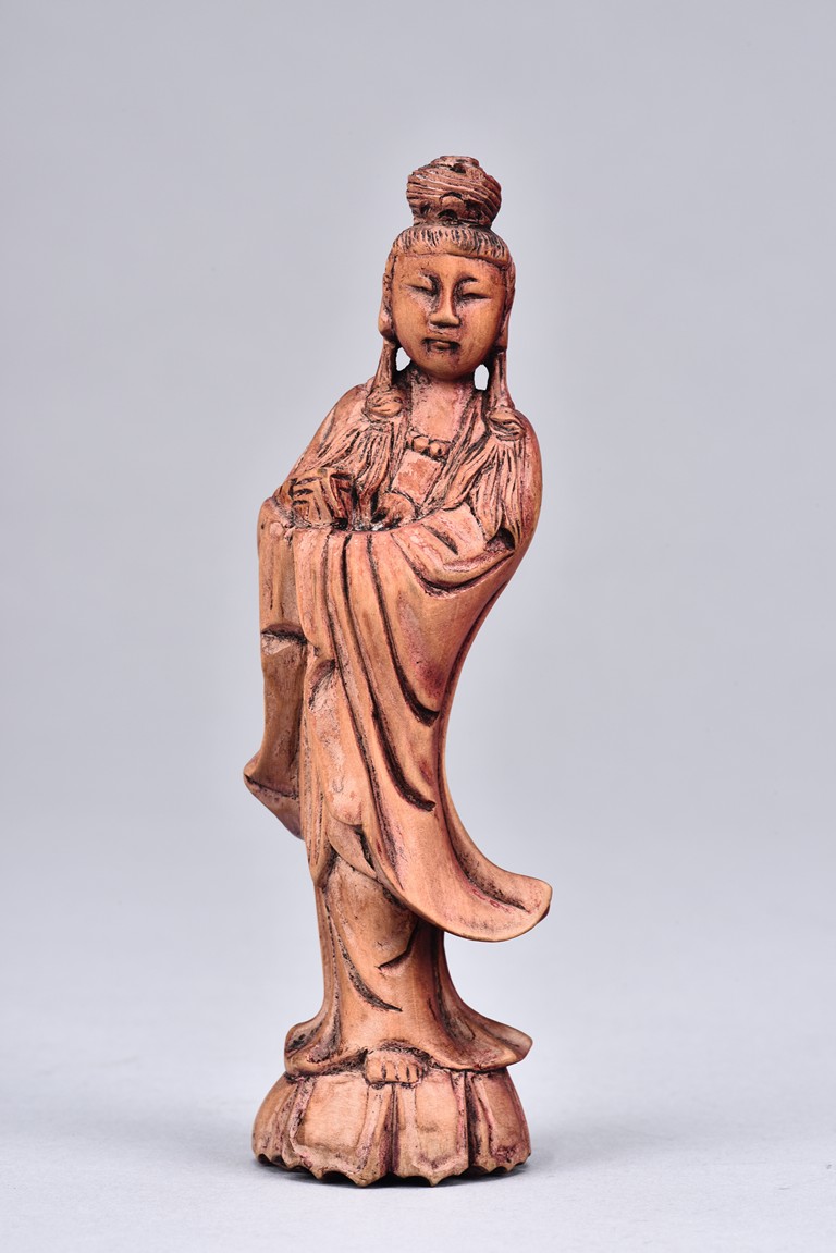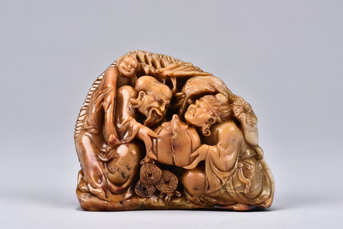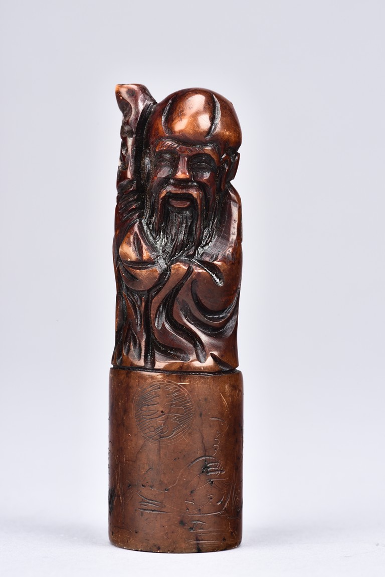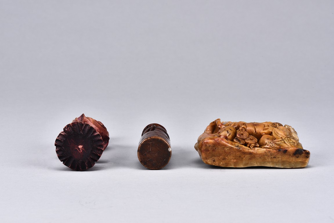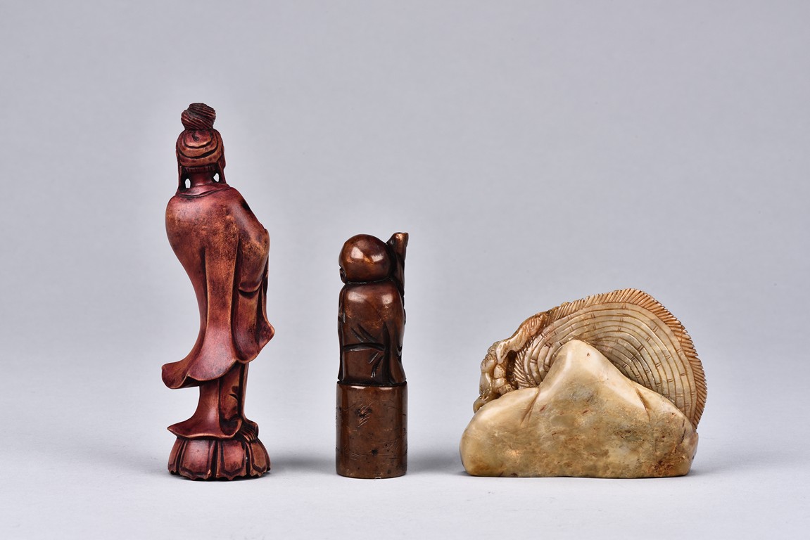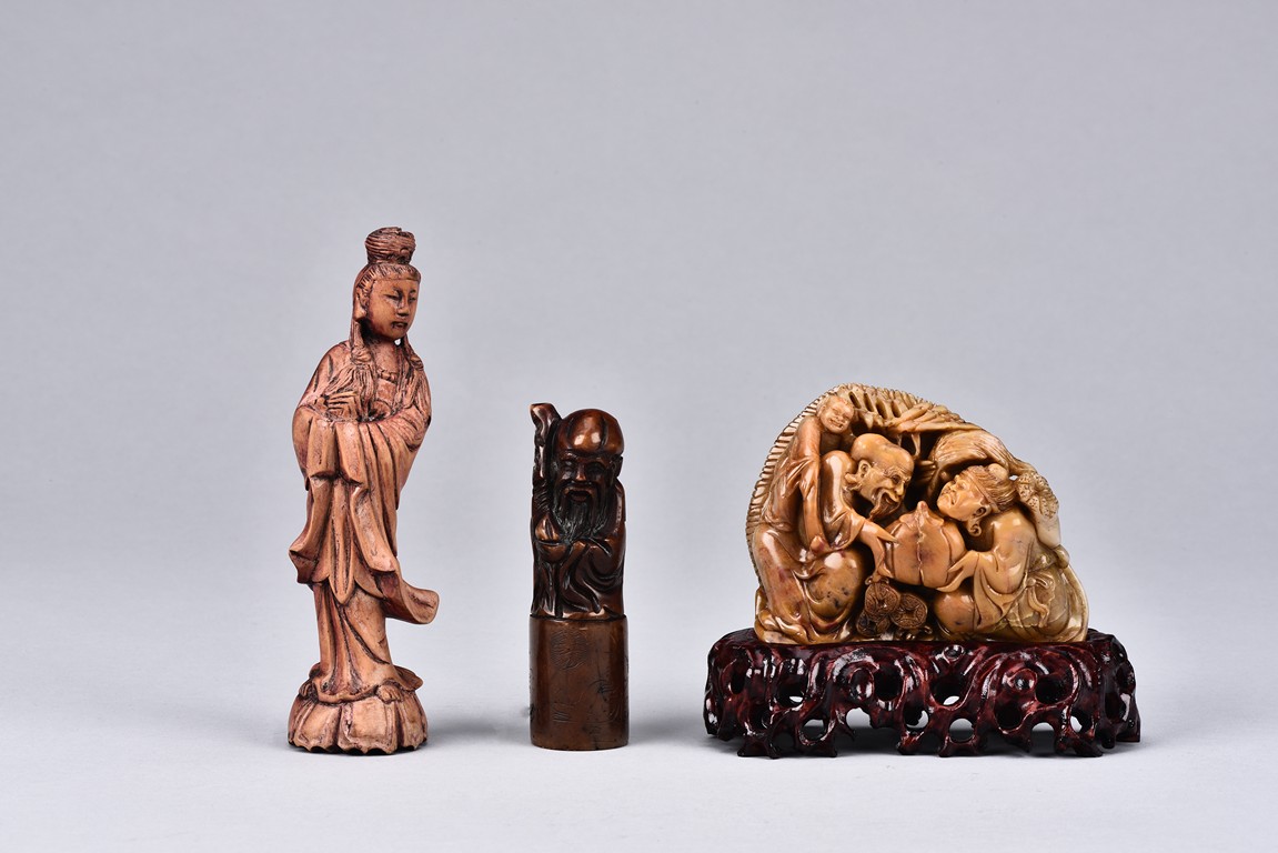 A SET OF SOAPSTONE CARVINGS 木雕觀音擺件,石雕壽星印章,石雕擺件 帶座